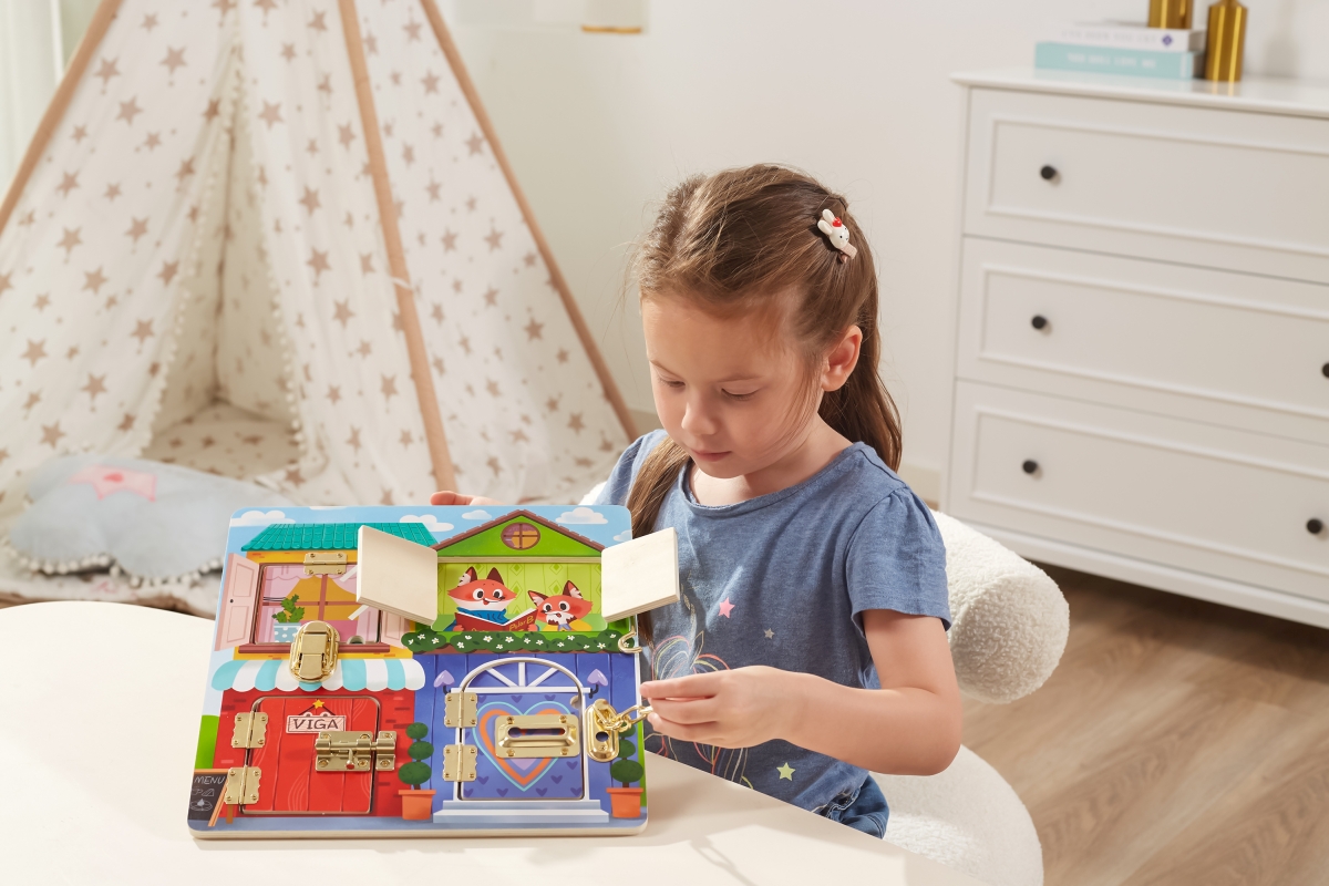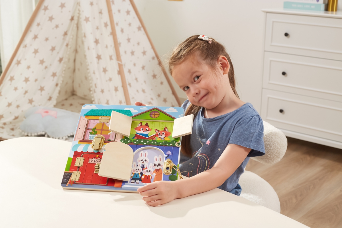 Sada různých typů zámků zakomponovaná do dřevěného domu, je určená pro malé dětské prstíky, které na nich mohou potrénovat svoji obratnost. Přednosti..