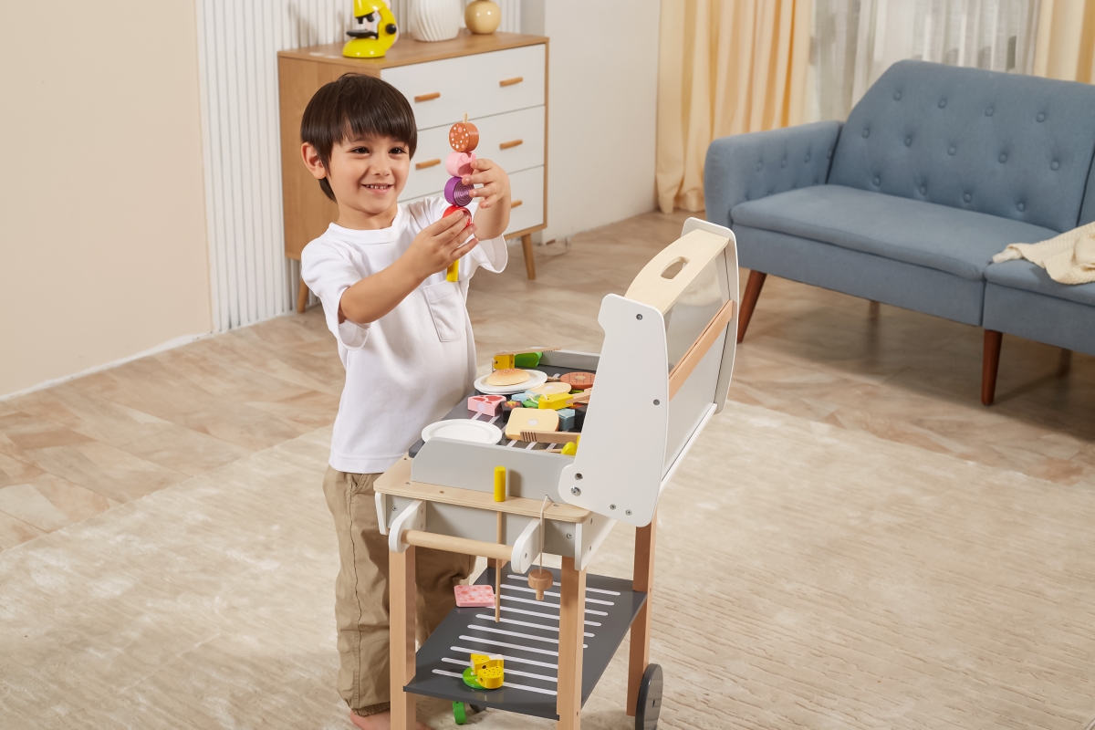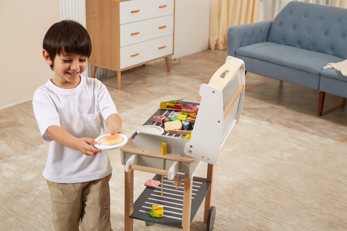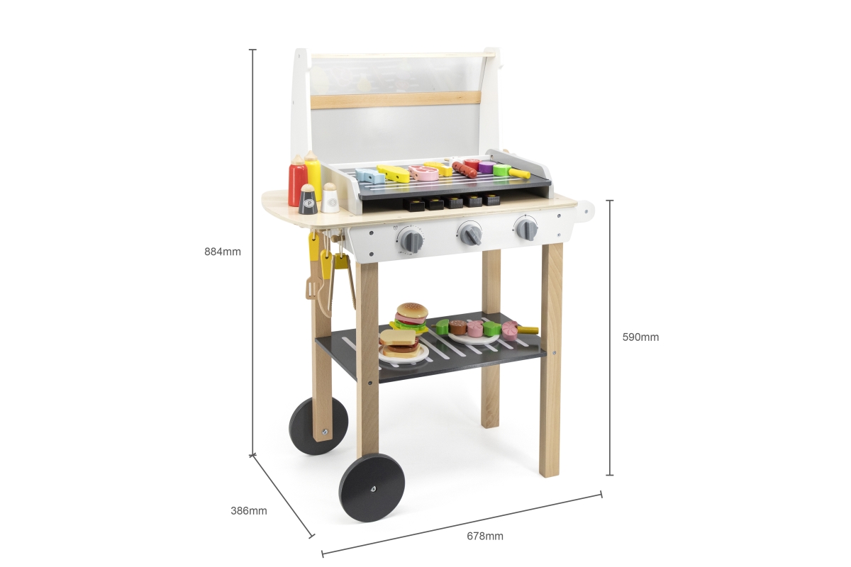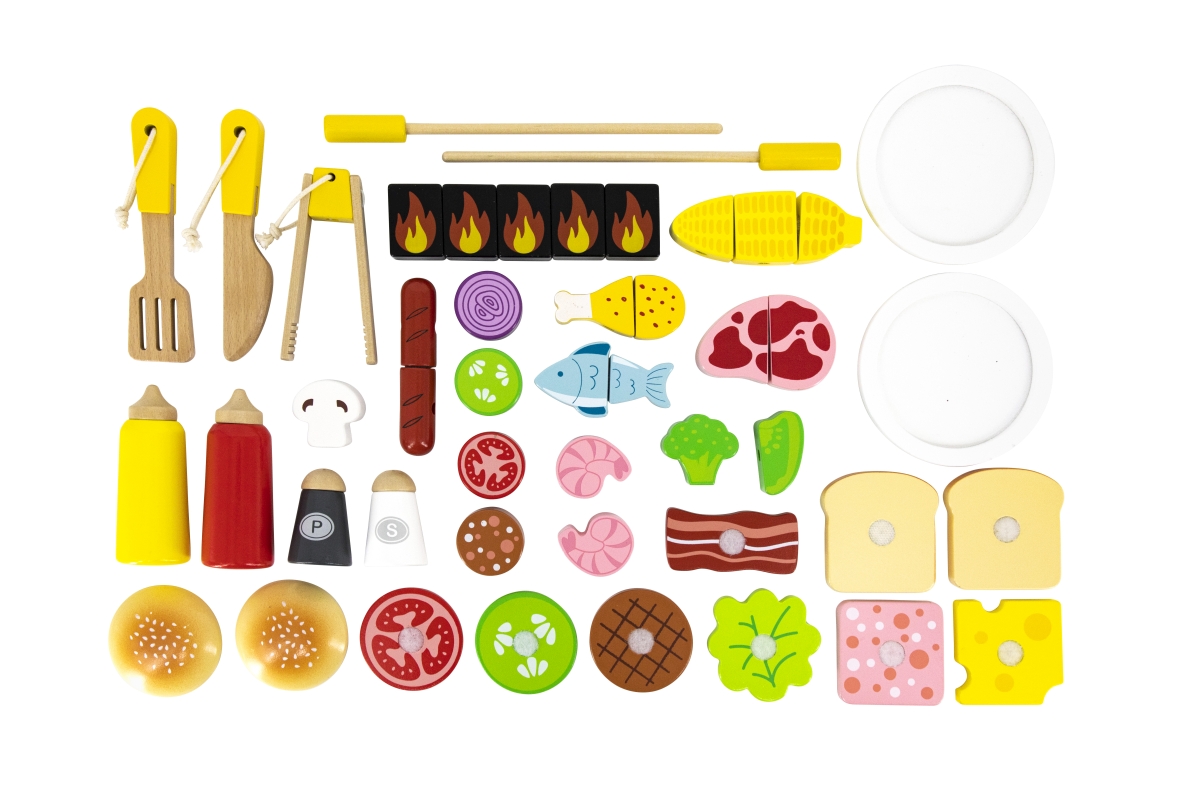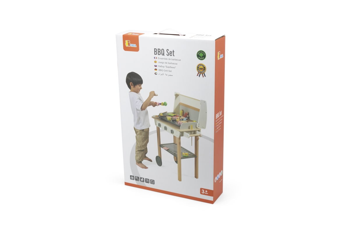 Dřevěný gril s doplňky. Balení obsahuje gril o velikosti cca 88,4 x 67,8 x 38,6 cm, jídlo, náčinní ke grilu a další doplňky. Rozměry balení cca 41 x 6..