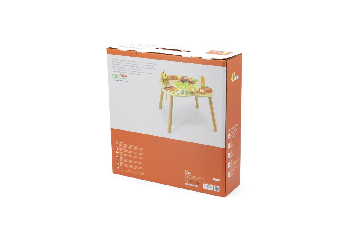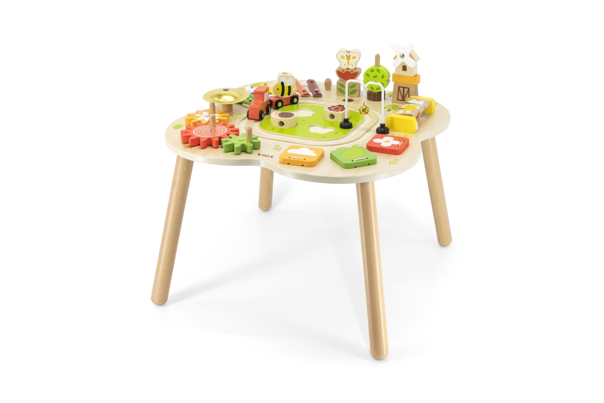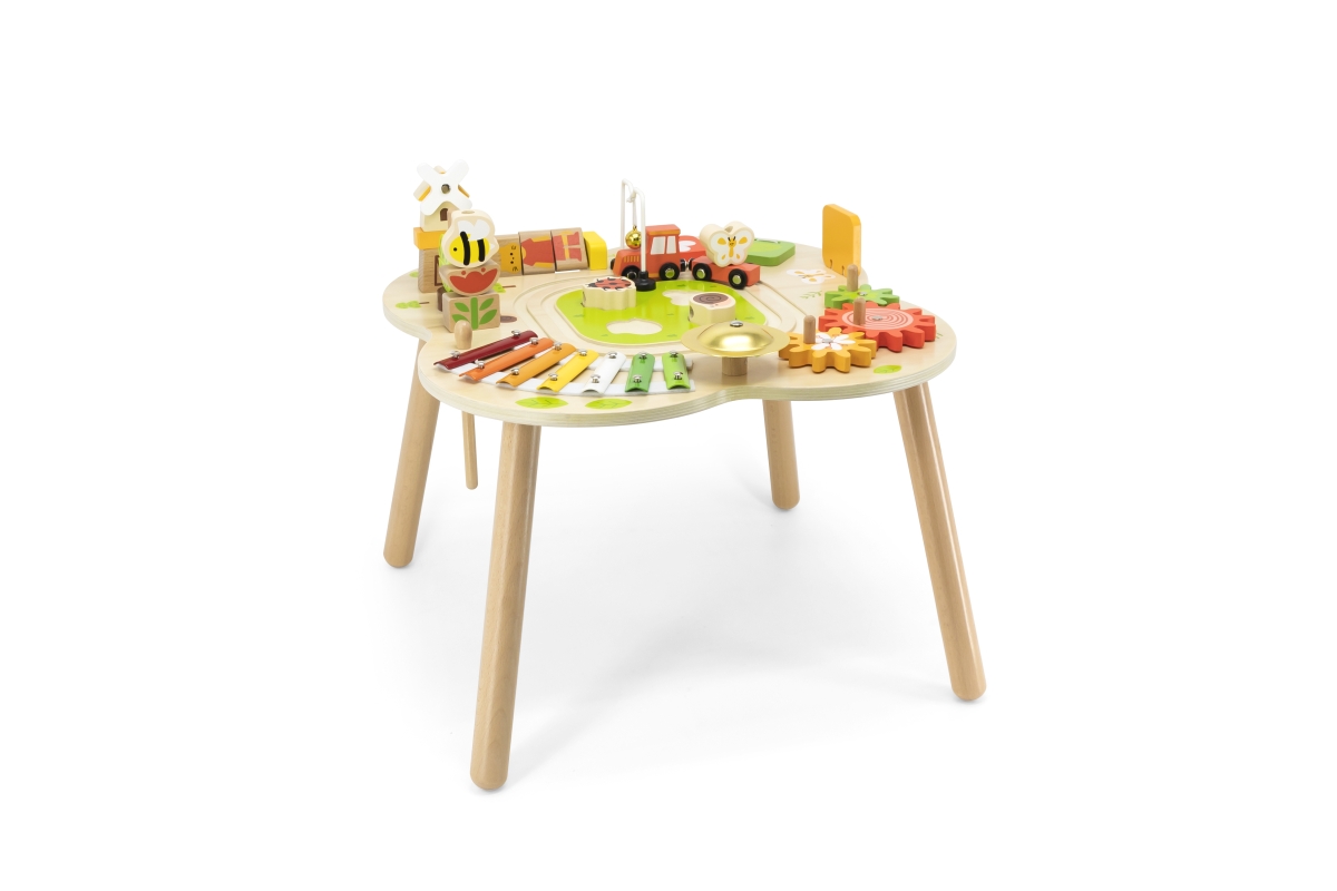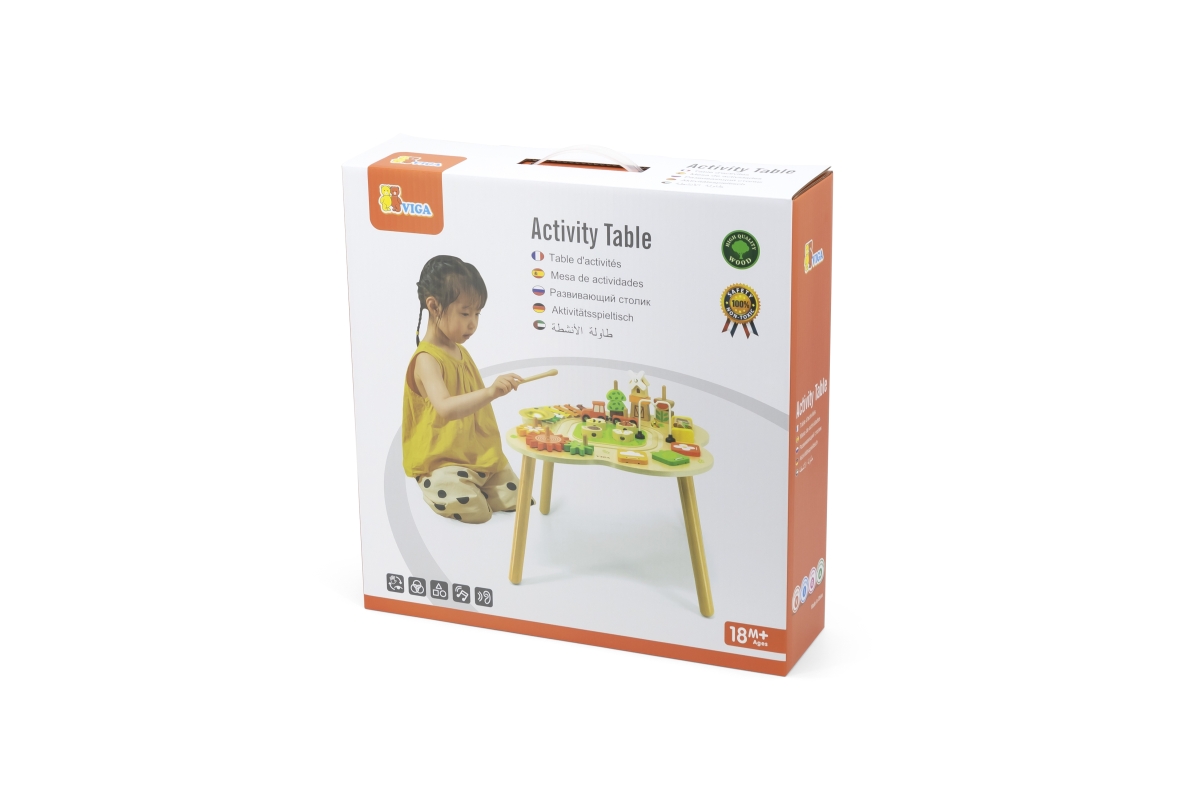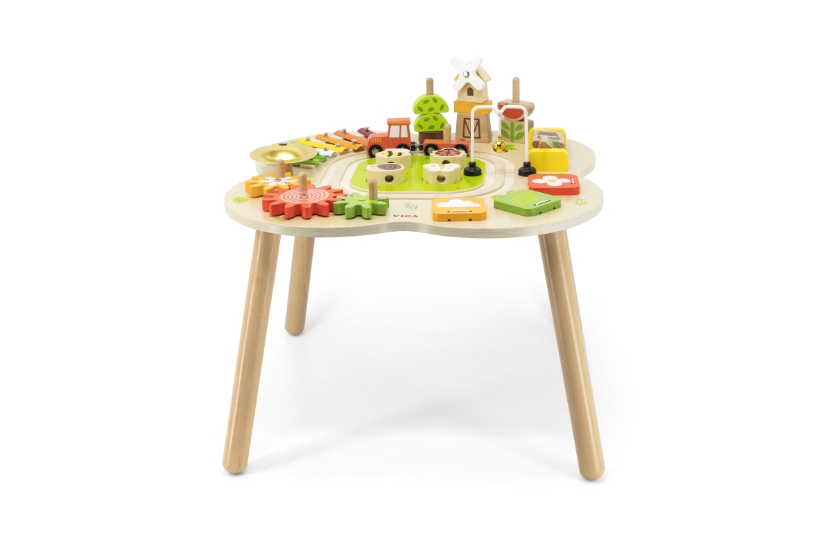 Dřevěný stoleček s aktivitami. Stoleček má ozubená kolečka, xylofon, vláčkodráhu a další. Rozměry stolečku cca 45 x 45 x 42,2 cm. Rozměry balení cca 4..