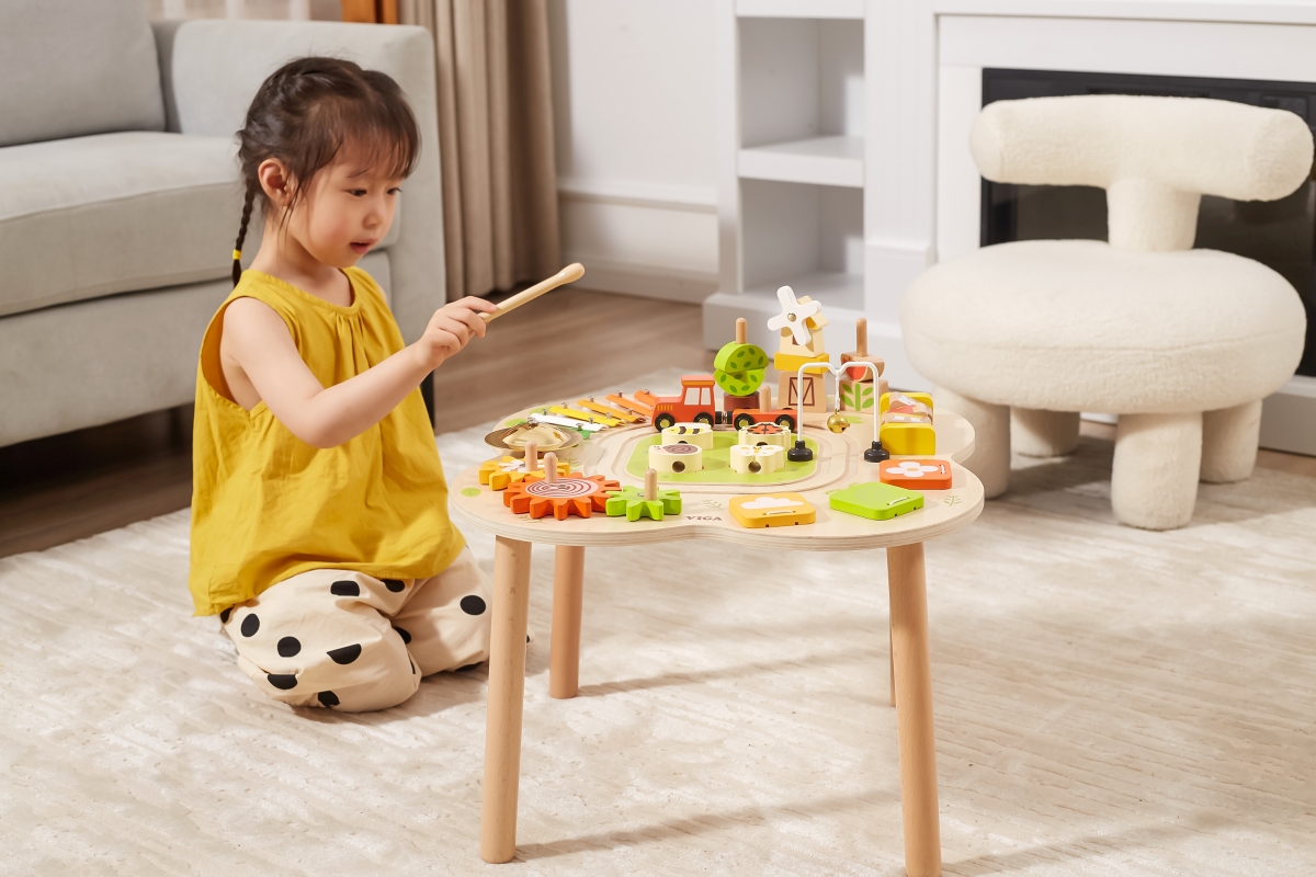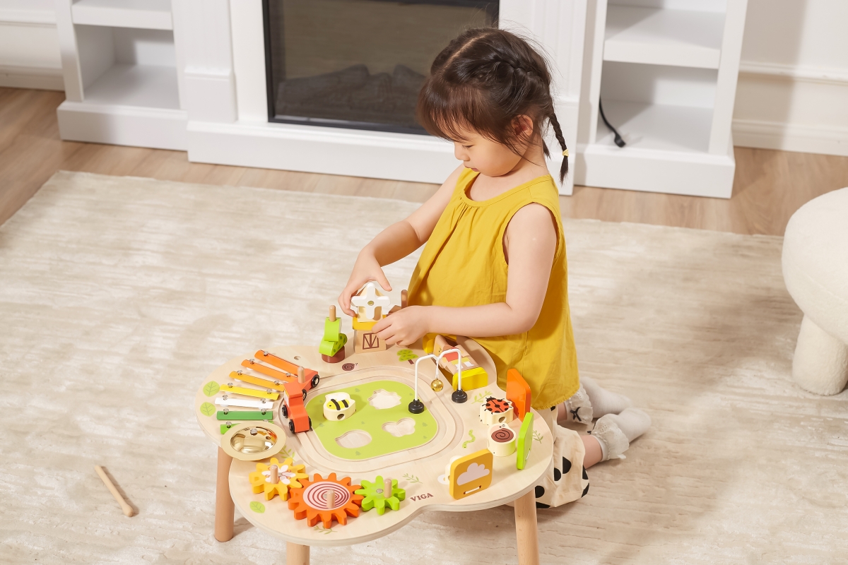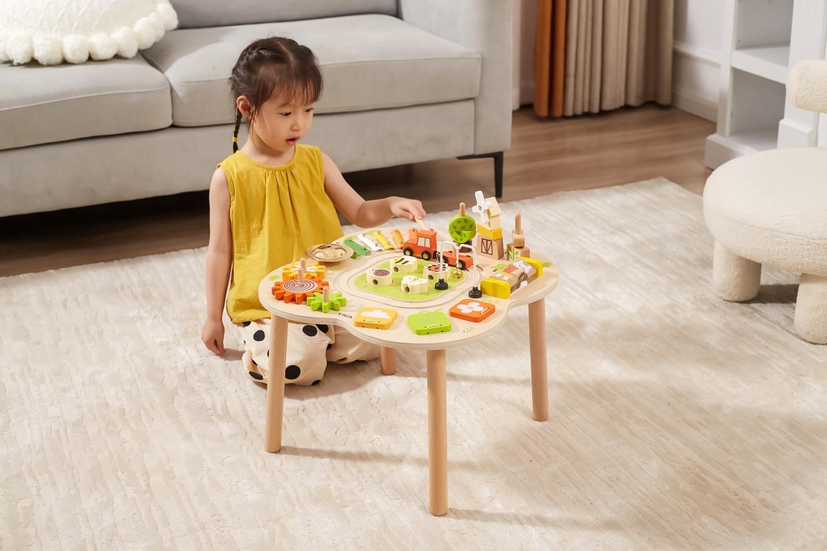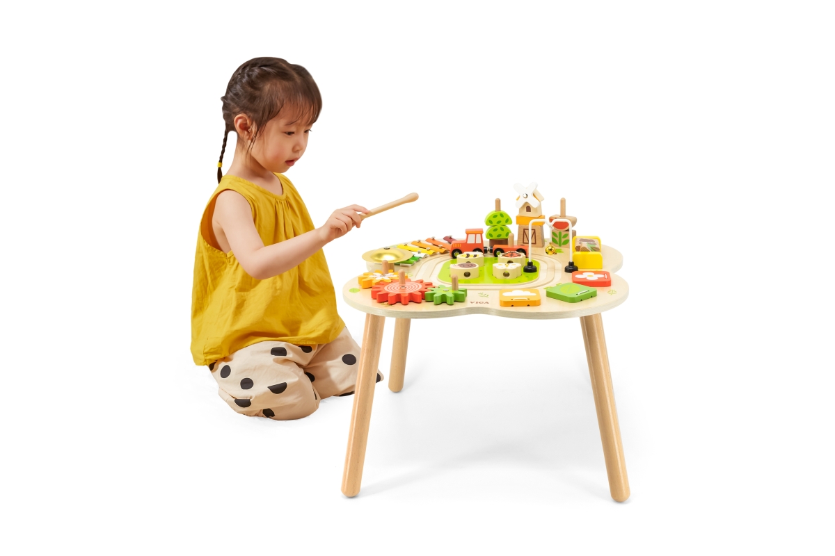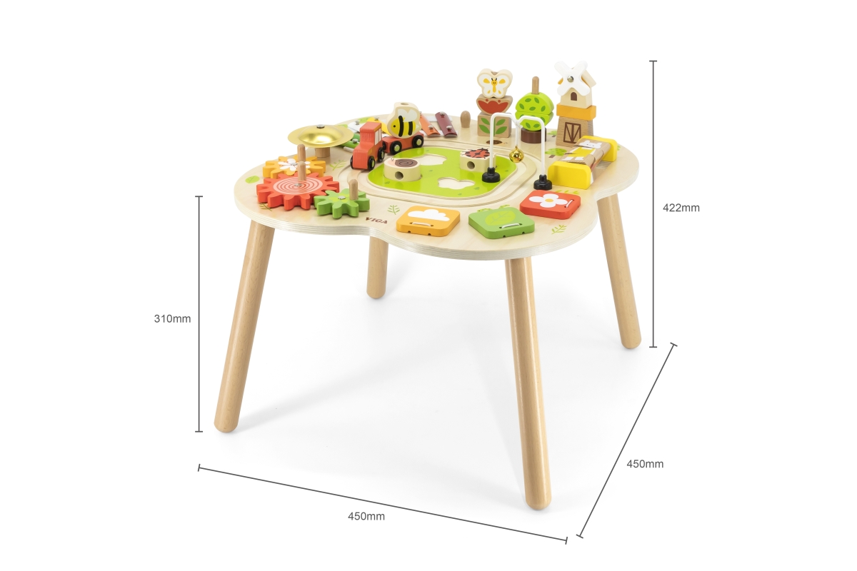 Dřevěný stoleček s aktivitami. Stoleček má ozubená kolečka, xylofon, vláčkodráhu a další. Rozměry stolečku cca 45 x 45 x 42,2 cm. Rozměry balení cca 4..