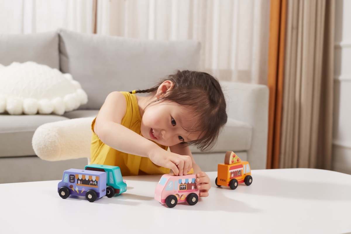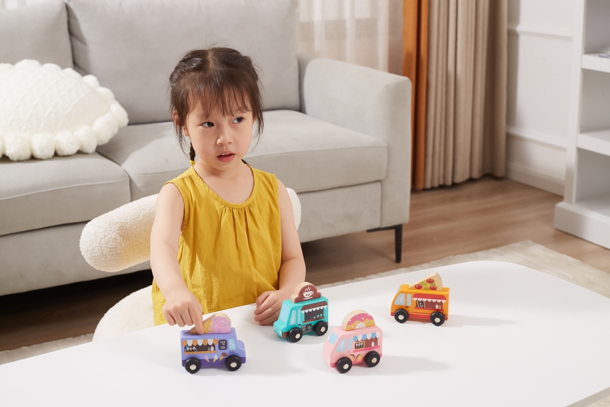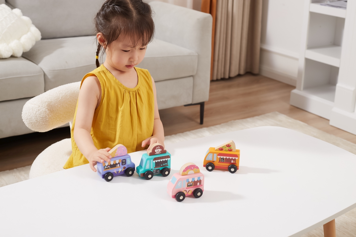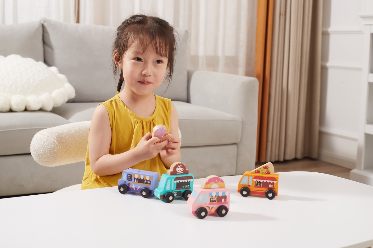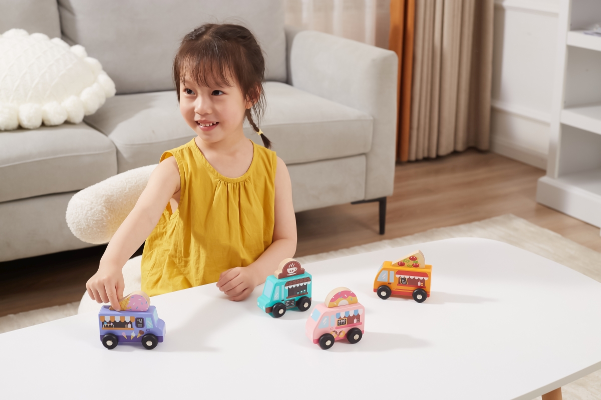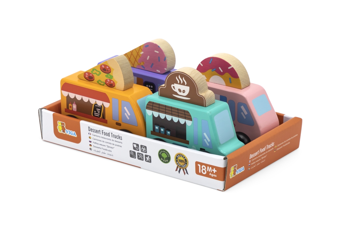 Dřevěná potravinová auta. Balení obsahuje 4 auta - každé o velikosti cca 10 x 8,5 cm. Rozměry balení cca 21 x 9,5 x 12 cm. Věk 18m+..