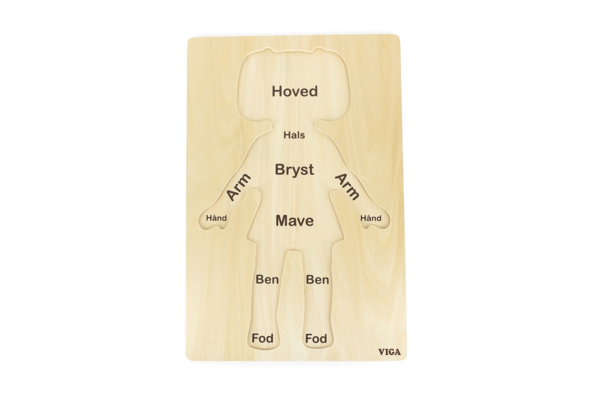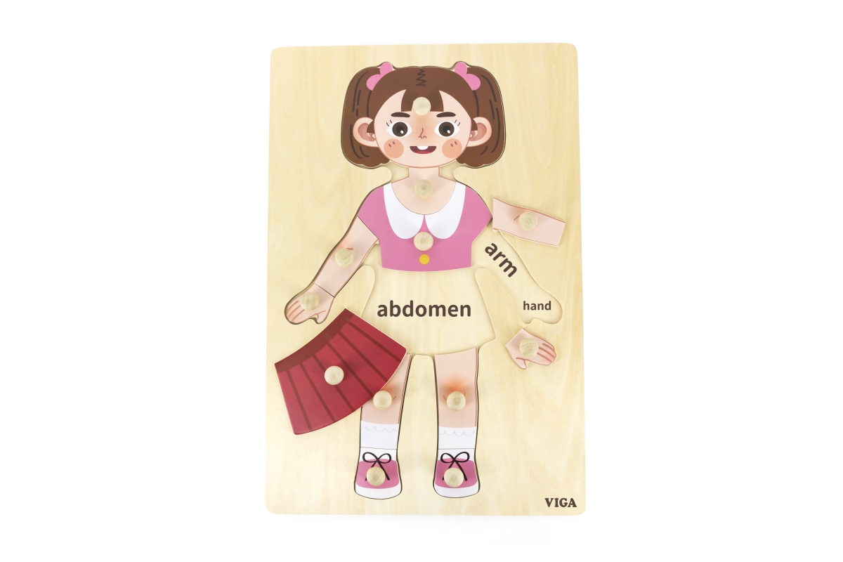 Krásná dřevěná vkládačka-dívka. Děti se naučí zručnosti a zároveň části lidského těla. Vkládačka má 12 dílků. Rozměry 30x45x0,5 cm. Věk 18m+..