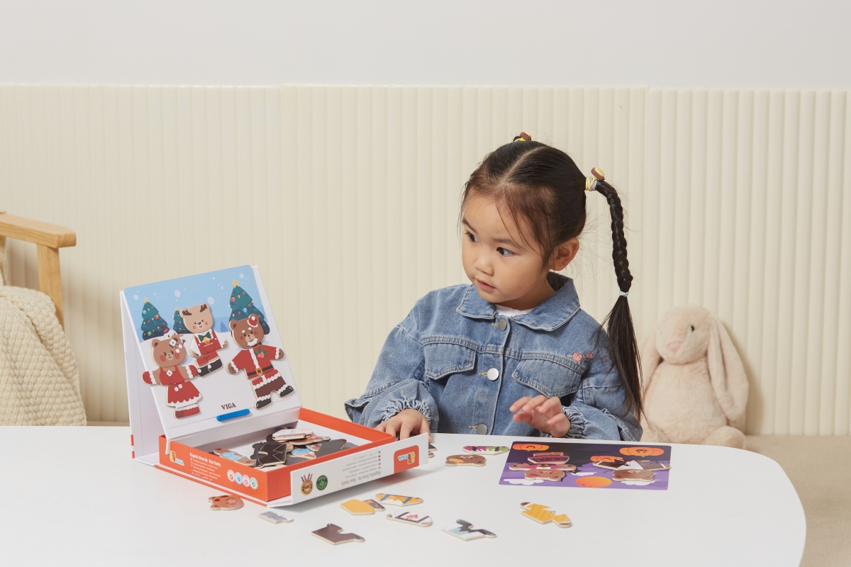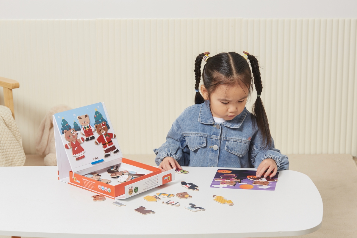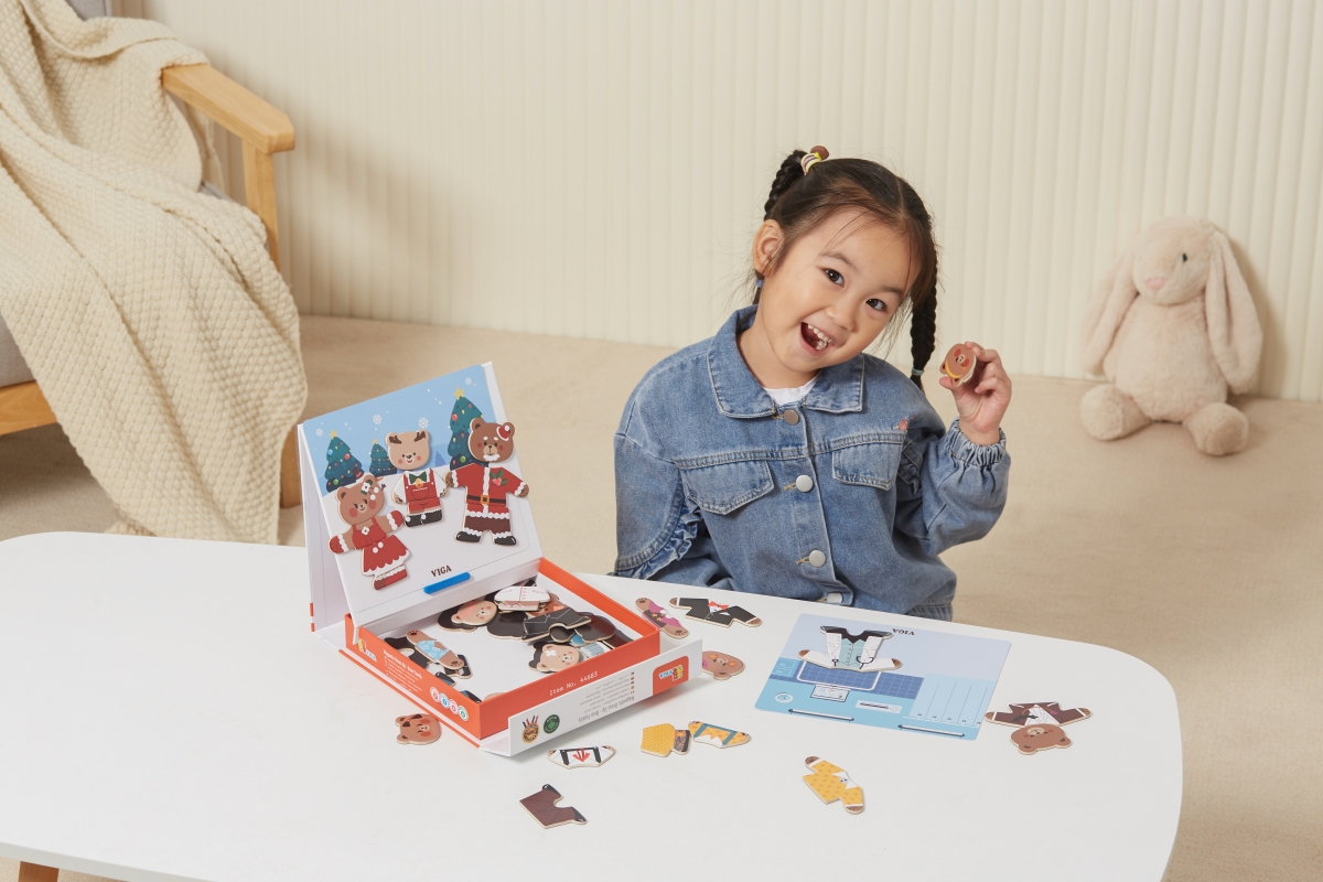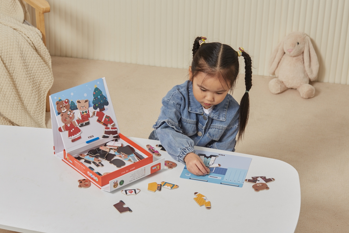 Dřevěné magnetixké oblékání. Sada obsahuje 54 dílků. Rozměry balení cca 21,5x21,5x4,5 cm. Věk 3+..