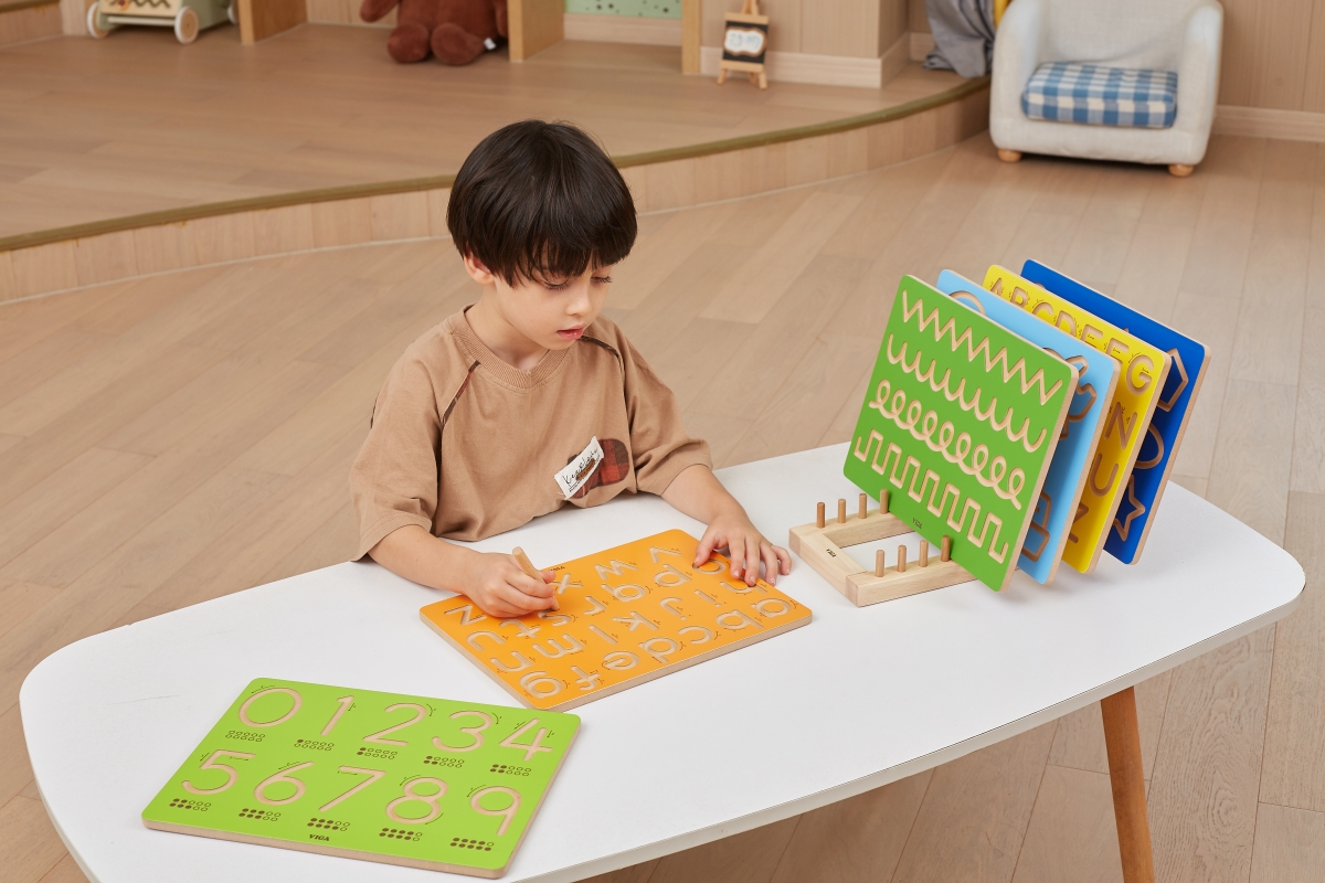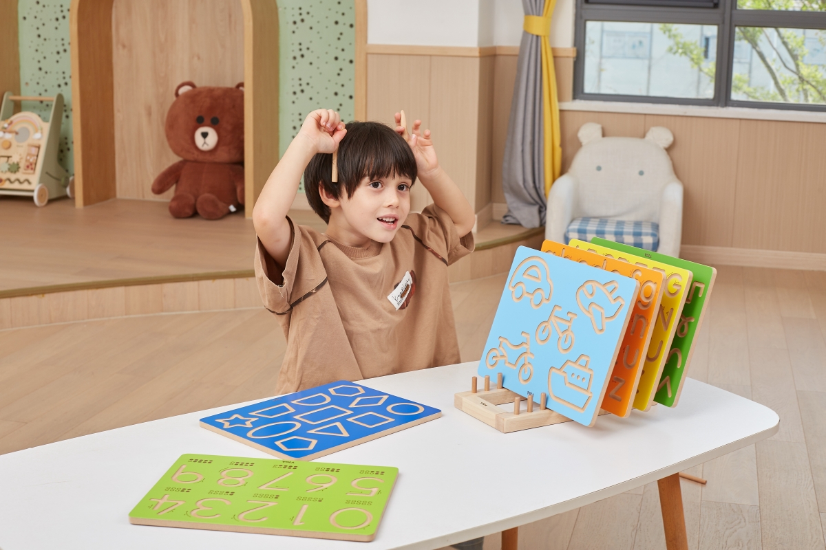 Dřevěná tabulka s vyznačenými rysy. Děti se mohou učit uvolňování rukou pomocí vyznačených rysů. Součástí balení je dřevěná tužka-ukazovátko. Rozměry ..