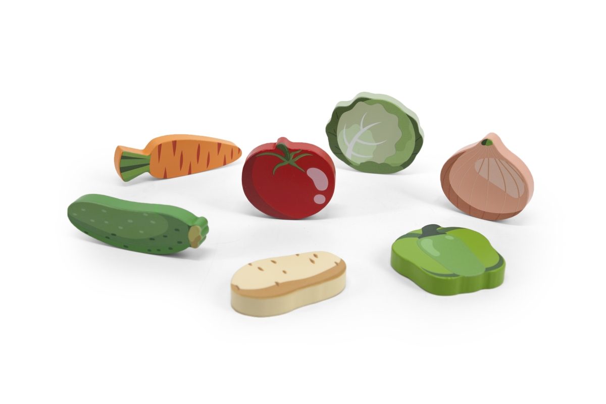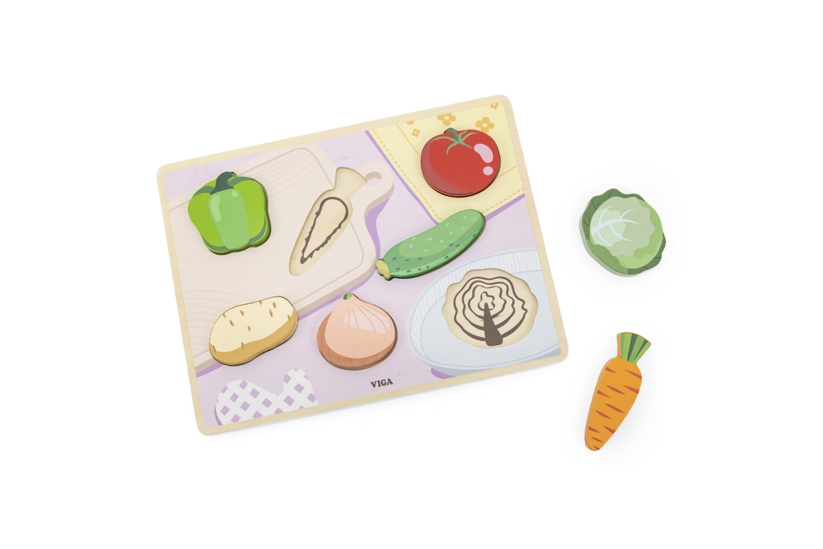 Dřevěná vkládačka se zeleninou. Rozměry dřevěné desky cca 30 x 22,5 cm. Rozměry balení cca 30 x 25 x 2 cm. Věk 18m+..