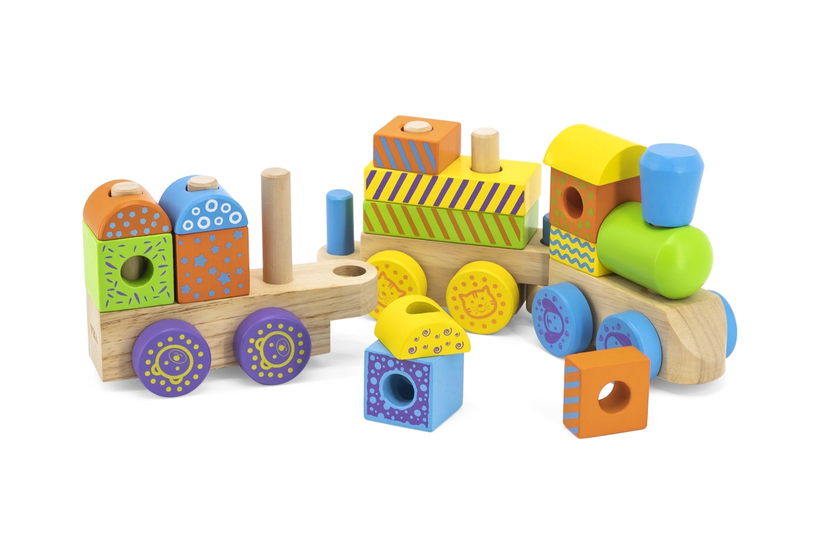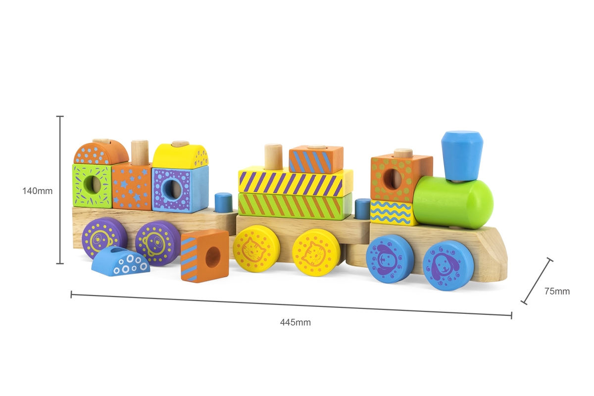 Dřevěný vláček. Balení obsahuje kostky různých tvarů a barev pro rozvoj dětské kreativity a zručnosti. Rozměry vláčku 45x14x8 cm. Rozměry balení 47x15..