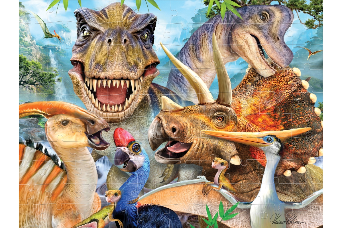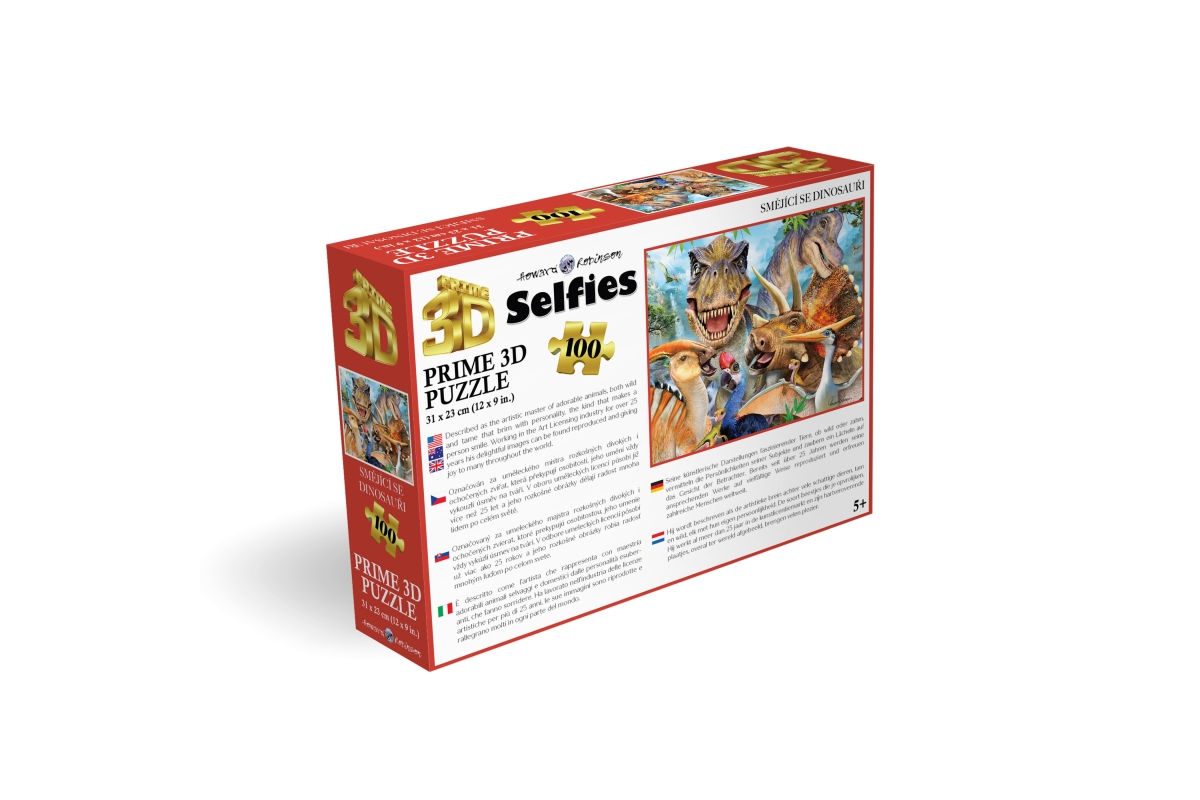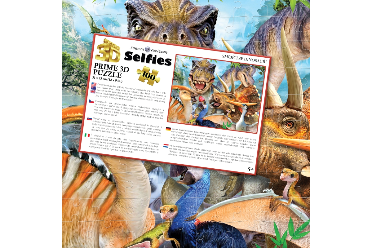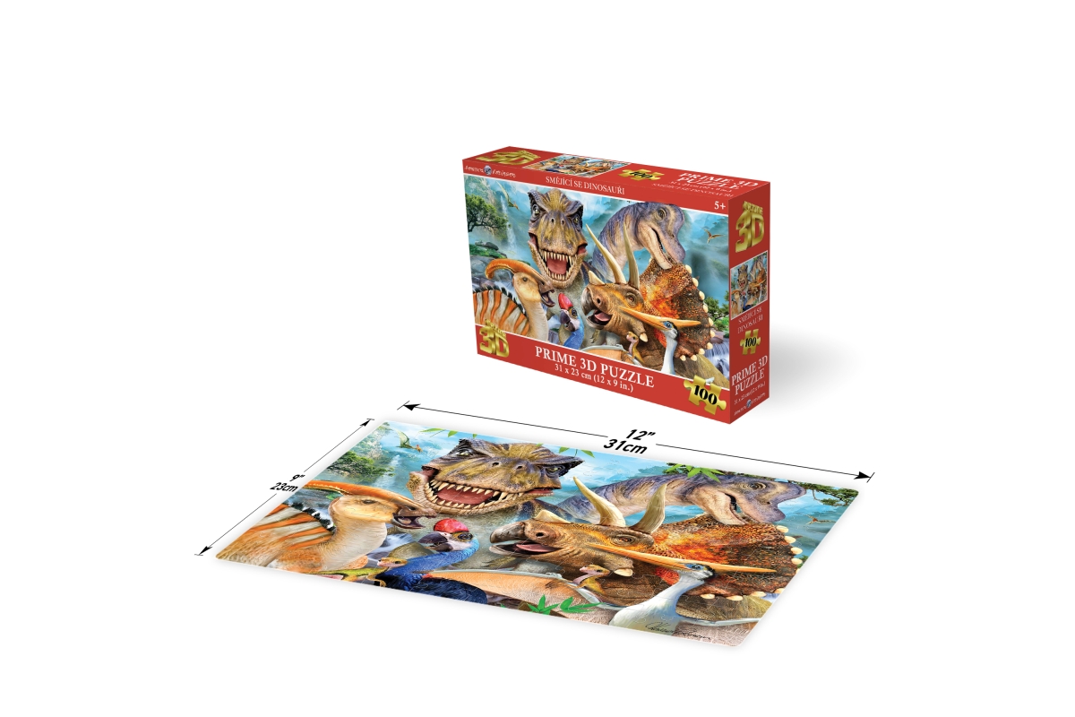 3D puzzle s motivem smějících se dinosaurů. Balení obsahuje 100 dílků. Rozměry balení 23x15x5 cm. Rozměry složeného obrázku 31x23 cm. Věk 5+..