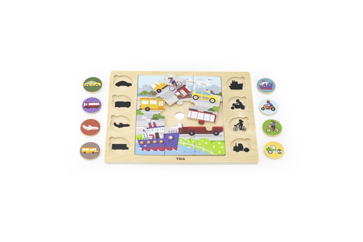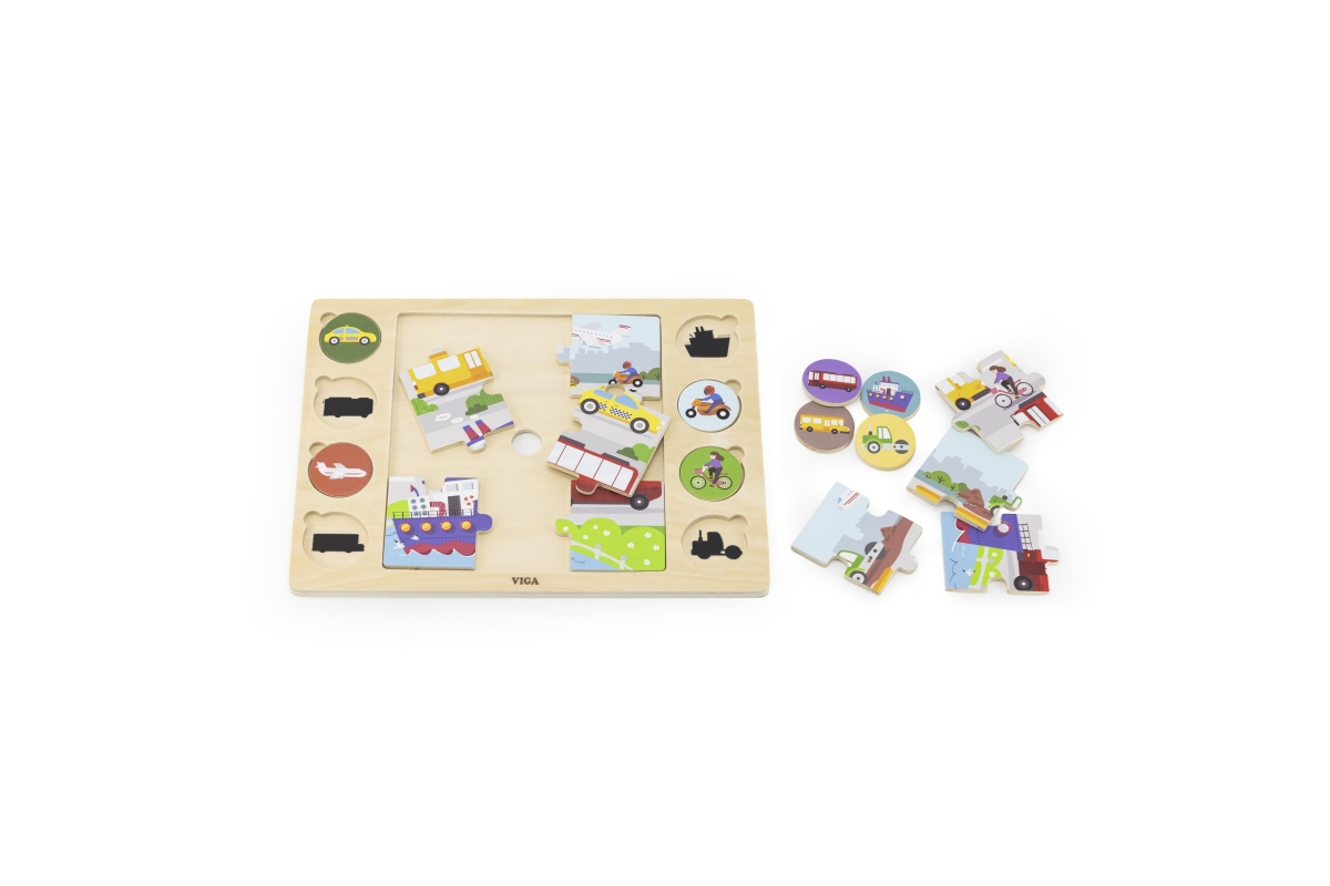 Dřevěné puzzle s motivem dopravy. Obsahuje 9 dílků+8 kulatých žetonů. Rozměry desky 30x22x0,5 cm. Věk 18m+..