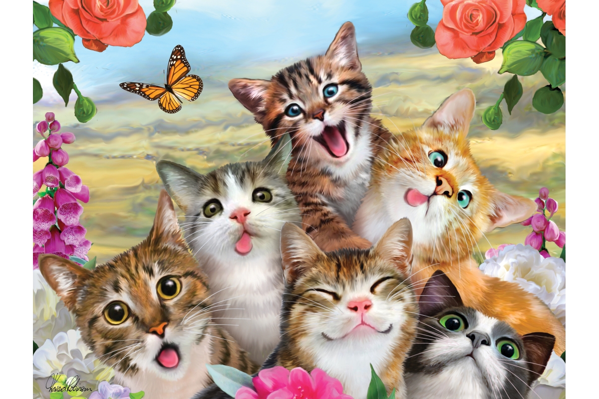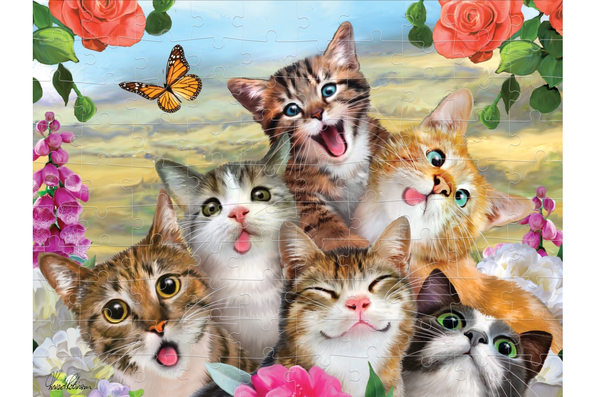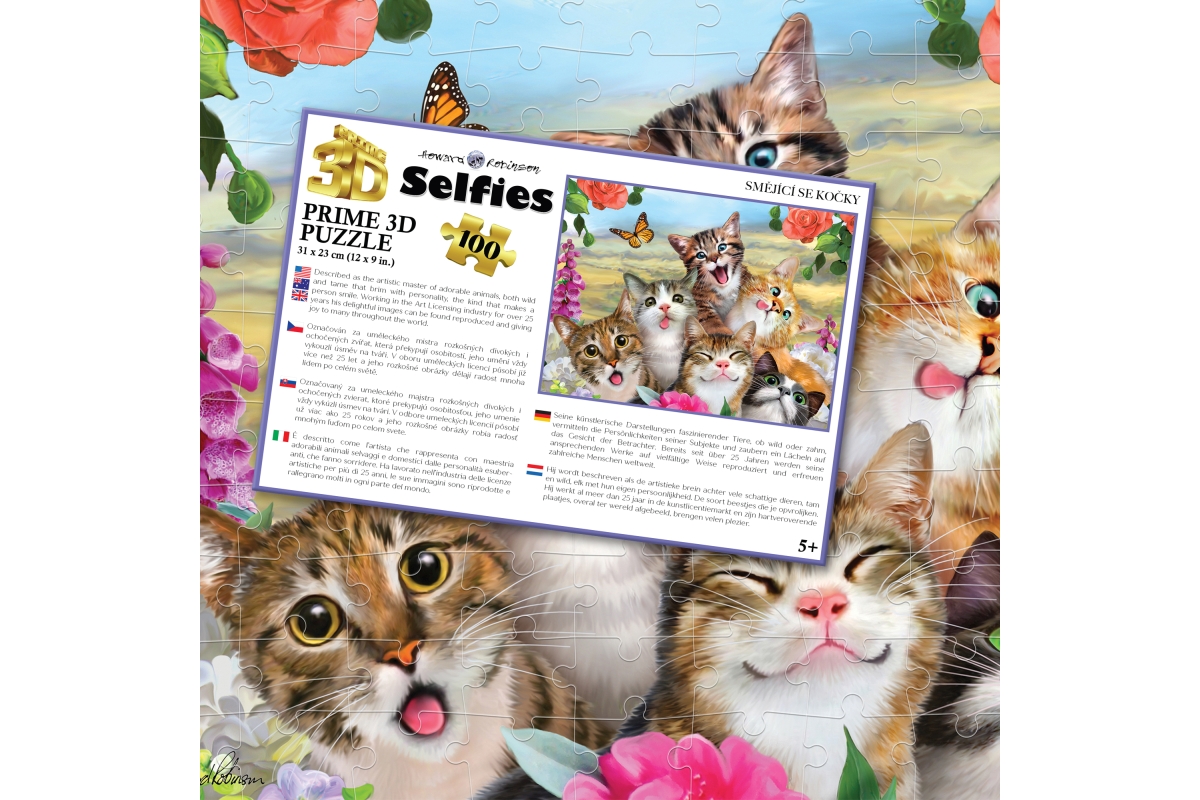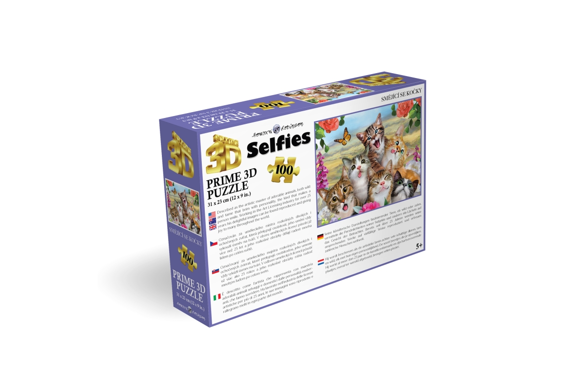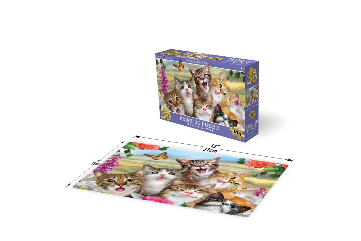 3D puzzle s motivem smějících se koček. Balení obsahuje 100 dílků. Rozměry balení 23x15x5 cm. Rozměry složeného obrázku 31x23 cm. Věk 5+..