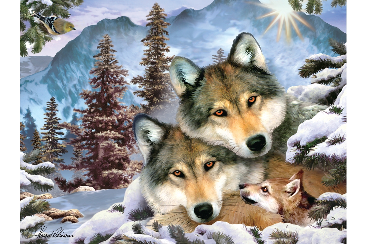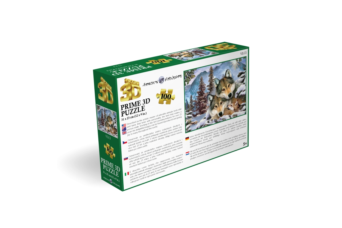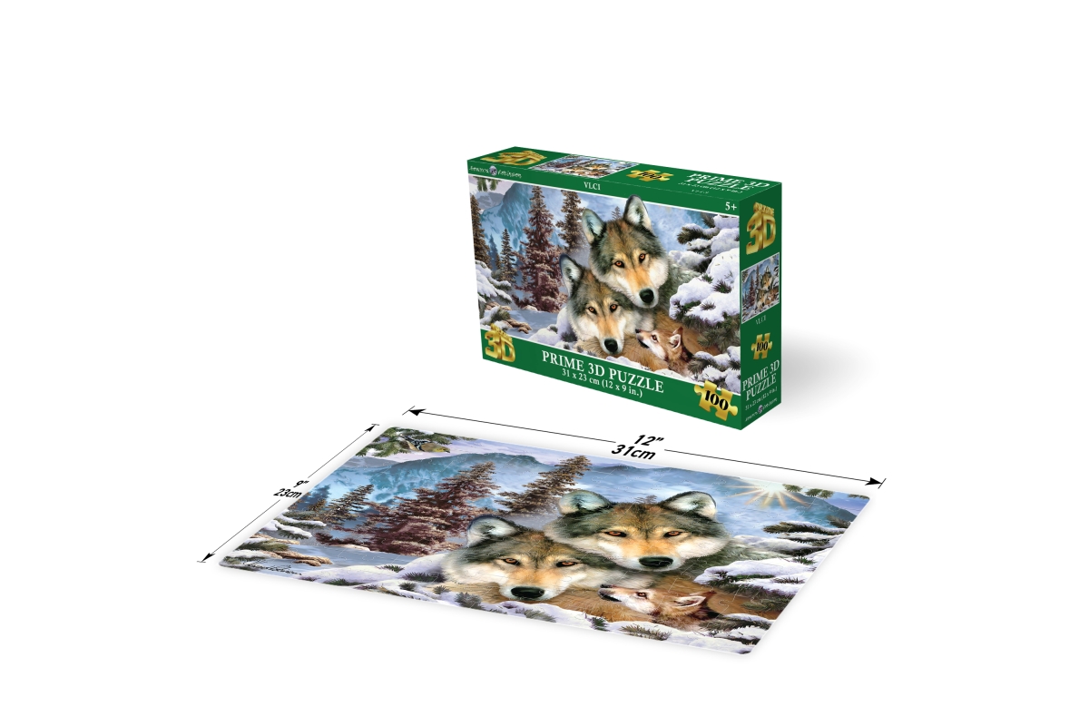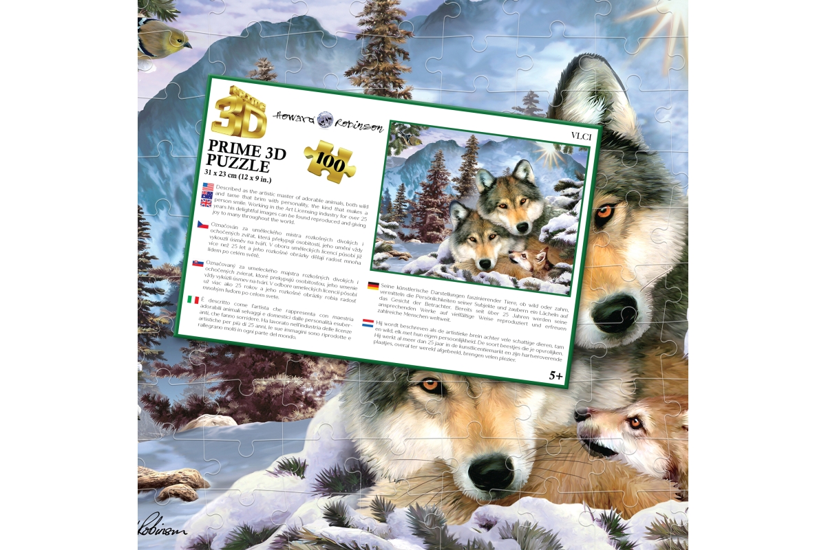 3D puzzle s motivem vlků. Balení obsahuje 100 dílků. Rozměry balení 23x15x5 cm. Rozměry složeného obrázku 31x23 cm. Věk 5+..