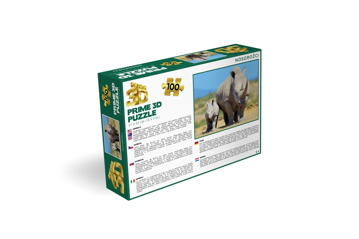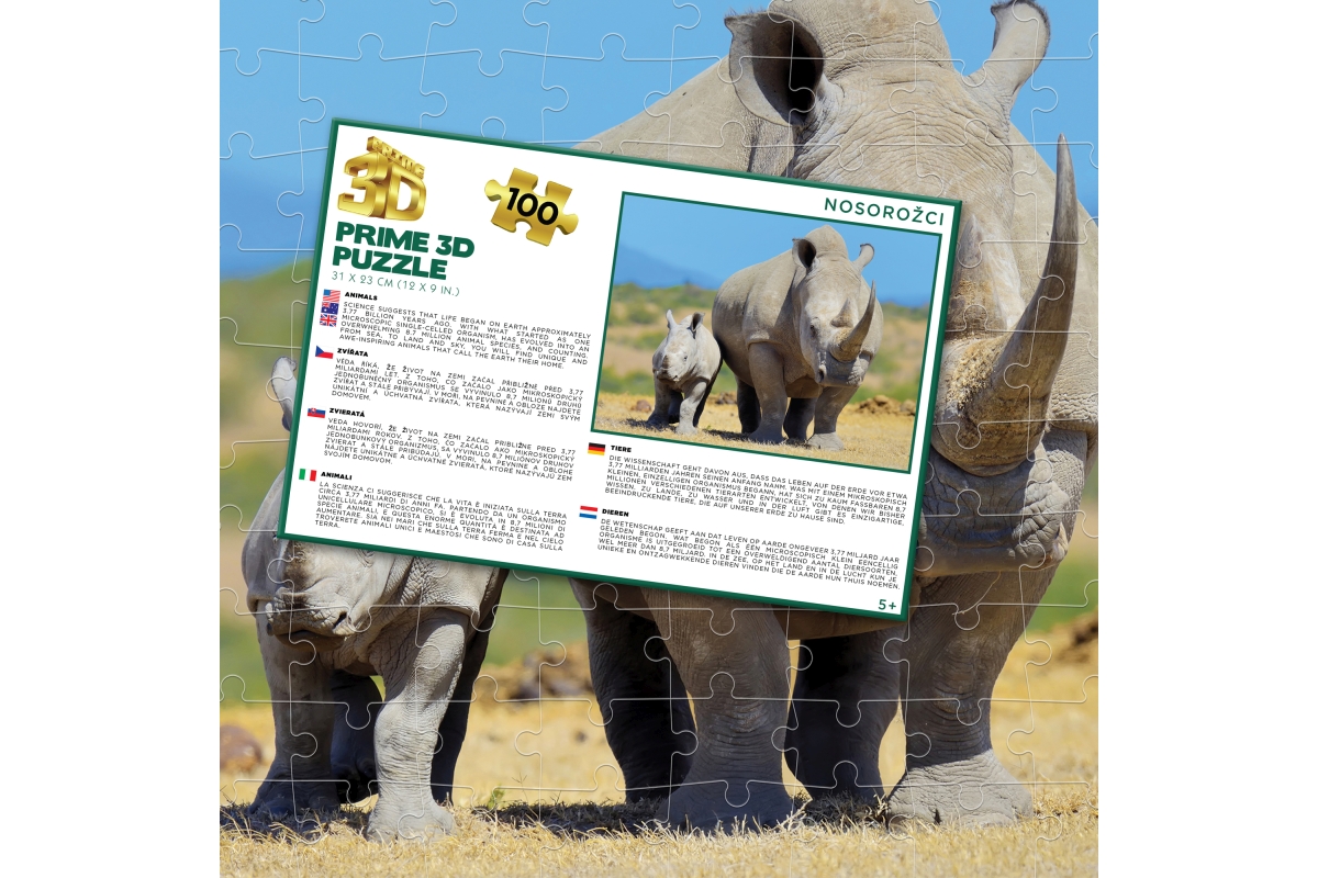3D puzzle s motivem nosorožců. Balení obsahuje 100 dílků. Rozměry balení 23x15x5 cm. Rozměry složeného obrázku 31x23 cm. Věk 5+..