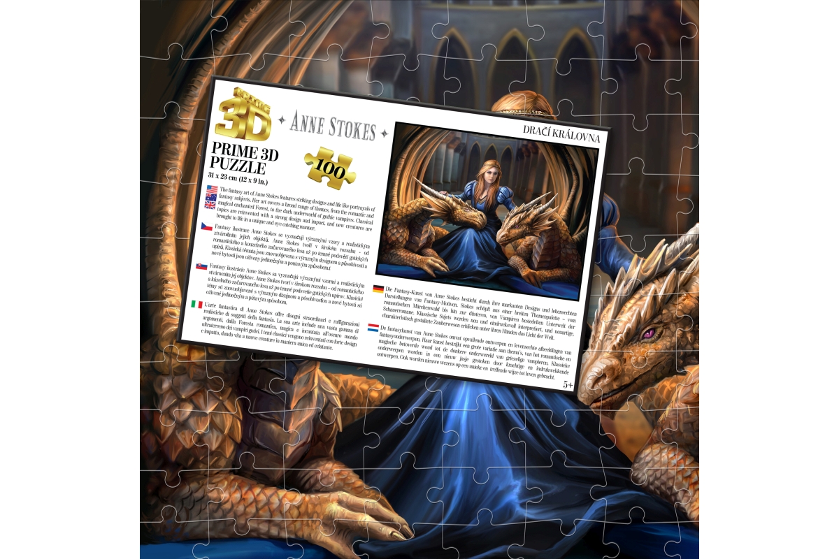 3D puzzle s motivem dračí královna. Balení obsahuje 100 dílků. Rozměry balení 23x15x5 cm. Rozměry složeného obrázku 31x23 cm. Věk 5+..