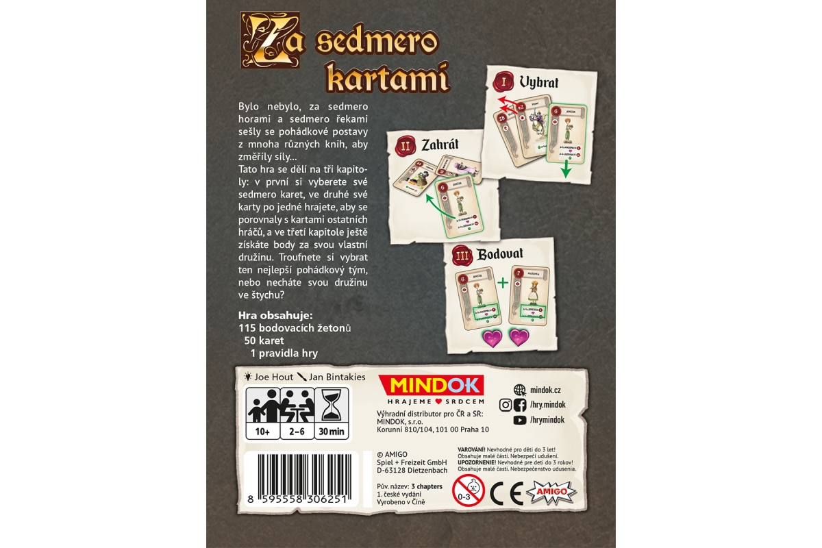 Za sedmero kartami je karetní hra, ve které se hráči ponoří do světa pohádkových postav a snaží se sestavit co nejlepší kombinaci karet, aby získali vítězné body. Hra kombinuje prvky draftování karet, strategického hraní štychů a bodování na základě splněných podmínek.Hra probíhá ve třech kapitolách. V první kapitole si hráči vybírají karty do své ruky, ve druhé kapitole hrají štychovou karetní hru a ve třetí kapitole vyhodnocují své karty a získávají body. Každá karta představuje pohádkovou postavu s unikátními vlastnostmi a schopnostmi, které ovlivňují bodování. Věk 10+