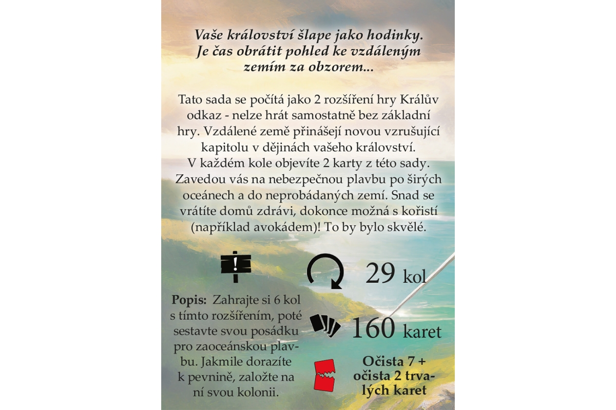 Vaše království šlape jako hodinky. Je čas obrátit pohled ke vzdáleným zemím za obzorem…Tato sada se počítá jako 2 rozšíření hry Králův odkaz – nelze hrát samostatně bez základní hry. Vzdálené země přinášejí novou vzrušující kapitolu v dějinách vašeho království. V každém kole objevíte 2 karty z této sady. Zavedou vás na nebezpečnou plavbu po širých oceánech a do neprobádaných zemí. Snad se vrátíte domů zdrávi, dokonce možná s kořistí (například avokádem)! To by bylo skvělé. Věk 14+