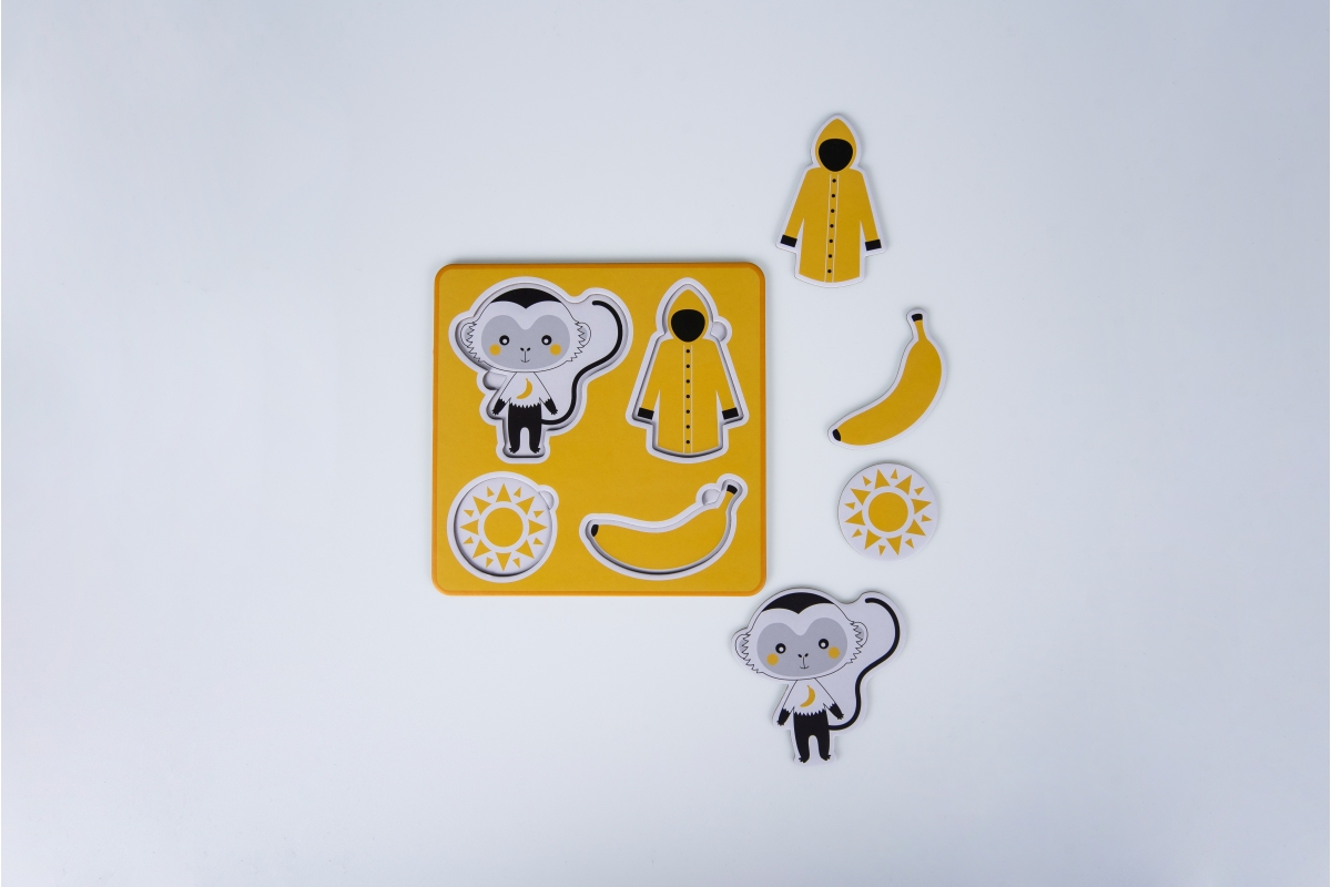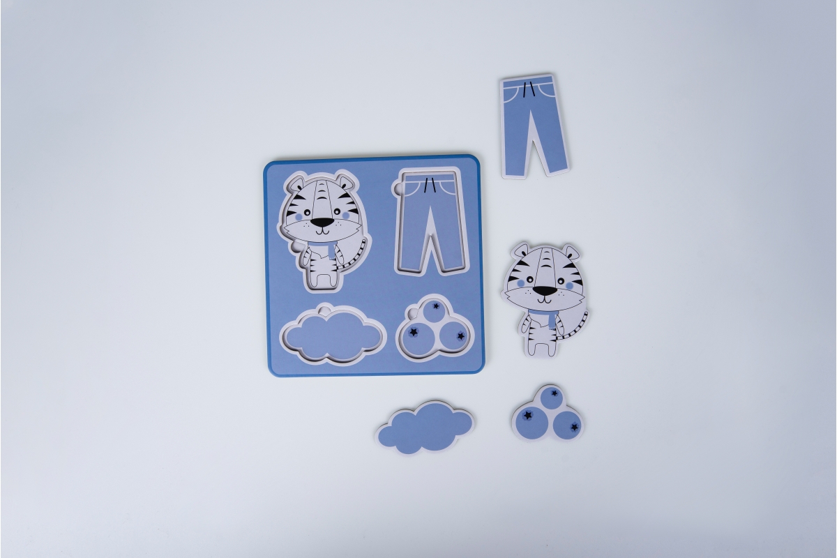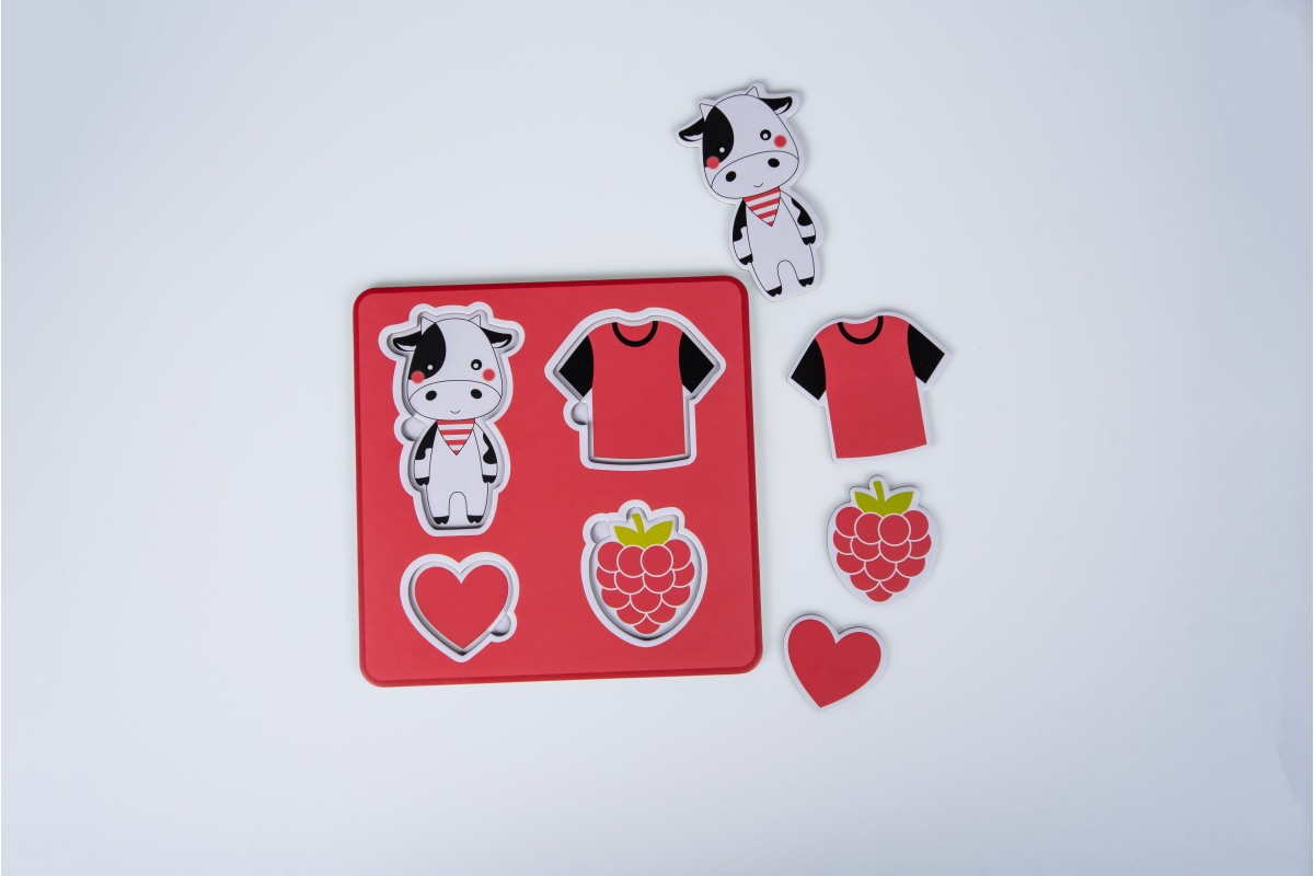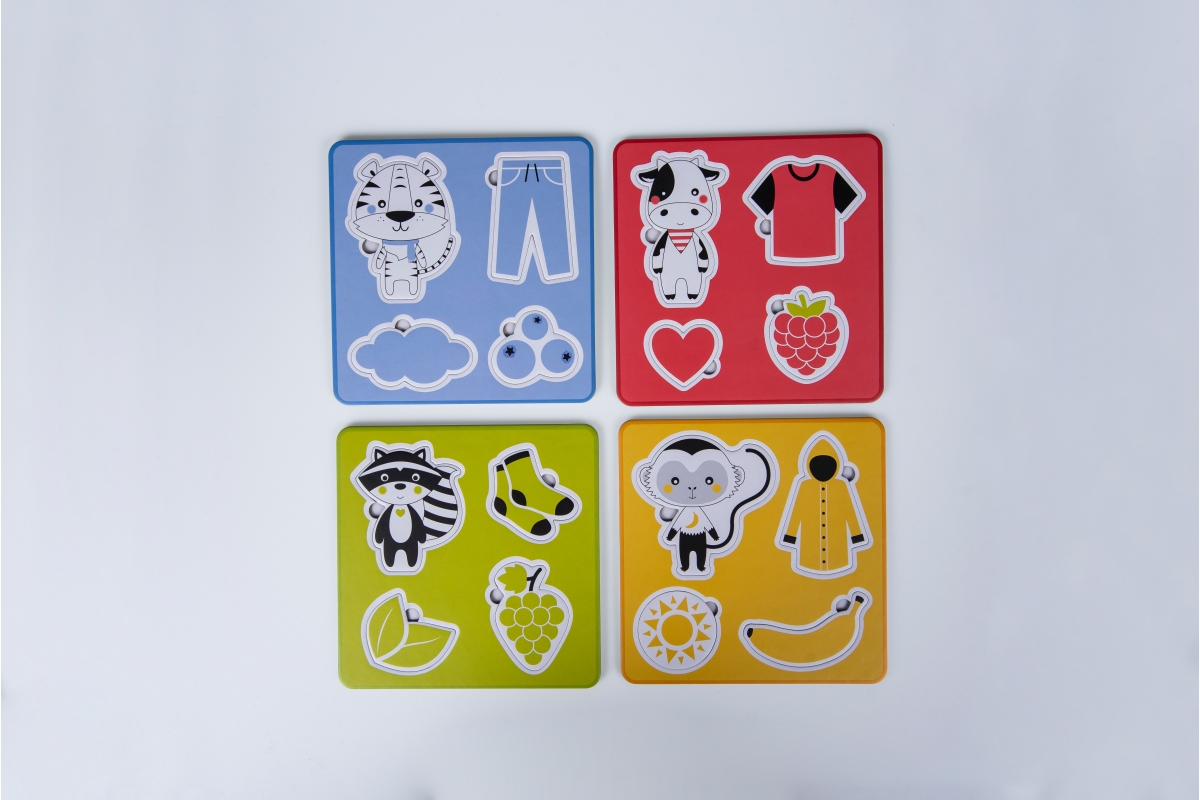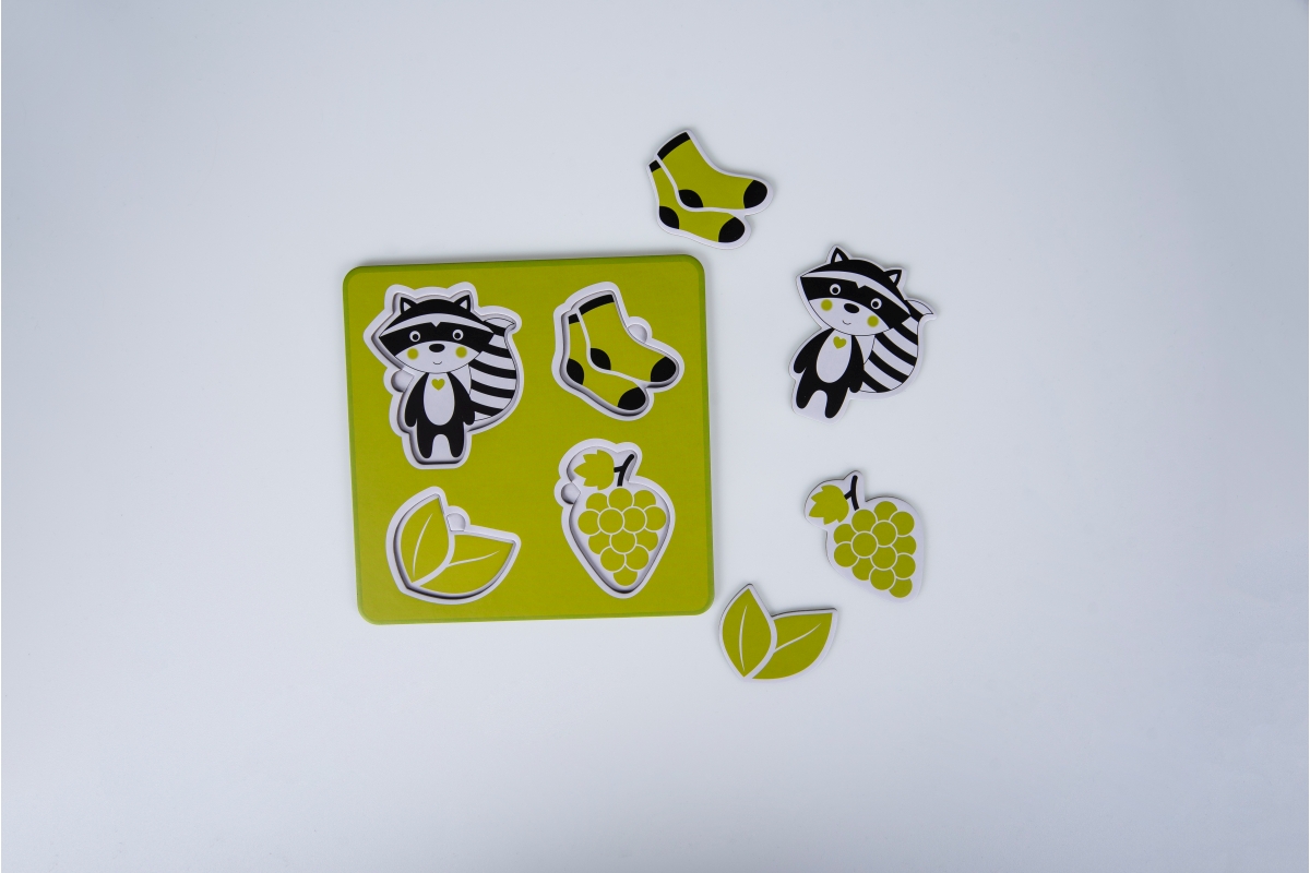 Sada obsahuje 4 desky ve 4 různých barvách, každá s jinou úrovní obtížnosti. Díky malým prohlubním je odstraňování jednotlivých prvků mnohem snazší. Obrázky zobrazují zvířátka GaGaGu a co nejčastěji jedí. Různé barvy a tvary usnadňují dítěti nalezení dílů pro příslušné puzzle. Puzzle stimulují manuální zručnost, soustředění a zrakové vnímání. Věk 18m+
