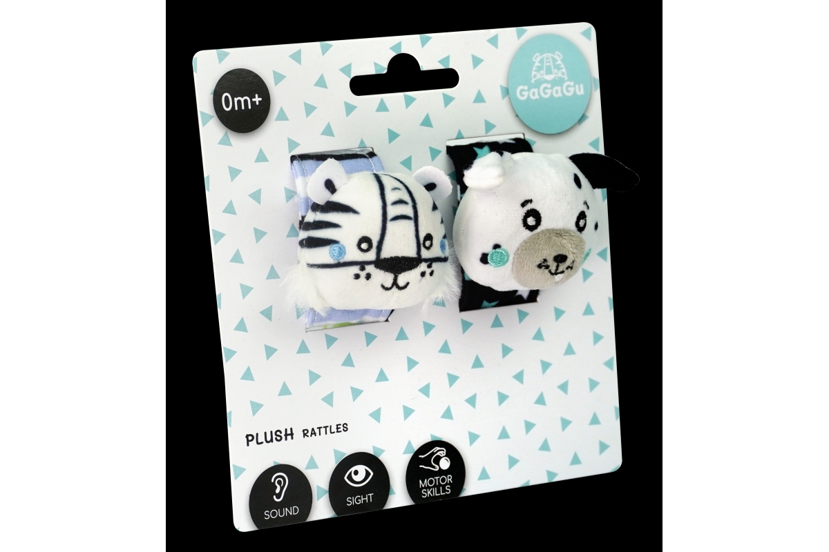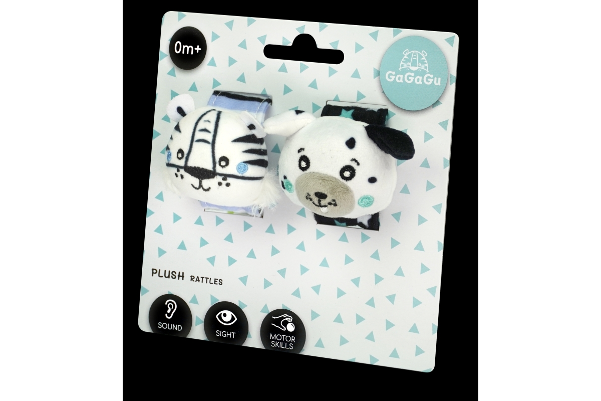 Kdo má uši, ať poslouchá… Jak víme, člověk má pár uší od samého počátku, ale jaké zvuky jsou pro našeho prcka nejvhodnější? Naše chrastítka s plyšovými hlavami tygra a pejska je skvělým řešením, které aktivuje smysly dítěte už od narození.Chrastítko GaGaGu aktivuje sluch – zvuk chrastítek je měkký a příjemný (ne příliš hlasitý). Chrastítko má kontrastní barvy a vzory, které stimulují zrak dítěte. Plyšové hlavy zvířátek – tygra a psa – vybízejí děti k jejich chytání a podporují cvičení tzv jemné motoriky (pohyby prstů a rukou) a učení motorické koordinace. Chrastítko lze připevnit na zápěstí (speciálním suchým zipem, žádné ostré chlupy, lze snadno zapnout) a použít jako běžné chrastítko, protože je popruh vyroben z měkkého materiálu a umožňuje tak dítěti pohodlnému uchopení celé hračky. Věk 0+
