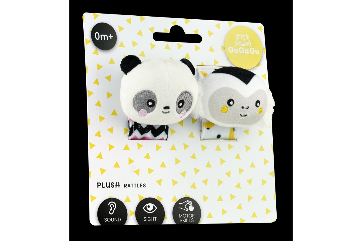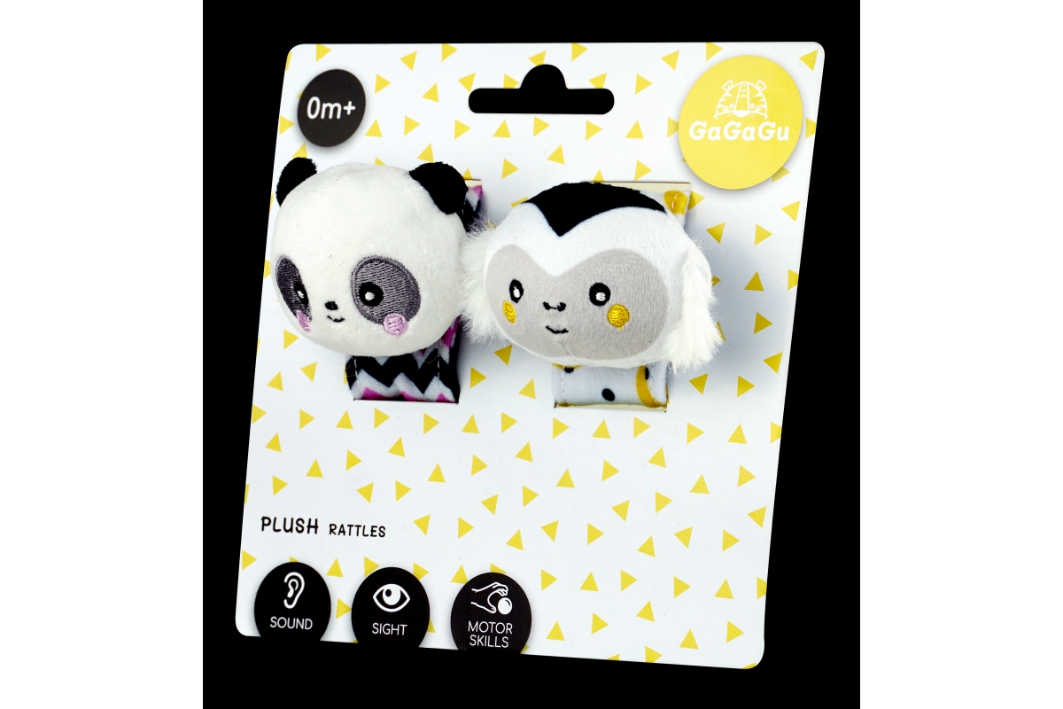 Kdo má uši, ať poslouchá… Jak víme, člověk má pár uší od samého počátku, ale jaké zvuky jsou pro našeho prcka nejvhodnější? Naše chrastítka s plyšovými hlavami opice a pandy je skvělým řešením, které aktivuje smysly dítěte už od narození.Chrastítko GaGaGu aktivuje sluch – zvuk chrastítek je měkký a příjemný (ne příliš hlasitý). Chrastítko má kontrastní barvy a vzory, které stimulují zrak dítěte. Plyšové hlavy zvířátek – opice a panda – vybízejí děti k jejich chytání a podporují cvičení tzv. jemné motoriky (pohyby prstů a rukou) a učení motorické koordinace. Chrastítko lze připevnit na zápěstí (speciálním suchým zipem, žádné ostré chlupy, lze snadno zapnout) a použít jako běžné chrastítko, protože je popruh vyroben z měkkého materiálu a umožňuje tak dítěti pohodlnému uchopení celé hračky. Věk 0+