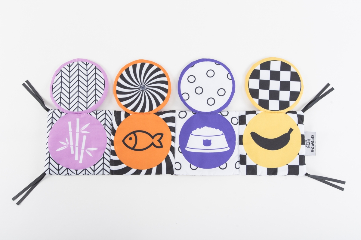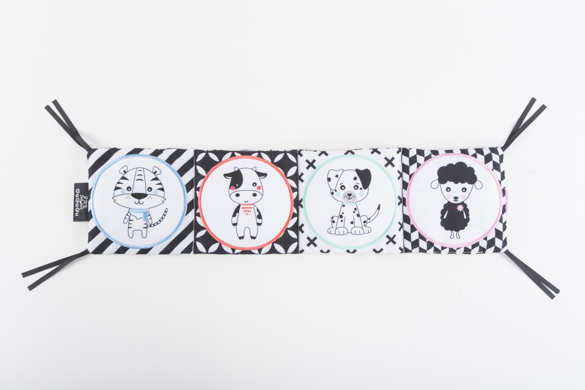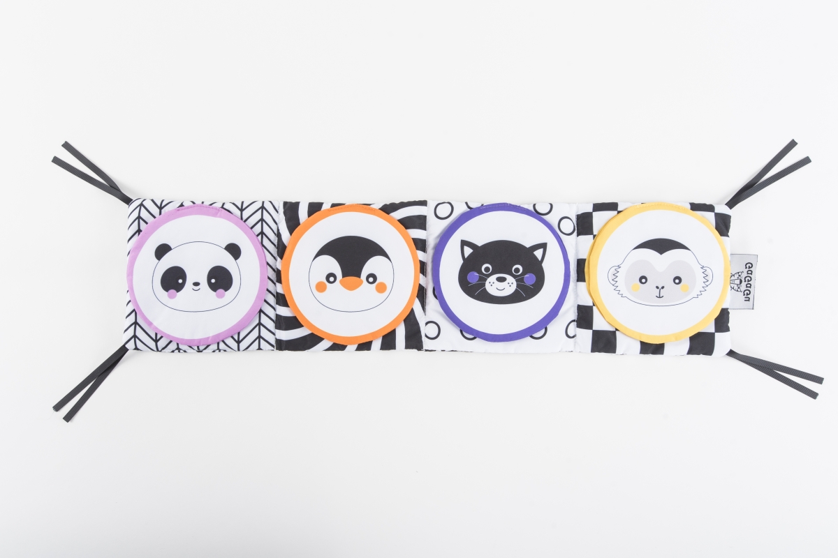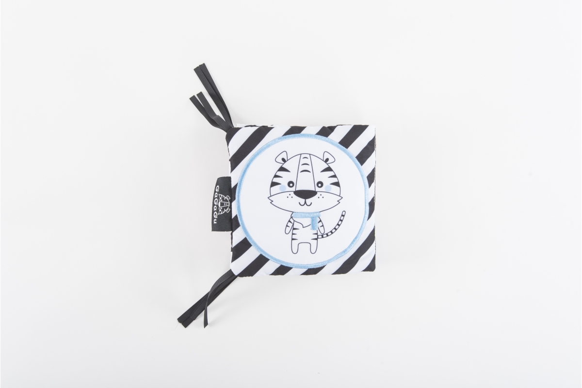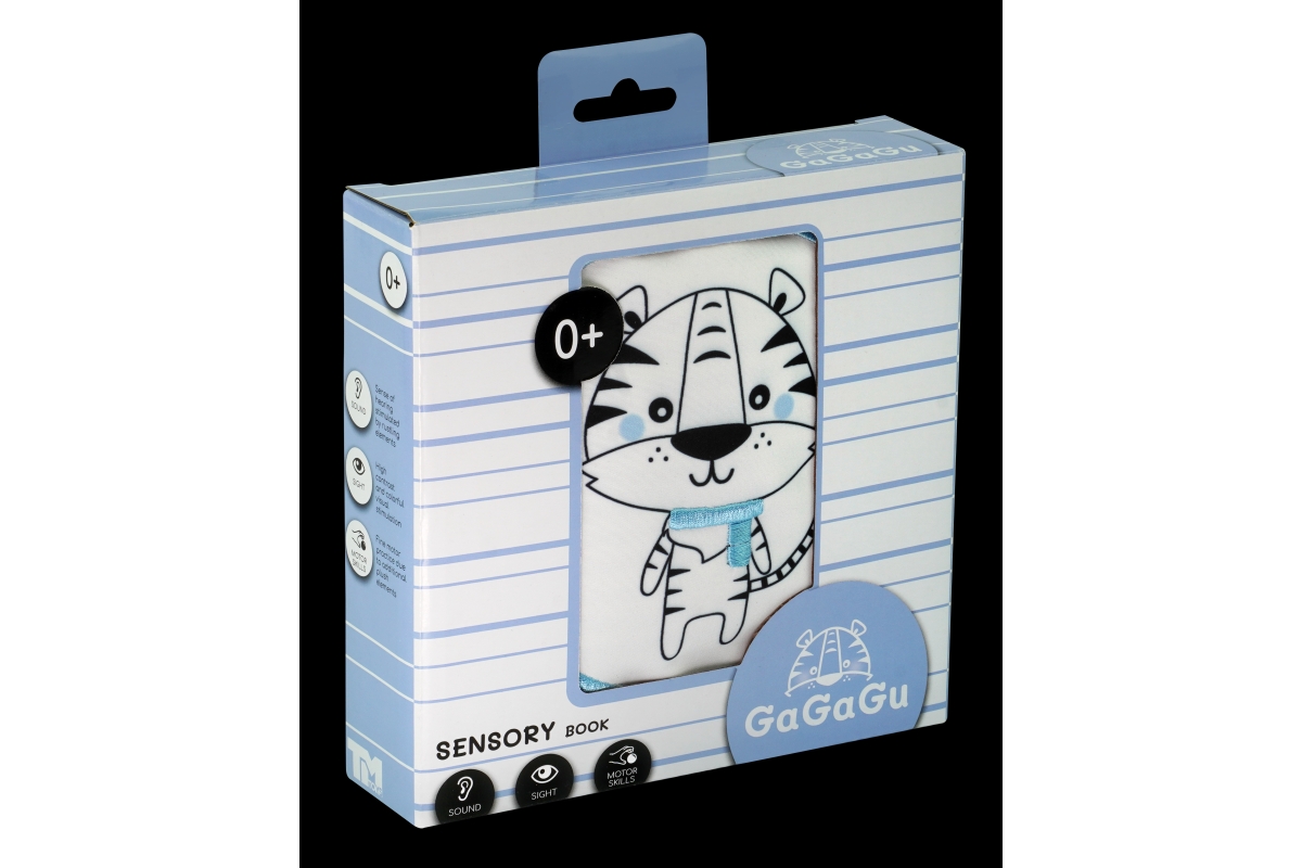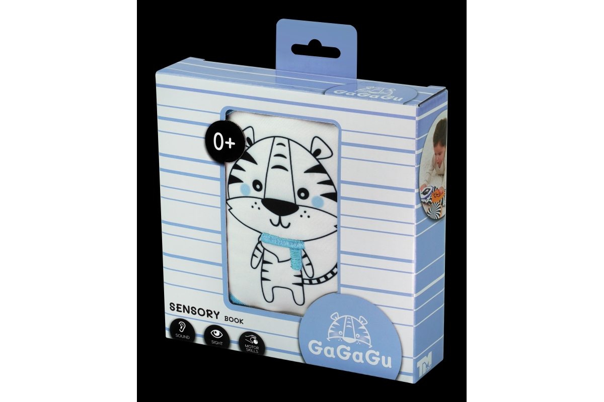 Na literární klasiku bude ještě čas, ale pokud vašeho malého miláčka přitahují knihy od samého začátku, nesmí mu po ruce chybět smyslová knížečka s obrázky zvířat a jejich oblíbených jídel. Kniha GaGaGu má kontrastní barvy a vzory, což stimuluje zrak dítěte. Kniha je oboustranná. Na jedné straně jsou kontrastní ilustrace zvířat s vyšívanými prvky, které jsou pro dítě pod prsty znatelně odlišné textury – stimulace hmatu, učení se různým texturám dítětem. Na druhou stranu jsou tu kulaté plyšové žabky, které dítěti umožní hrát jednu z oblíbených „her“ miminka – a kuku! – každá chlopeň je potištěna na obou stranách jiným vzorem – jeden prvek, ale dva zcela odlišné vizuální zážitky. Pod plyšovými žabkami s obrázky zvířátek jsou symboly jídla, co zvířátko jí + plyšové klapky mají všitý šustivý materiál a při otevírání a doteku šustí – menší dítě se učí různé tvary a barvy a dostává sluchovou stimulaci, starší dítě se dozví, jakou potravu dané zvíře jí. Věk 0+