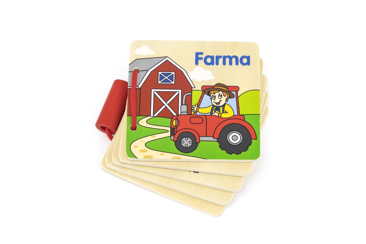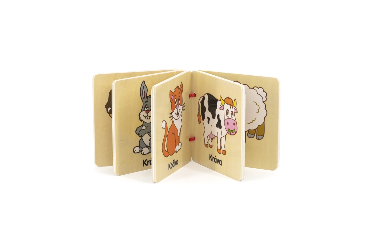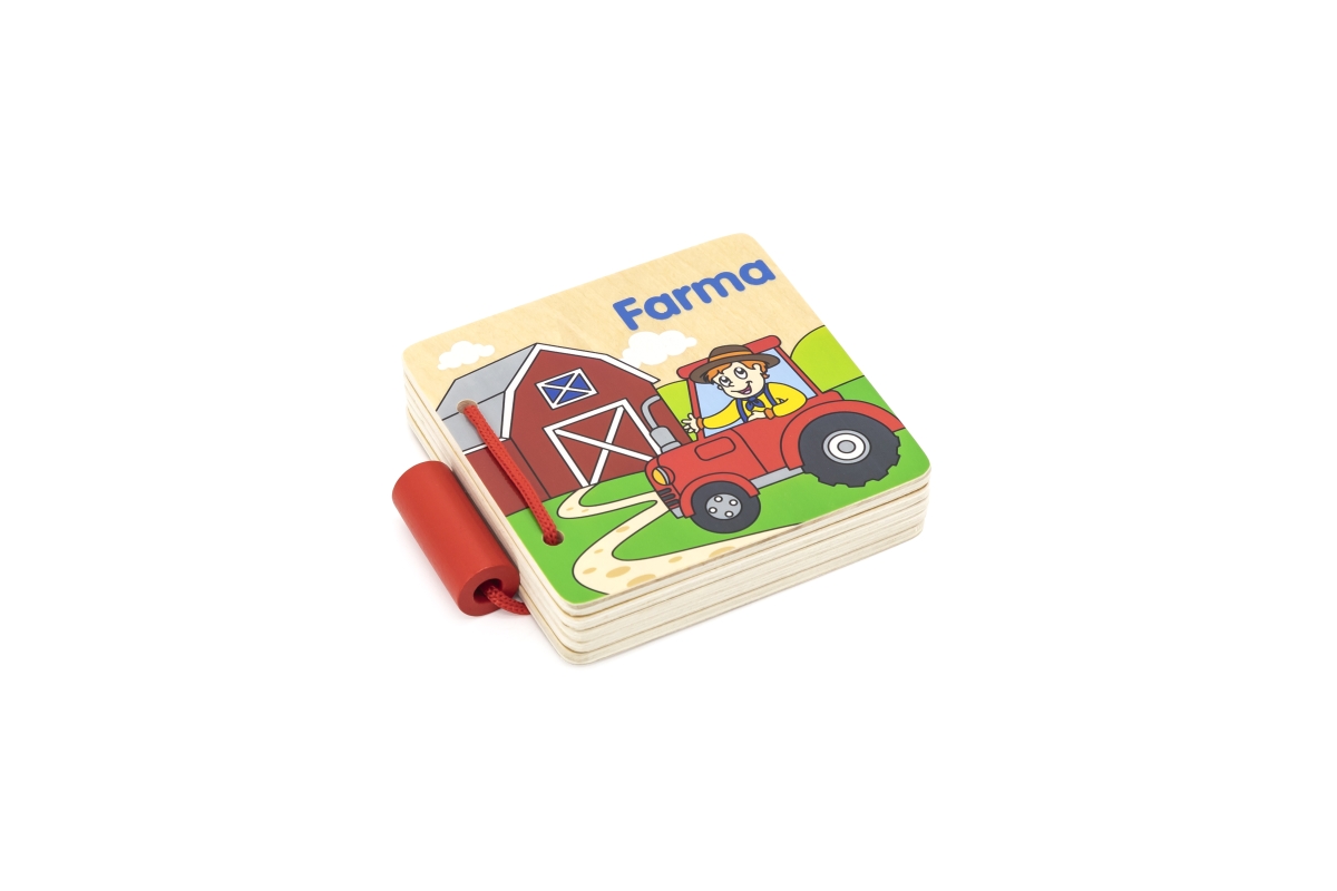 Dřevěná knížka s obrázky zvířátek z farmy v českém jazyce. Rozměr balení cca 10,5 x 8 x 2 cm. Věk 12m+..