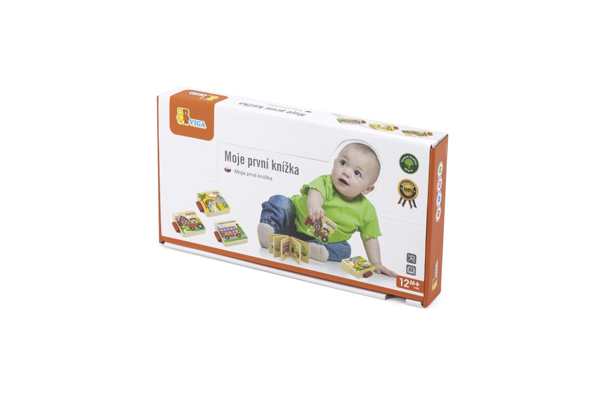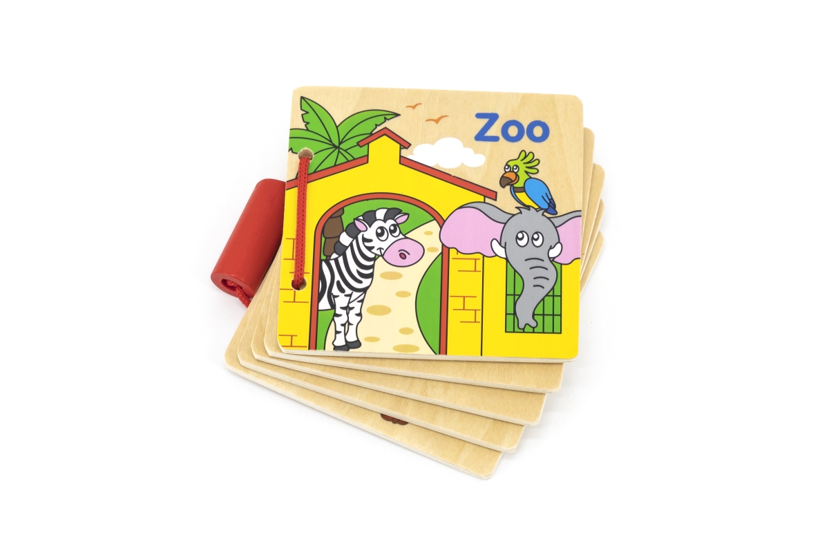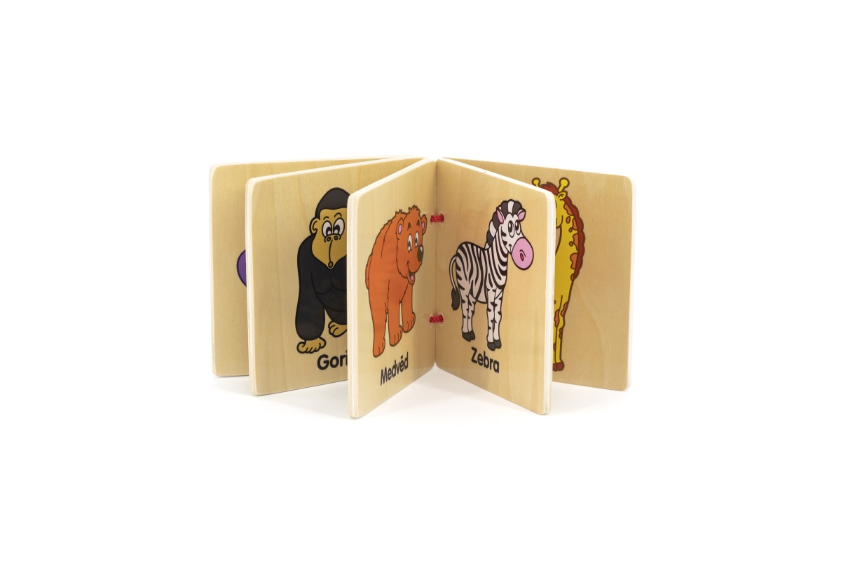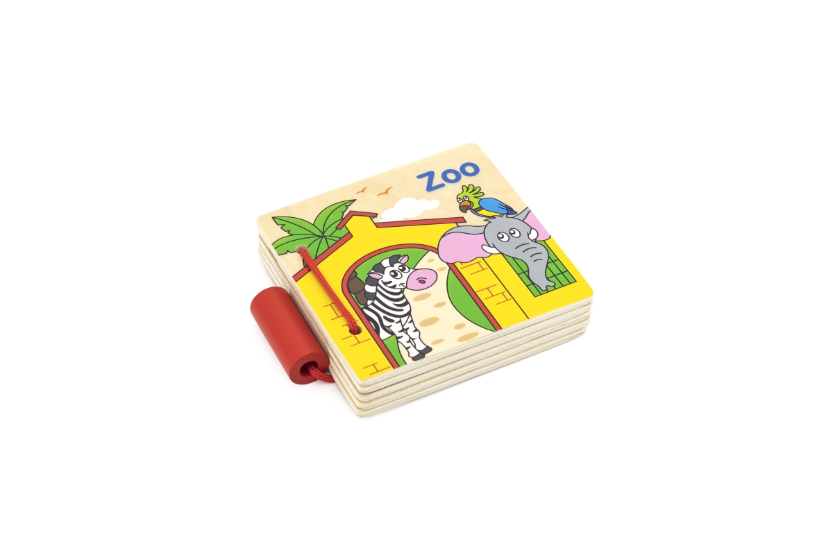 Dřevěná knížka s obrázky zvířátek ze zoologické zahrady v českém jazyce. Rozměr balení cca 10,5 x 9 x 2 cm. Věk 12m+..