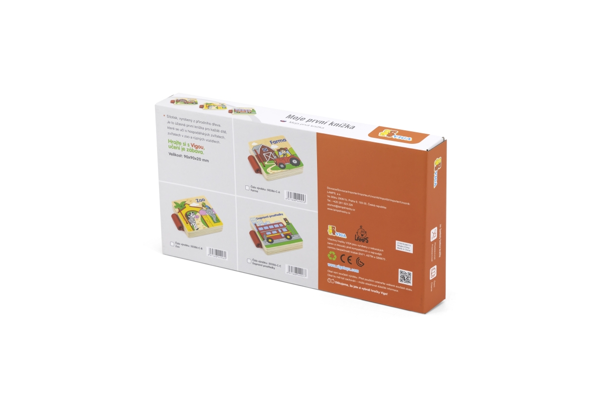 Dřevěná knížka s obrázky dopravních prostředků v českém jazyce. Rozměr balení cca 10,5 x 9 x 2 cm. Věk 12m+..