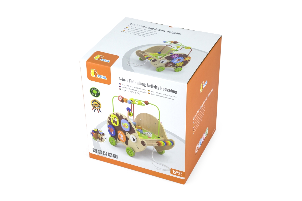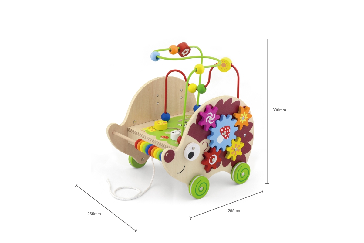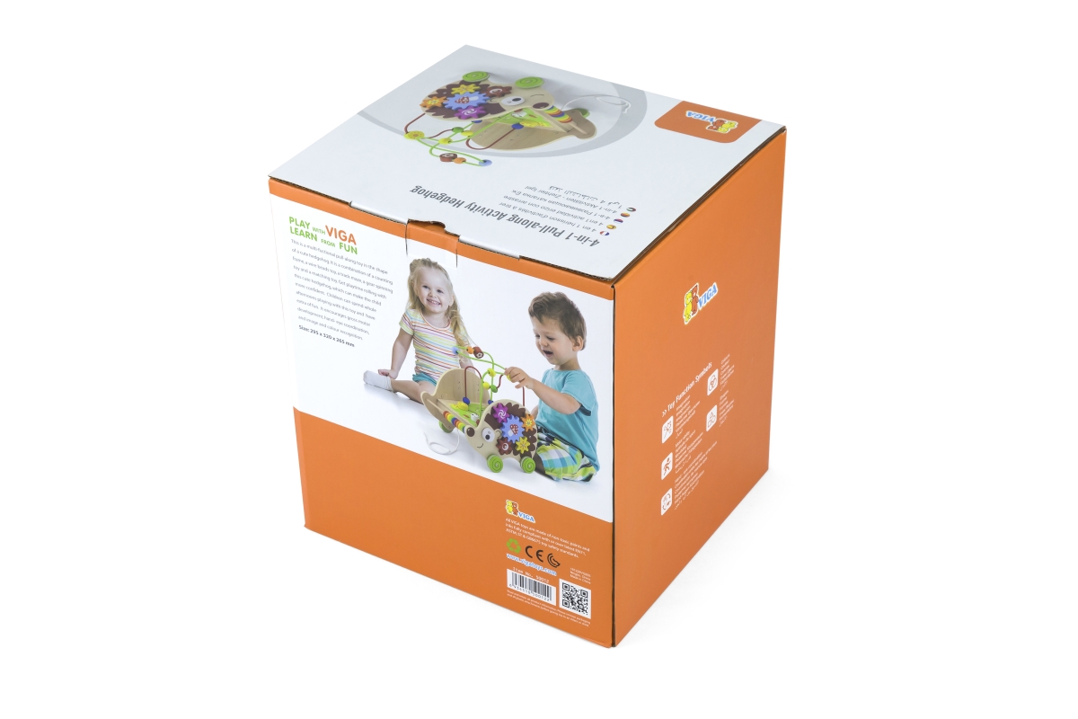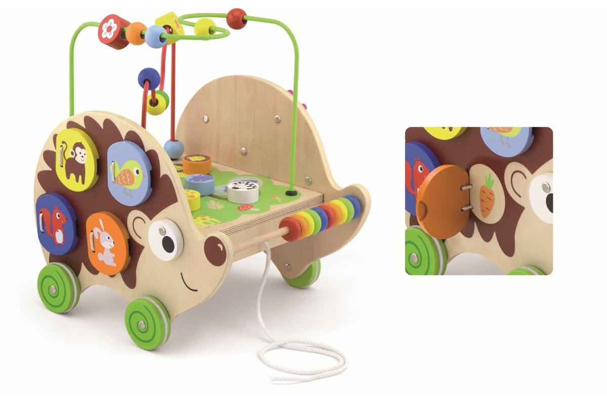 Dřevěná tahačka ježek s aktivitami 5v1. Jedná se o kombinaci počítání, labyrintu se zvířátky, kuličkového labyrintu, ozubených kol a naučné hry. Rozmě..