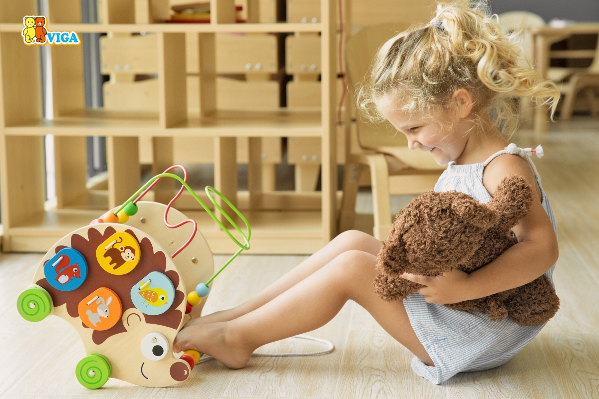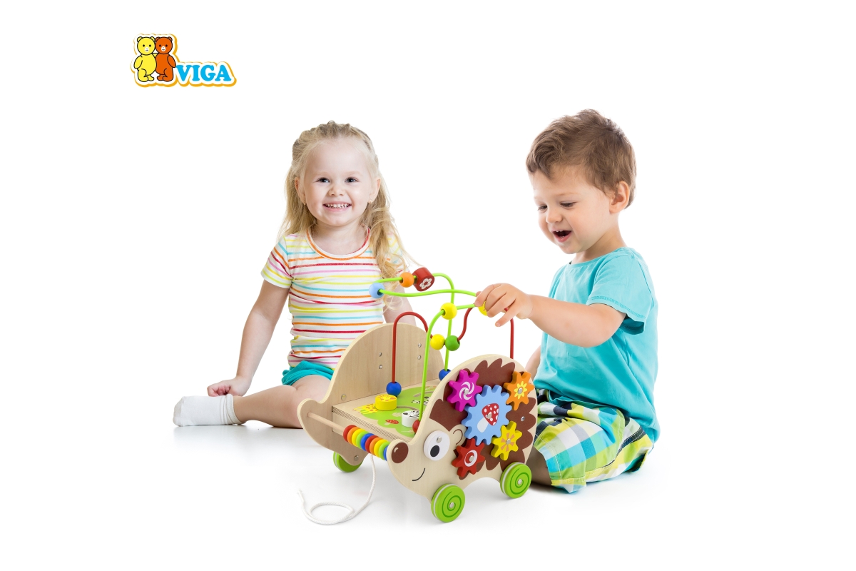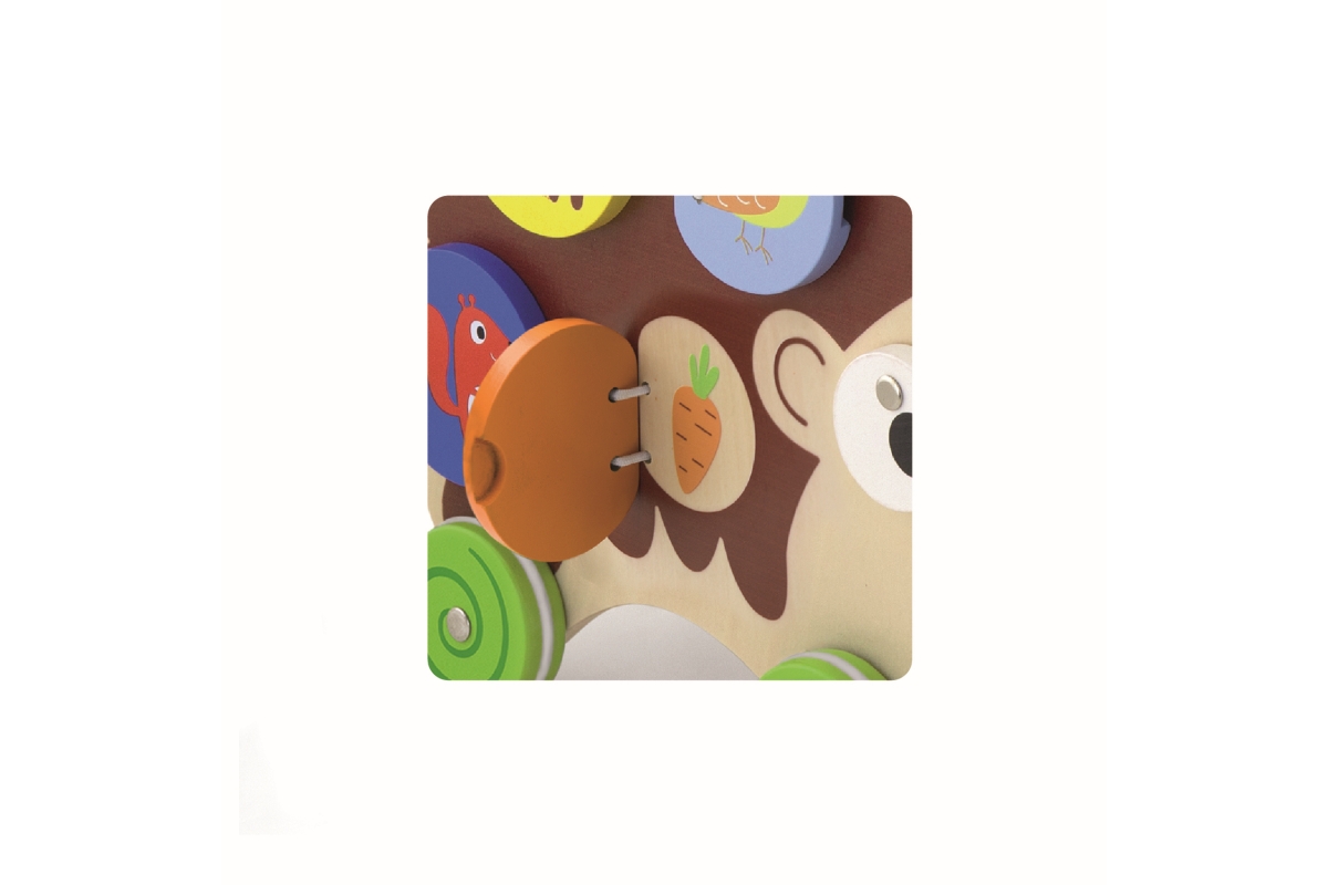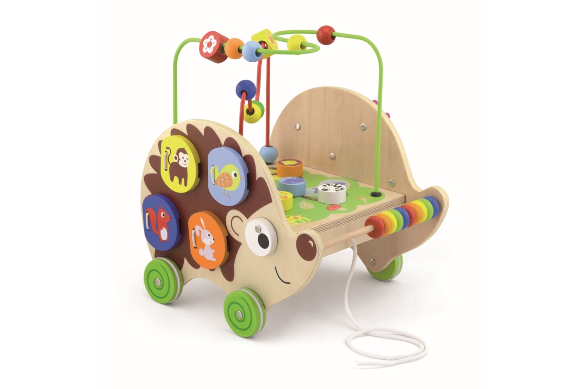 Dřevěná tahačka ježek s aktivitami 5v1. Jedná se o kombinaci počítání, labyrintu se zvířátky, kuličkového labyrintu, ozubených kol a naučné hry. Rozmě..