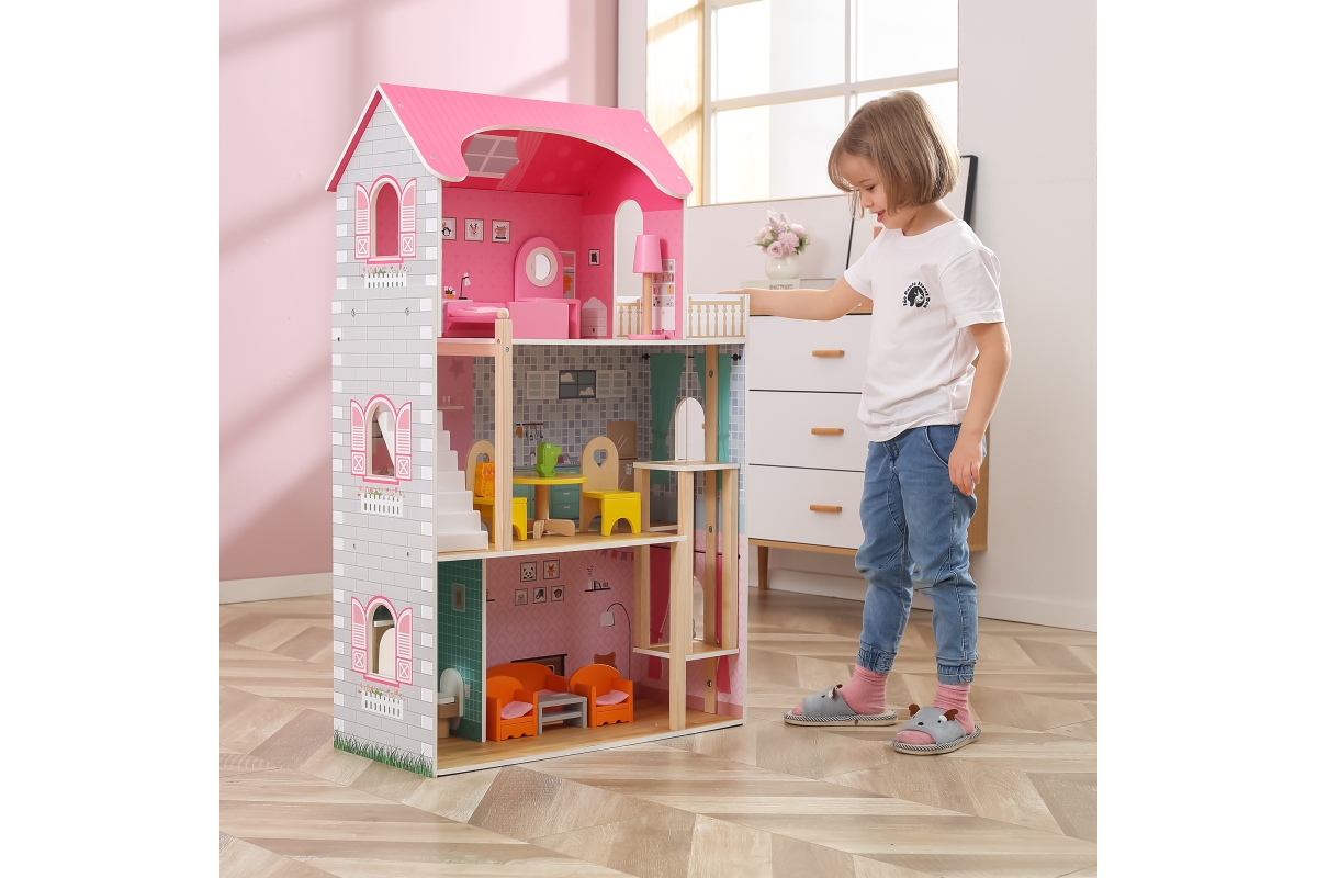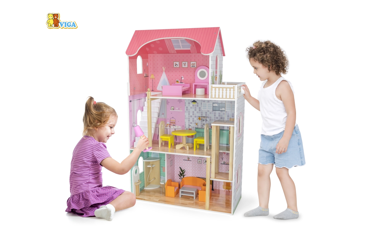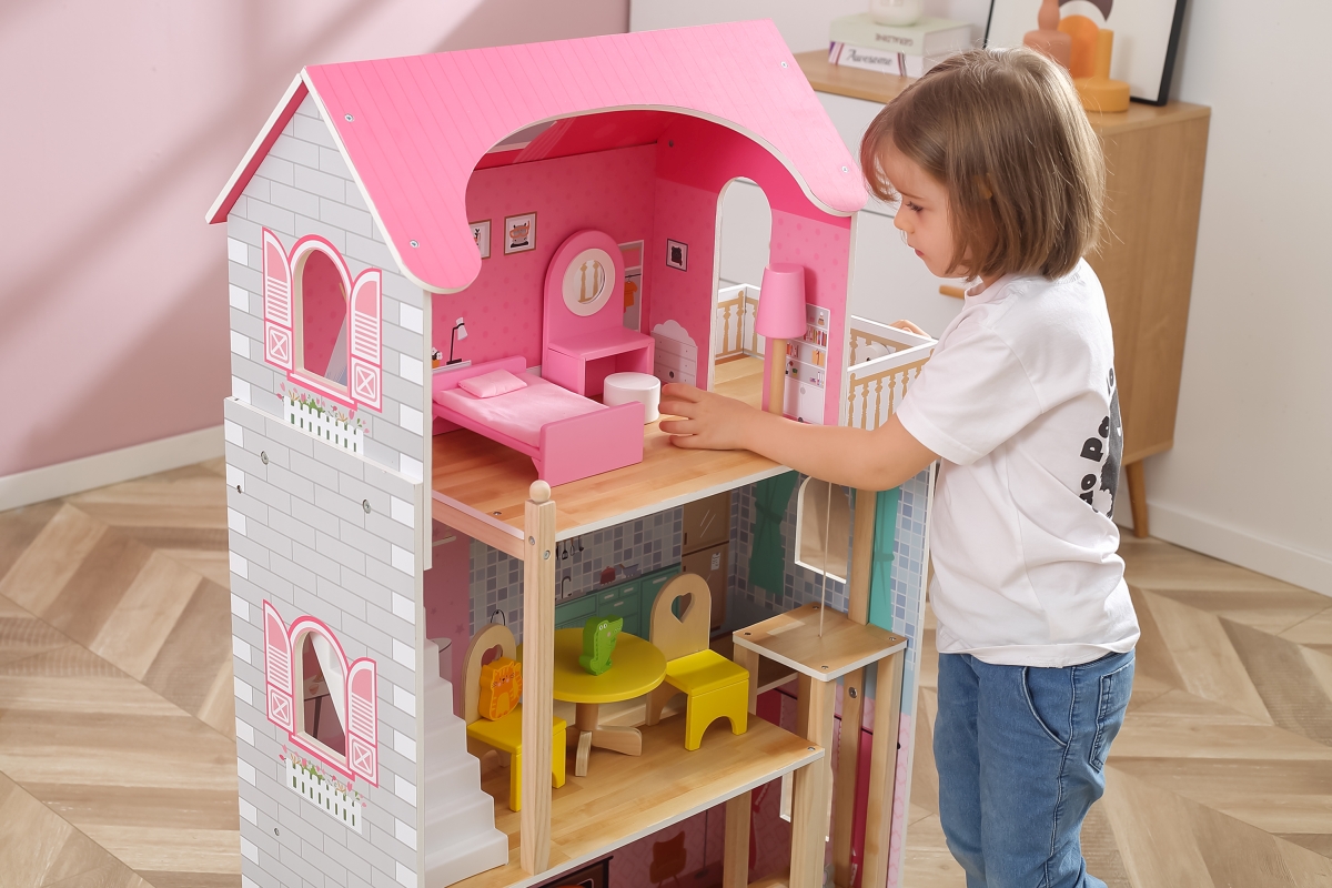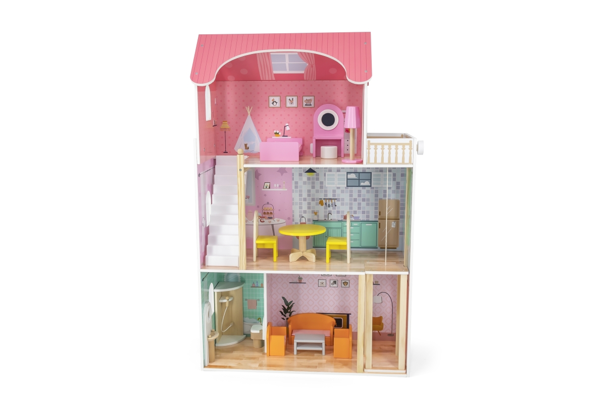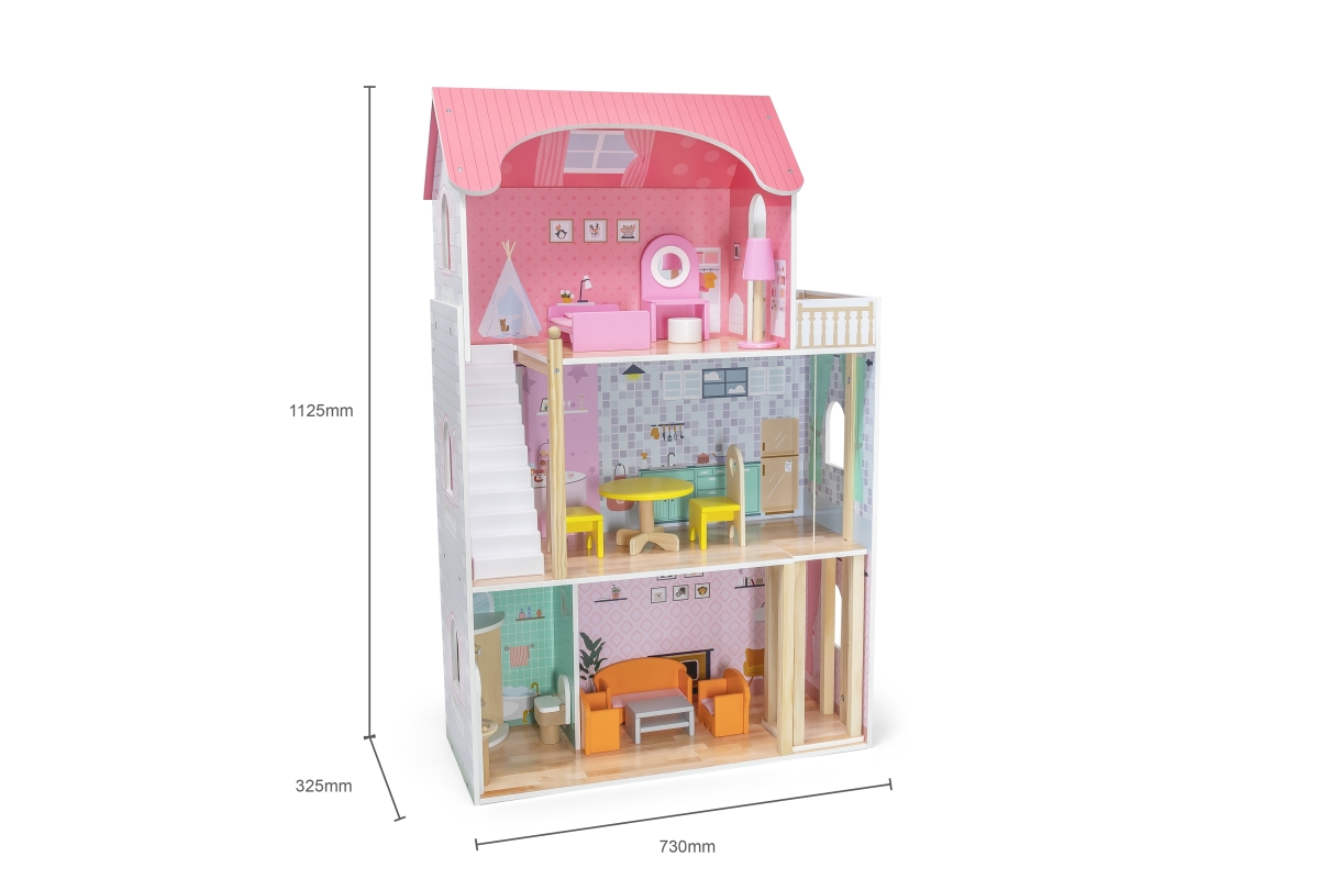 Dřevěný domeček pro panenky o rozměrech 730 mmx 1125mm s dřevěným nábytkem.Věk 3..