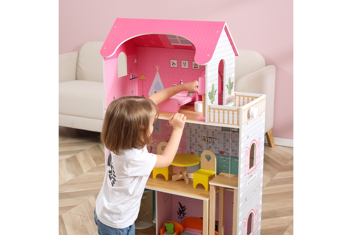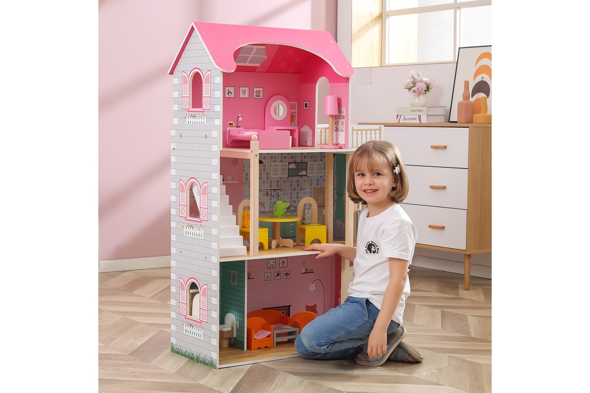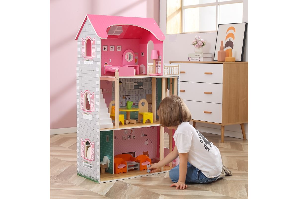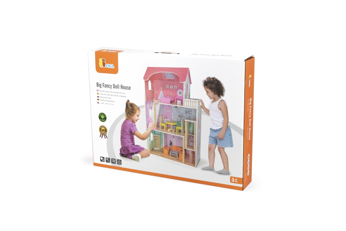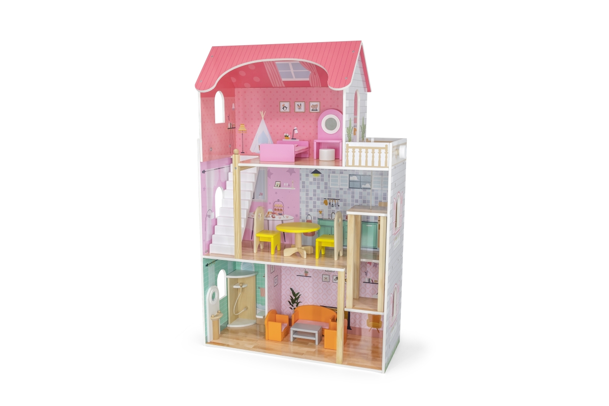 Dřevěný domeček pro panenky o rozměrech 730 mmx 1125mm s dřevěným nábytkem.Věk 3..