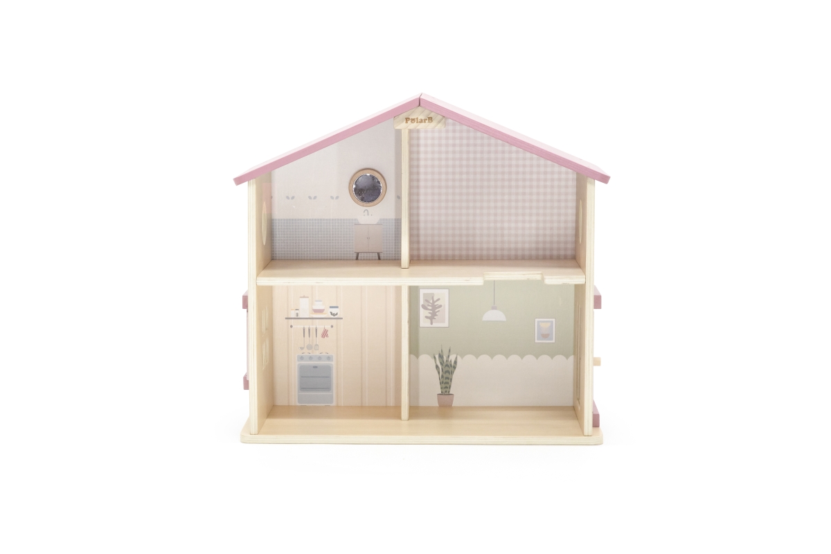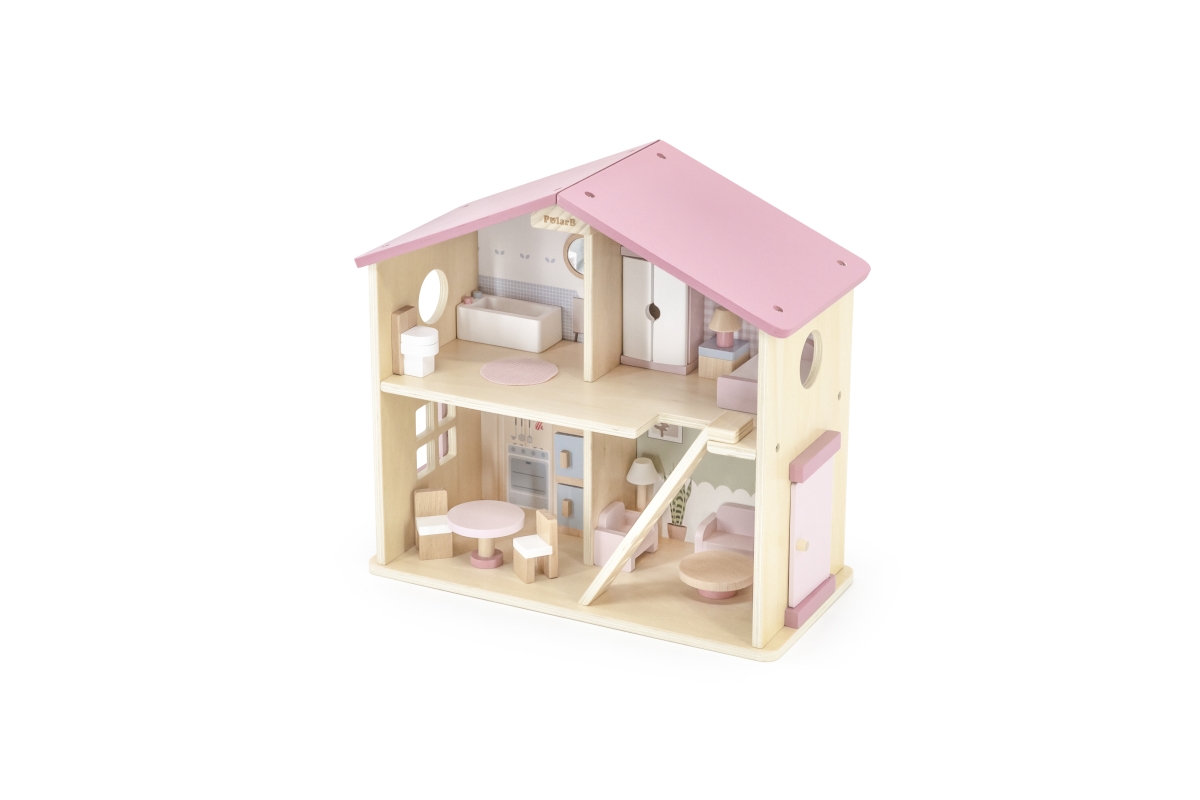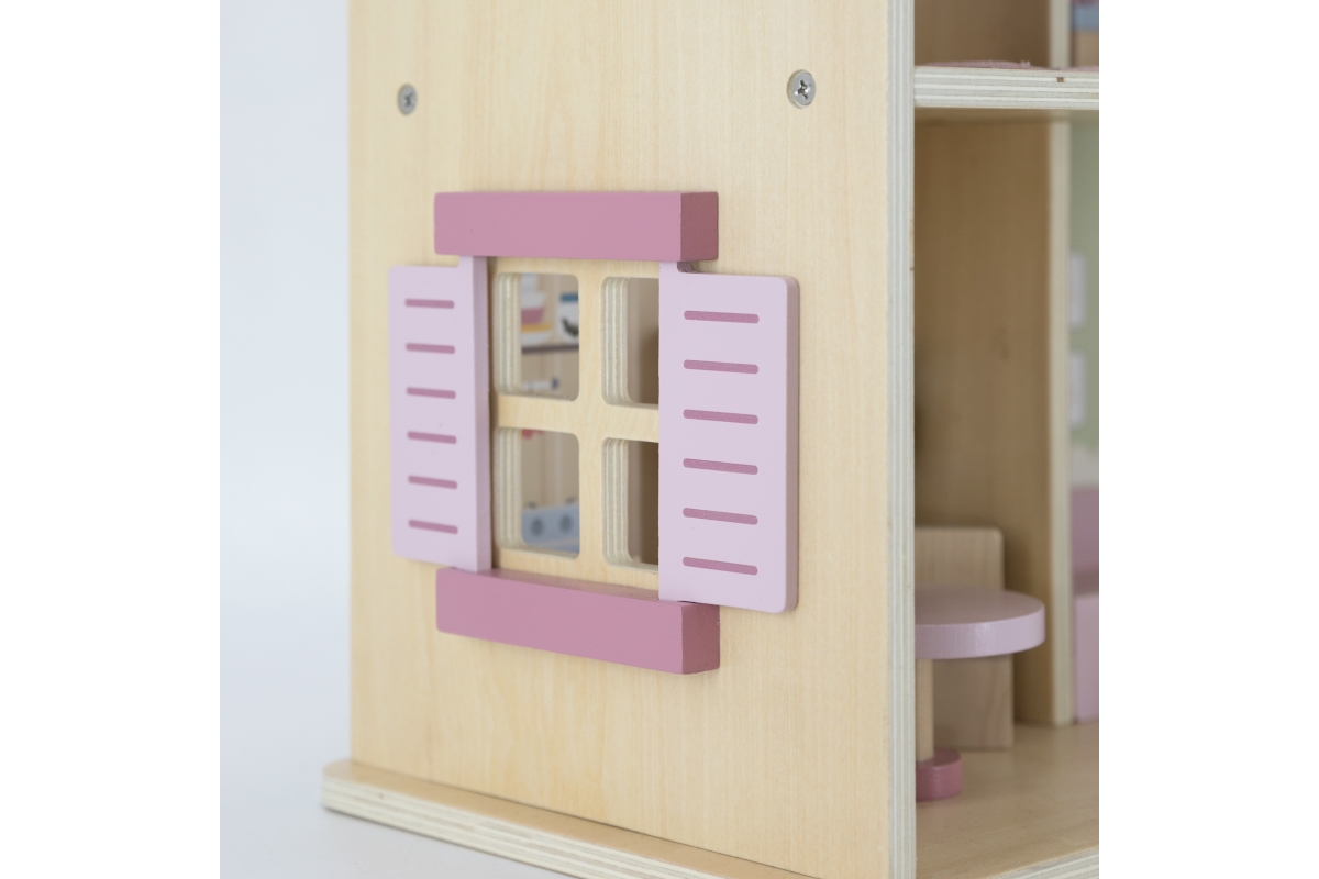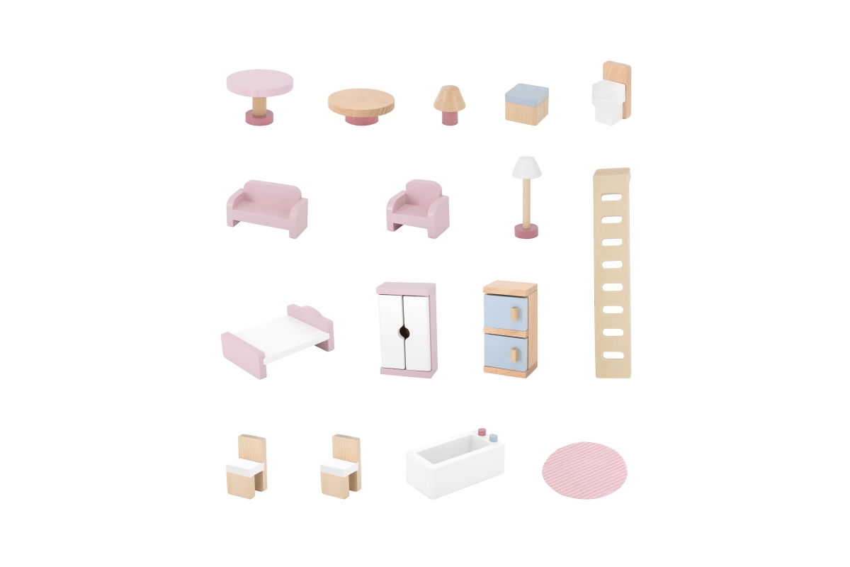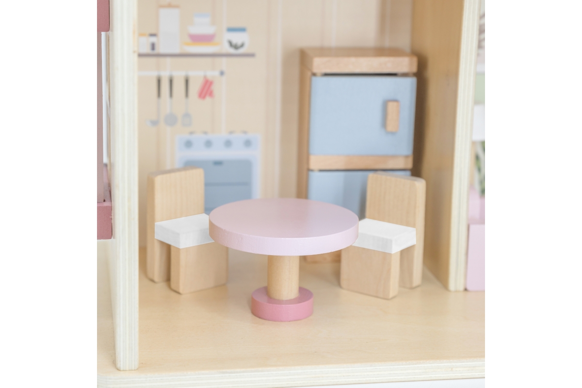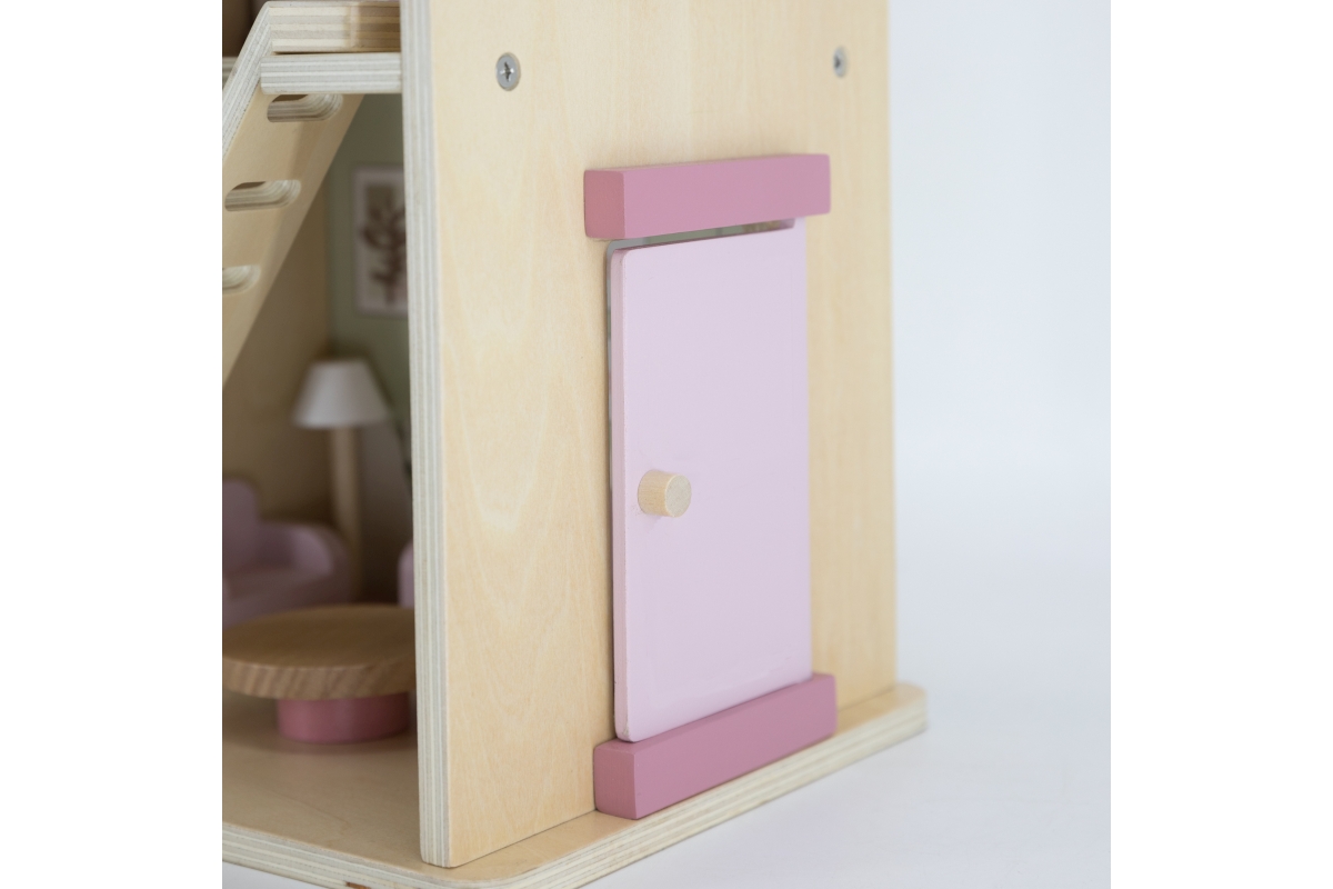 Dřevěný domeček pro panenky. Domeček se skládá z kuchyně, obývacího pokoje, koupelny a ložnice. Součástí balení je 16 drobných doplňků. Rozměry domečk..