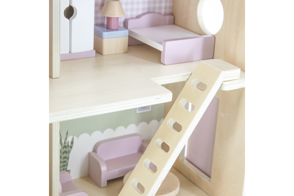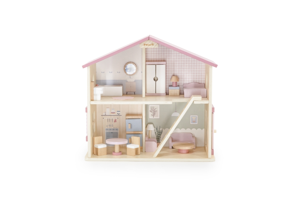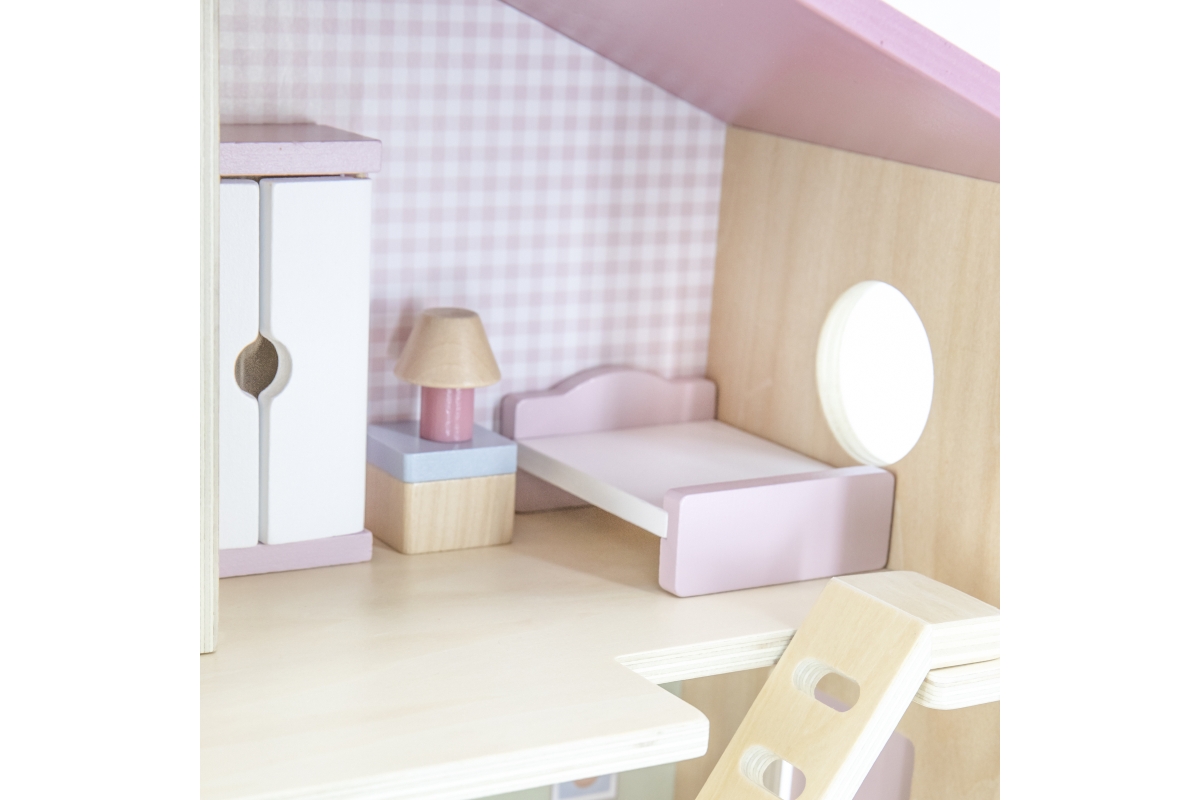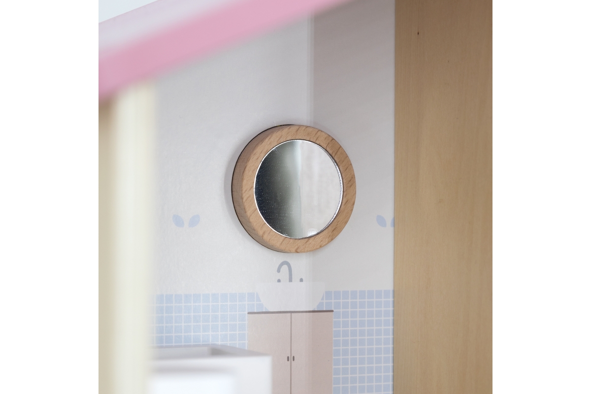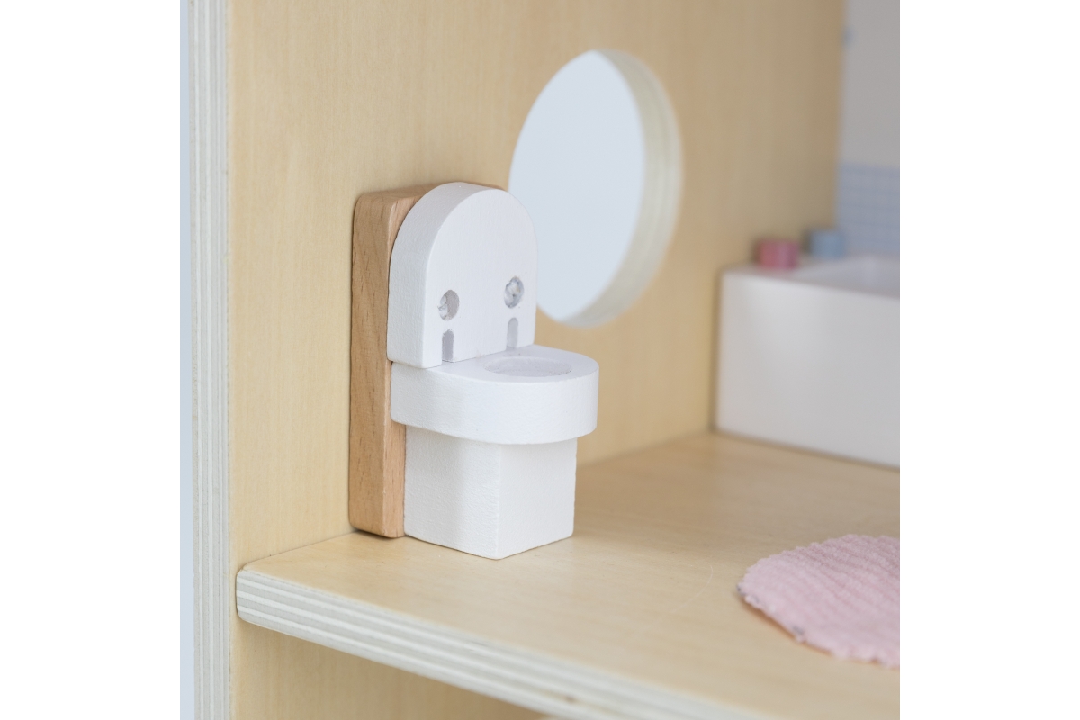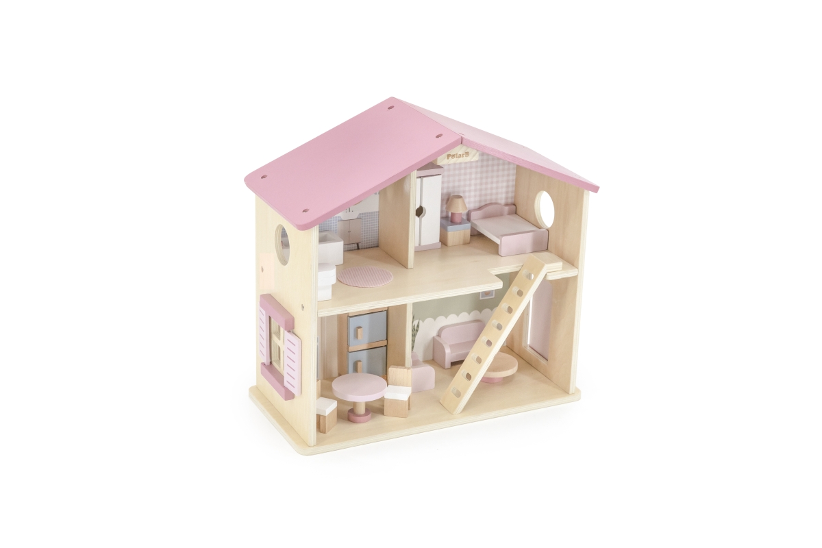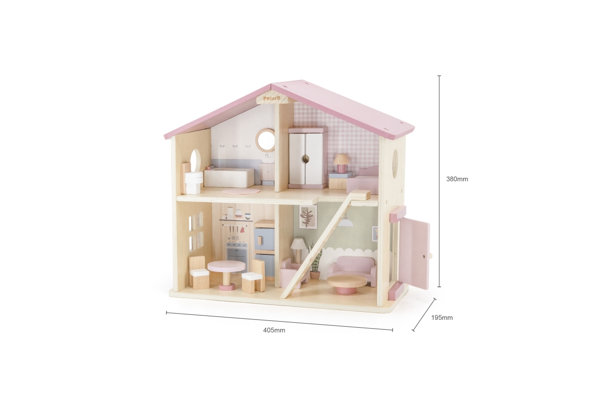 Dřevěný domeček pro panenky. Domeček se skládá z kuchyně, obývacího pokoje, koupelny a ložnice. Součástí balení je 16 drobných doplňků. Rozměry domečk..