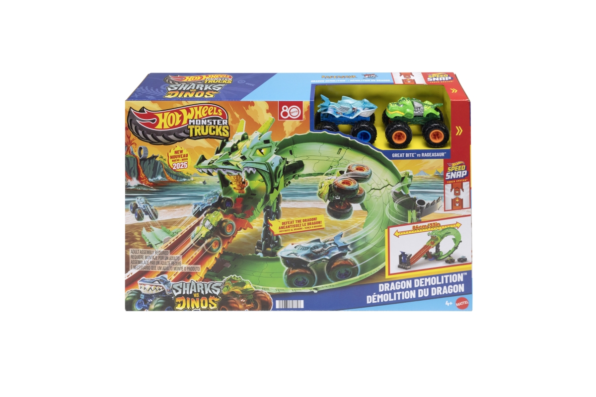 Závod začíná! Hot Wheels Monster Truck se utkávají v epickém souboji žraloci versus dinosauři, aby porazili svého úhlavního nepřítele – kybernetického draka v herním setu Dračí zkáza. Naložte oba přiložené monster trucky do dvojitého odpalovače a vystřelte je současně přímo do dračí tlamy. Čeká je divoká jízda skrz jeho tělo, kde rozhoduje motorová pila jako přeřazovač, který náhodně určí jeden ze tří výsledků – zadrží oba monster trucky, shodí jednoho z trati nebo propustí oba k vítězství. Jakmile drak padne, děti můžou znovu odstartovat útok a získat trofej! Součástí jsou dva monster trucky Hot Wheels v měřítku 1:64. Barvy a vzhled výrobku se mohou lišit. Doporučený věk 4+