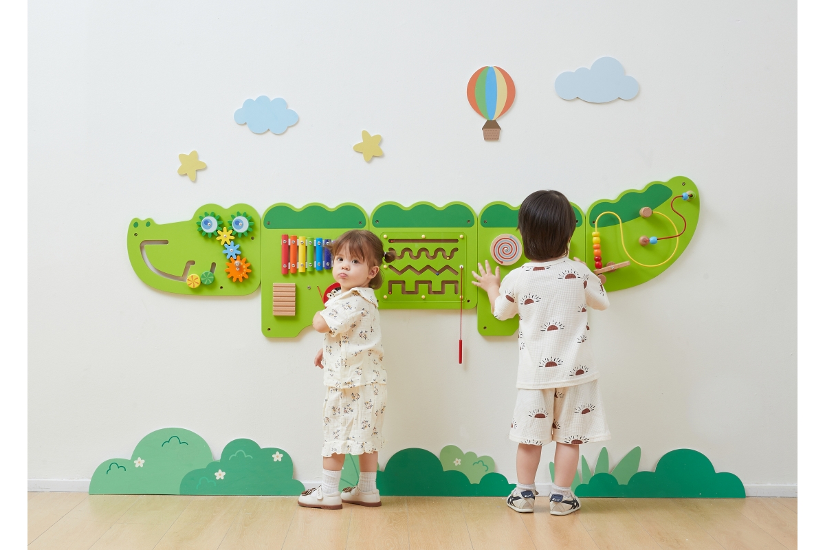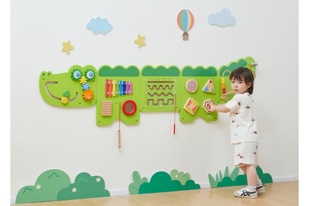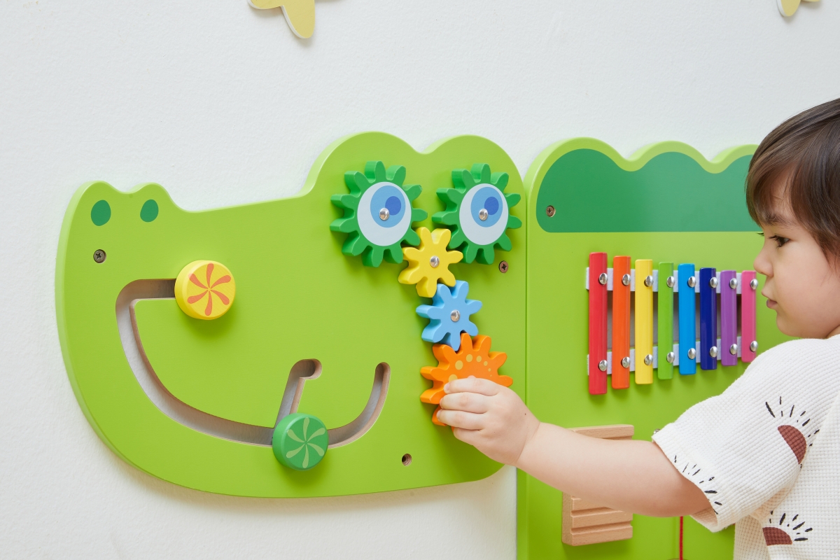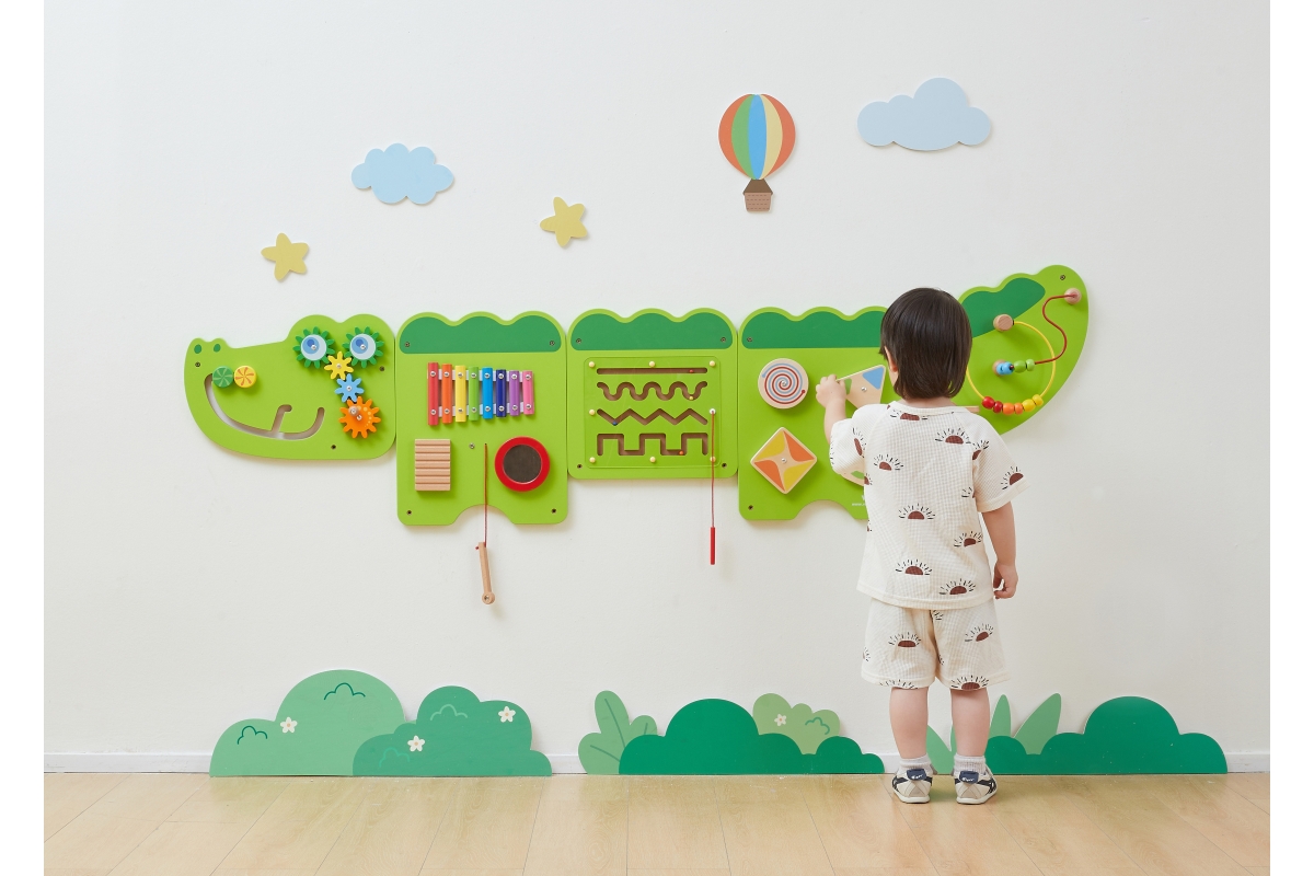 Dřevěná nástěnná hra Krokodýl - junior. Nástěnná hra obsahuje herní prvky jako např. xylofon, magnetické bludiště nebo ozubená kolečka. Rozměry hry 18..