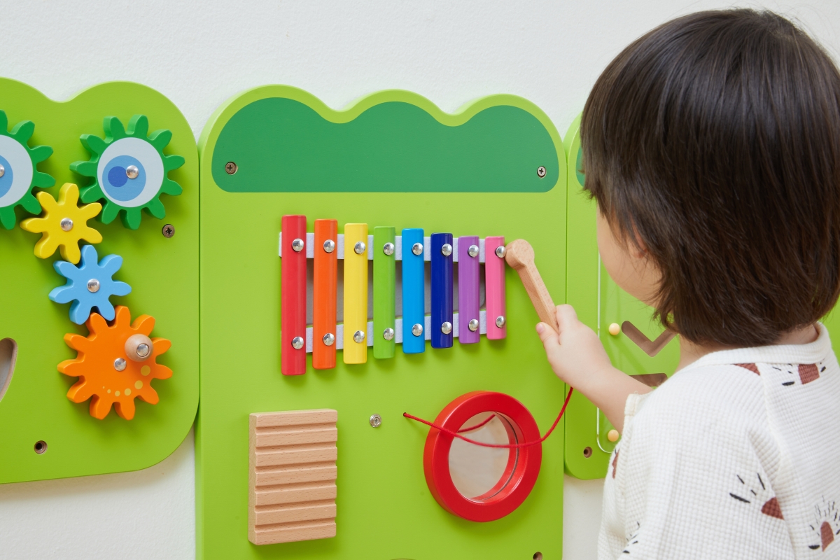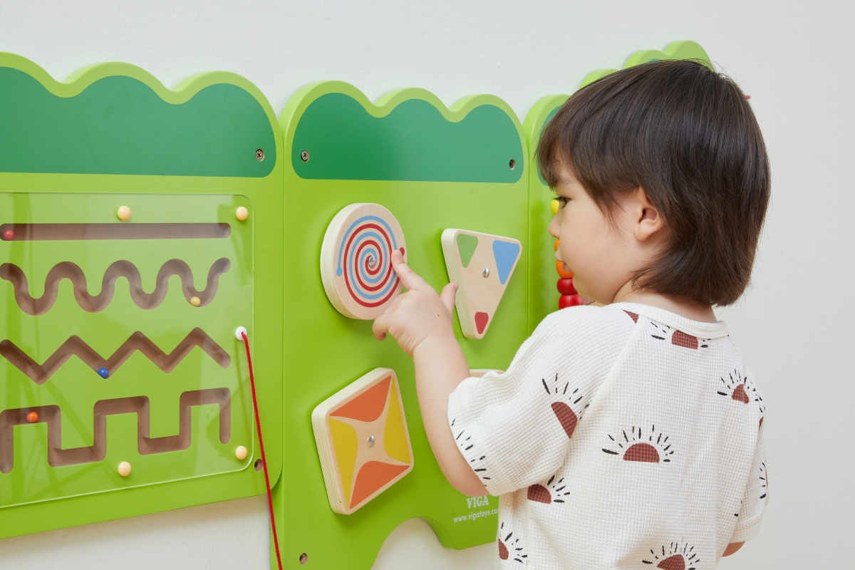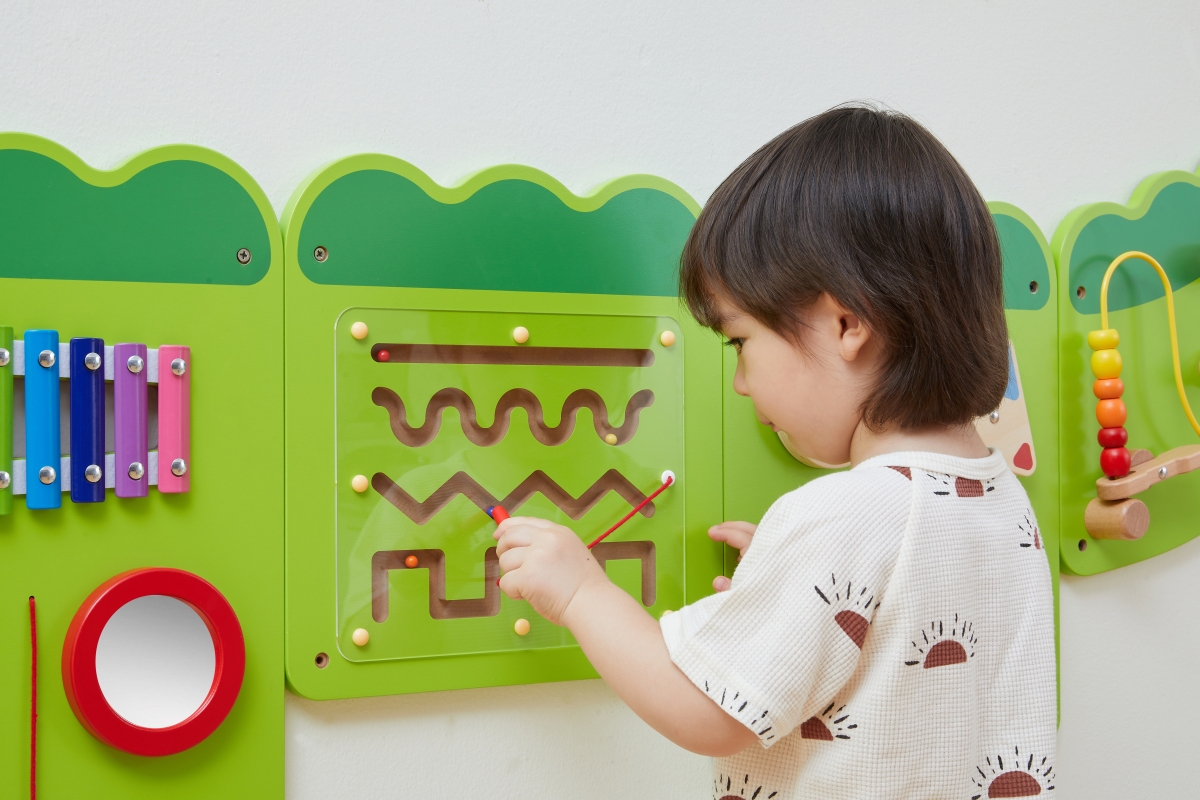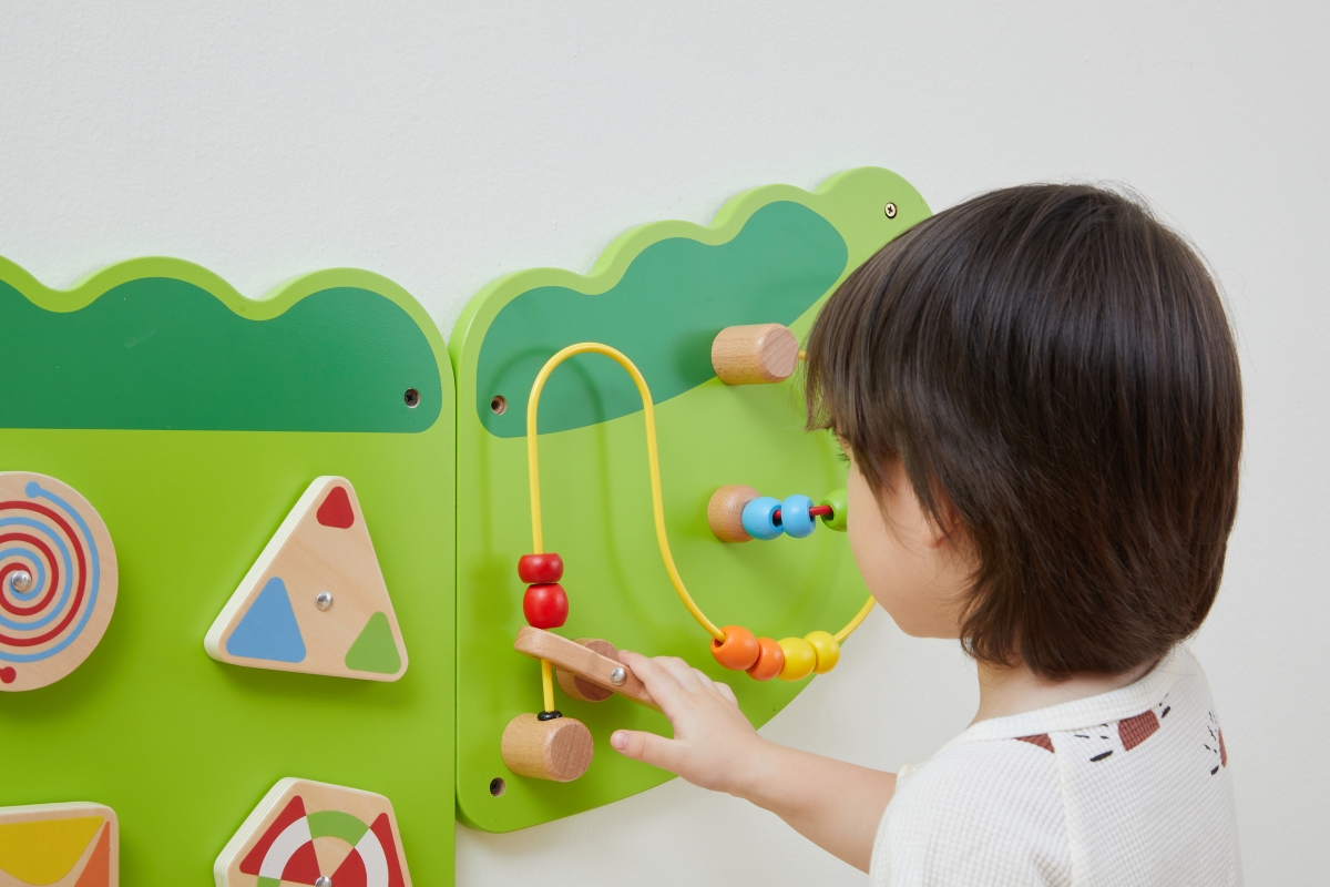 Dřevěná nástěnná hra Krokodýl - junior. Nástěnná hra obsahuje herní prvky jako např. xylofon, magnetické bludiště nebo ozubená kolečka. Rozměry hry 18..