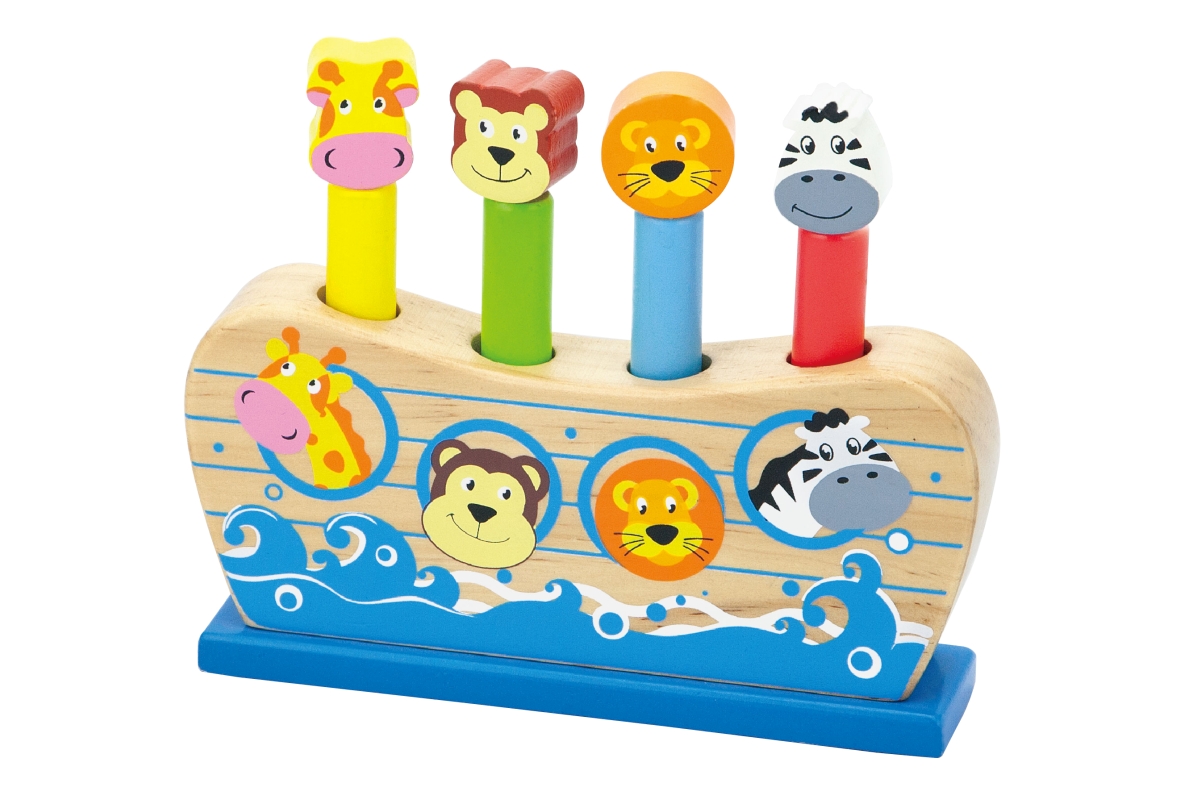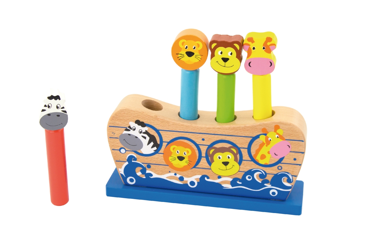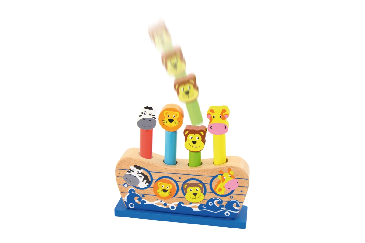 Dřevěná hra Noemova archa. Když dítě udeří do zvířátka, tak zvířátko vyskočí. Rozměry cca 17 x 14 x 4 cm. Rozměry balení cca 21 x 17 x 5,5 cm. Věk 18m..
