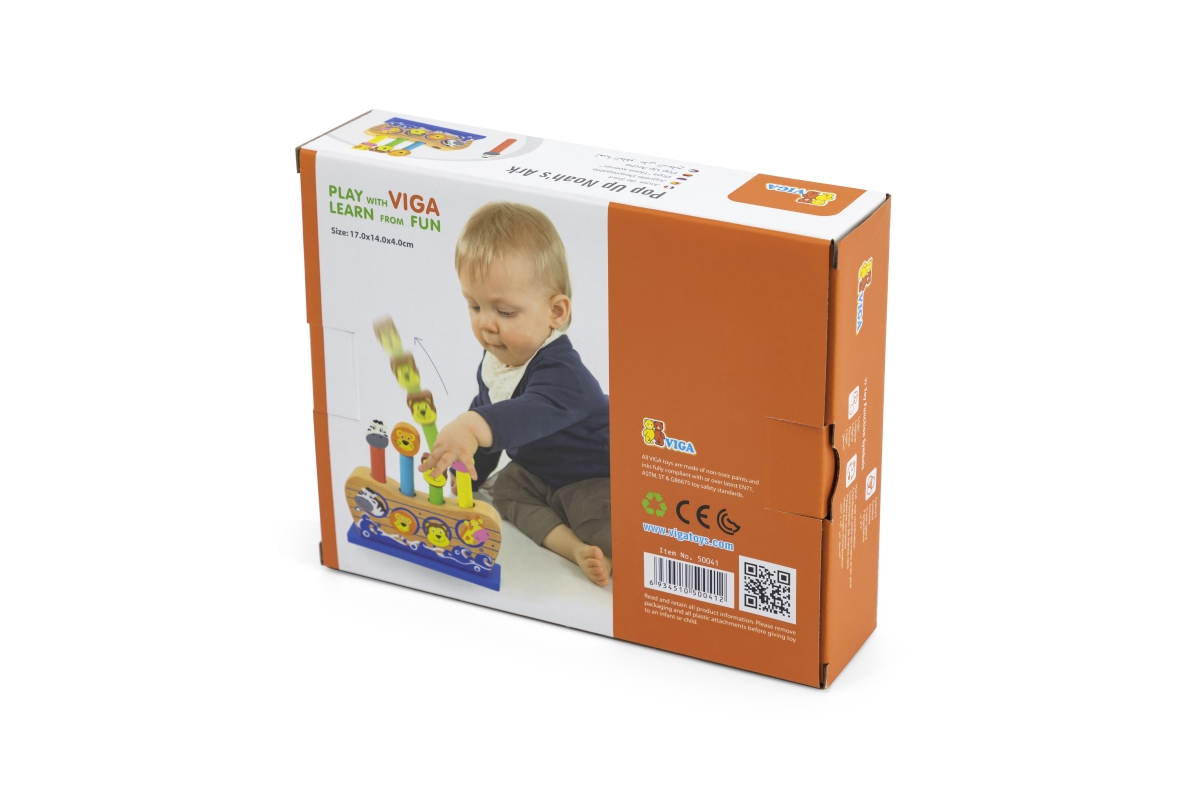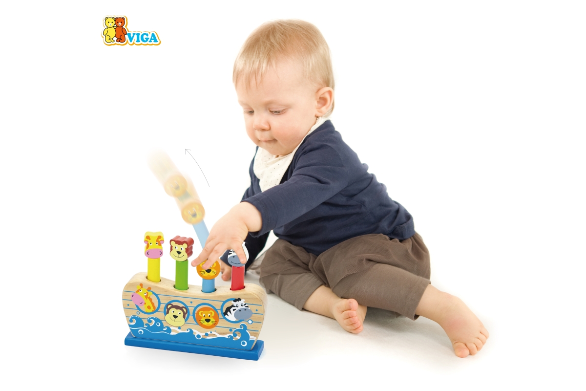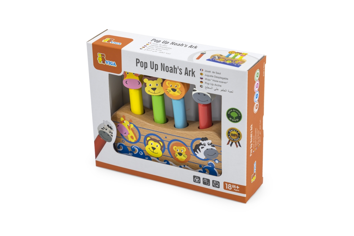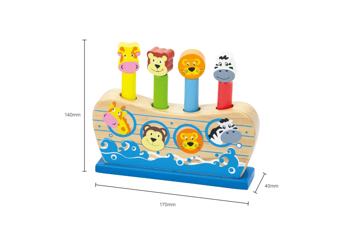 Dřevěná hra Noemova archa. Když dítě udeří do zvířátka, tak zvířátko vyskočí. Rozměry cca 17 x 14 x 4 cm. Rozměry balení cca 21 x 17 x 5,5 cm. Věk 18m..