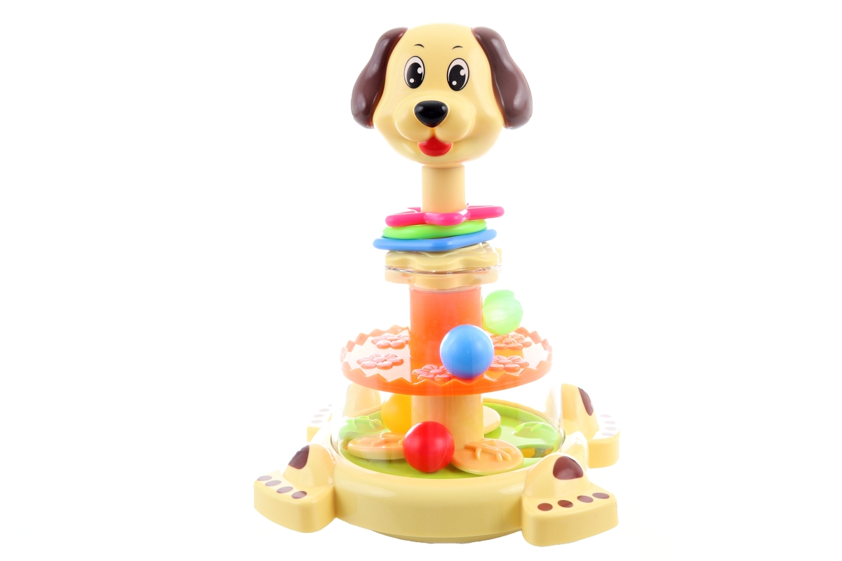 Hračka pro nejmenší děti. Rozvíjí jemnou motoriku. Jemný, zatlačením na hlavu pejska se roztočí níže dílky s kuličkami. Materiál plast. Baleno v krabi..