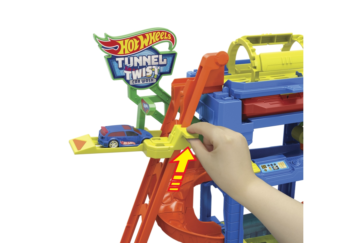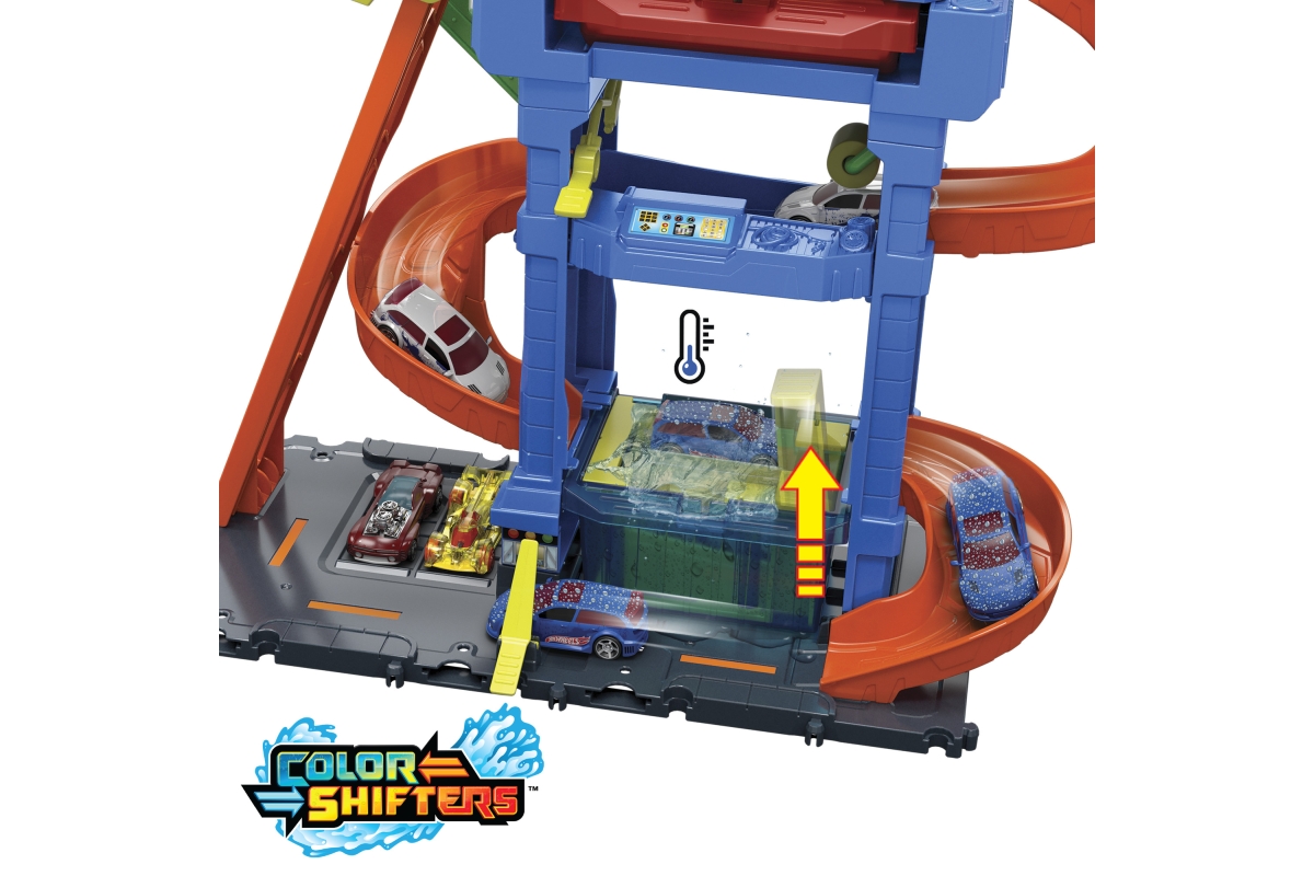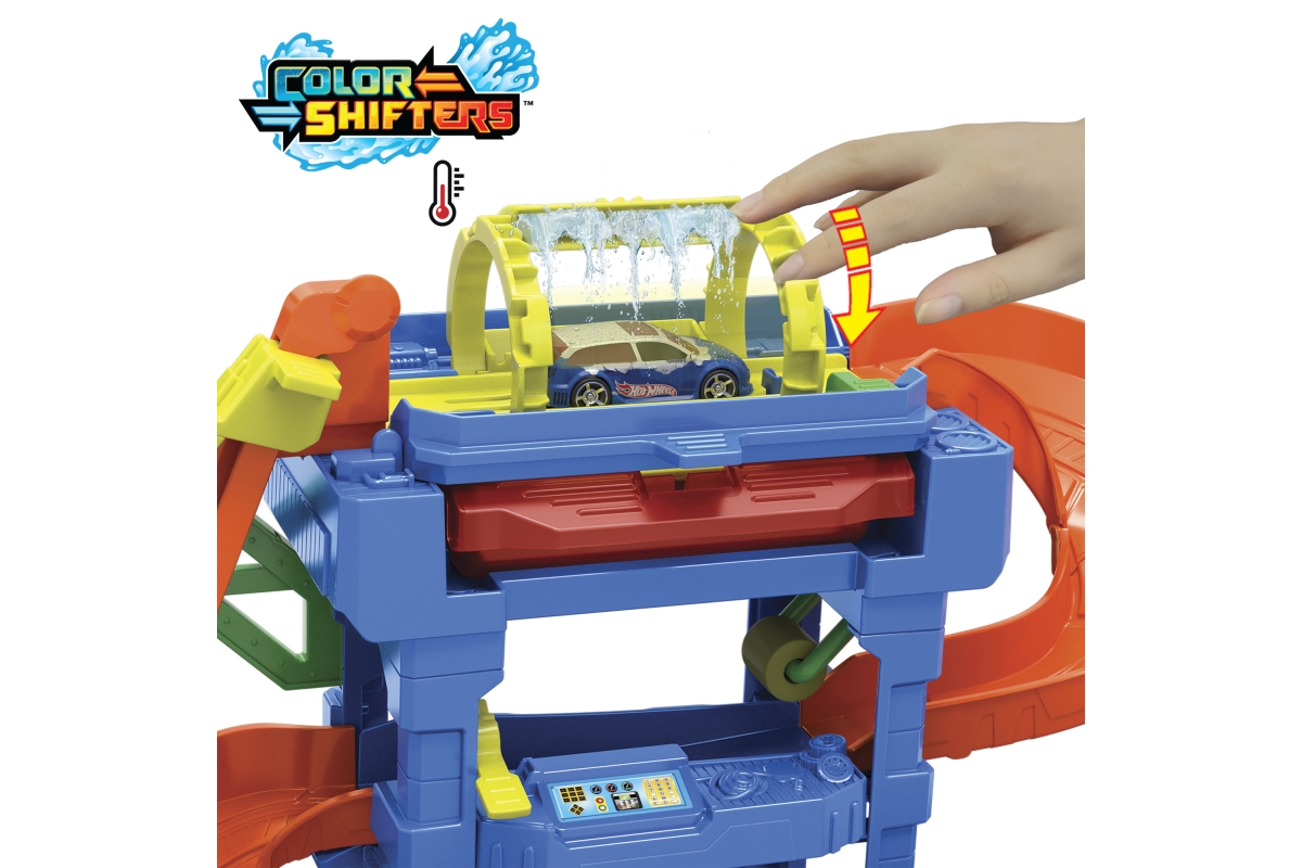 Automyčka Hot Wheels s otočným tunelem dodává akci měnících se barev s inovativním tunelem stříkajícím vodu! Děti dojedou s autíčkem Hot Wheels Color Shifter ke vchodu, odkud vyjedou výtahem ovládaným dětmi do horního patra. Vjeďte do otáčejícího se umývacího tunelu, kde se auto polije velmi teplou vodou, a uvidíte, jak se jeho dekorace okamžitě změní! Sjeďte po rampě dolů přes pěnový válec a vyjeďte do vysavače, abyste dokončili úpravu detailů. Nakonec vjeďte do stanice s ledovou vodou, kde se změní dekorace vozu do původních barev. Opakujte znovu a znovu. Barvy a provedení dekorací se mohou lišit. Věk 3+