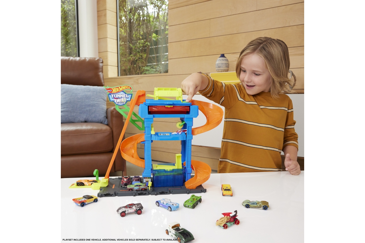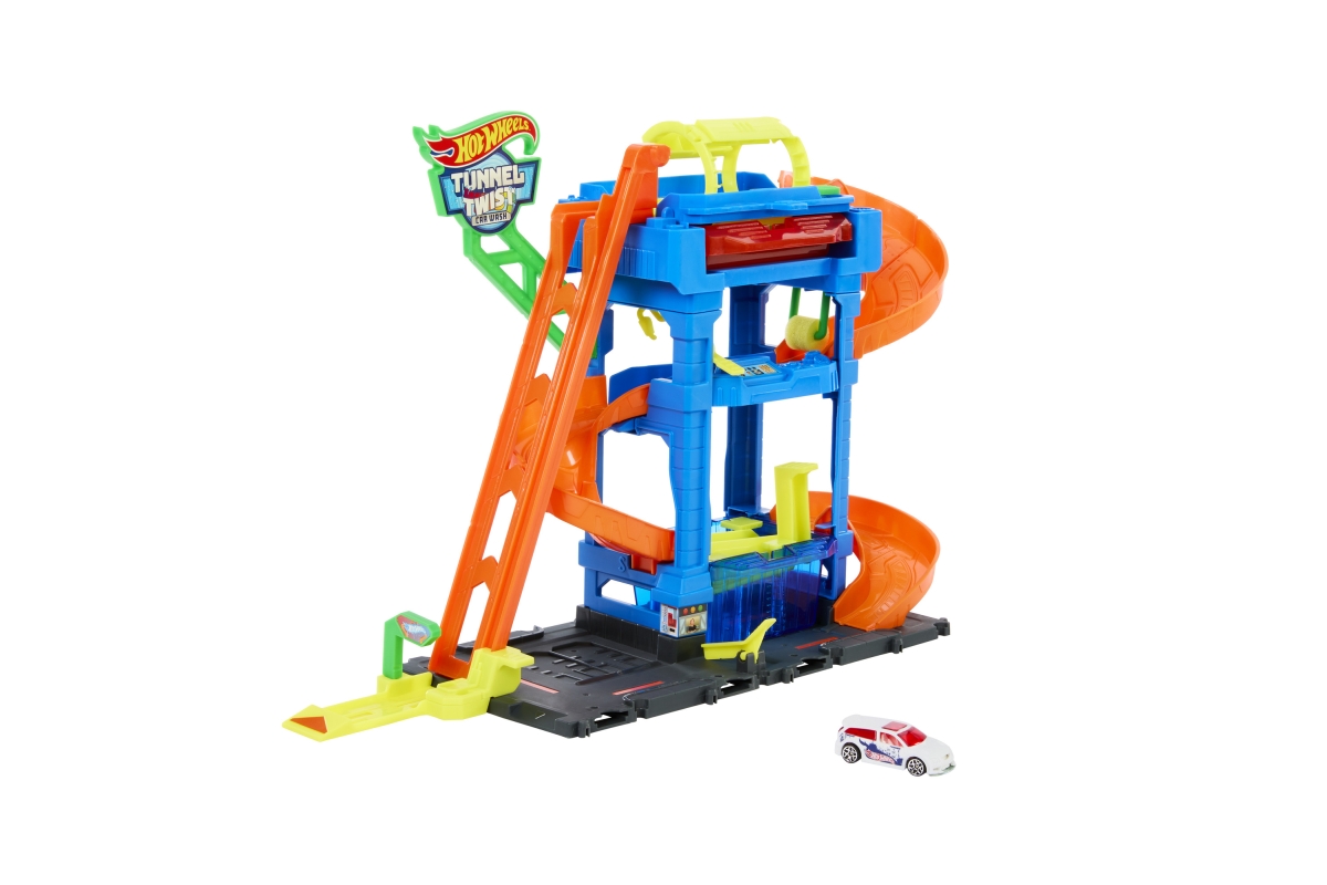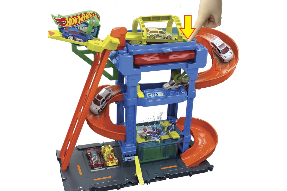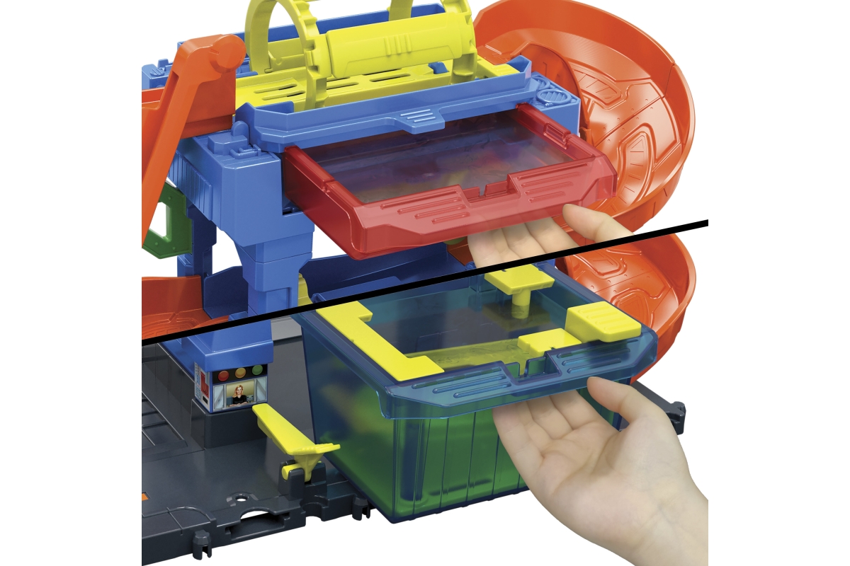 Automyčka Hot Wheels s otočným tunelem dodává akci měnících se barev s inovativním tunelem stříkajícím vodu! Děti dojedou s autíčkem Hot Wheels Color Shifter ke vchodu, odkud vyjedou výtahem ovládaným dětmi do horního patra. Vjeďte do otáčejícího se umývacího tunelu, kde se auto polije velmi teplou vodou, a uvidíte, jak se jeho dekorace okamžitě změní! Sjeďte po rampě dolů přes pěnový válec a vyjeďte do vysavače, abyste dokončili úpravu detailů. Nakonec vjeďte do stanice s ledovou vodou, kde se změní dekorace vozu do původních barev. Opakujte znovu a znovu. Barvy a provedení dekorací se mohou lišit. Věk 3+