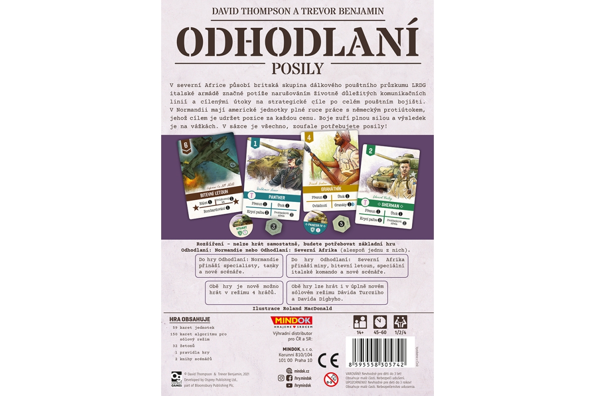 Odhodlaní: Posily je modulární rozšíření pro válečné deskové hry Odhodlaní: Normandie a Odhodlaní: Severní Afrika, které přináší nové možnosti, jednotky a scénáře na bojiště druhé světové války. Přeneste se do severní Afriky, kde britská LRDG narušuje italské komunikační linky, nebo do Normandie, kde americké jednotky čelí německým protiútokům. Toto rozšíření prohlubuje strategické možnosti a nabízí nové způsoby, jak si hru užít. Rozšíření Posily zavádí do hry tanky s novými pravidly pro útoky a obranu, specialisty s unikátními bojovými akcemi a miny, které dokáží zvrátit průběh bitvy. Objevte nové herní moduly, jako je „Pancíře a výzbroj“ pro tanky, „Pod příkrovem noci“ pro miny a noční boj, „Palba do vlastních řad“ pro realistické vyhodnocování zranění a ztrát, a „Společnými silami“ pro hru ve dvou týmech po dvou hráčích. Nechybí ani kompletně nový sólový režim, který vám umožní hrát proti virtuálnímu soupeři v jakémkoli dosud vydaném scénáři. 1-4 hráči. Věk 14+