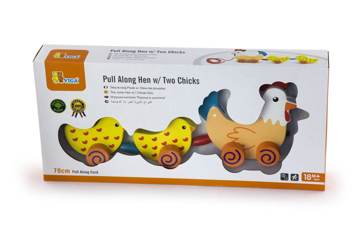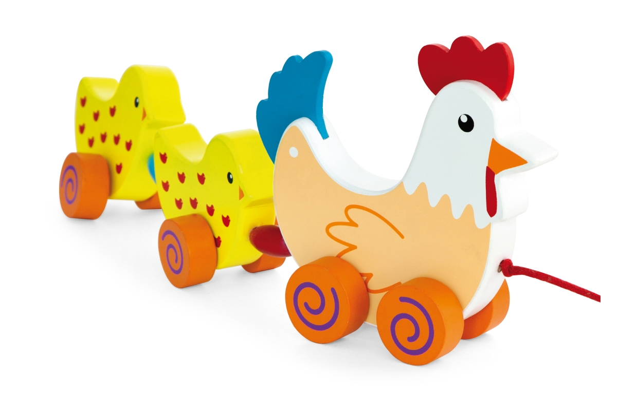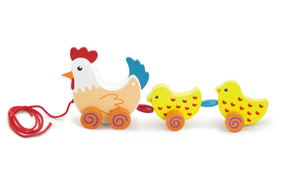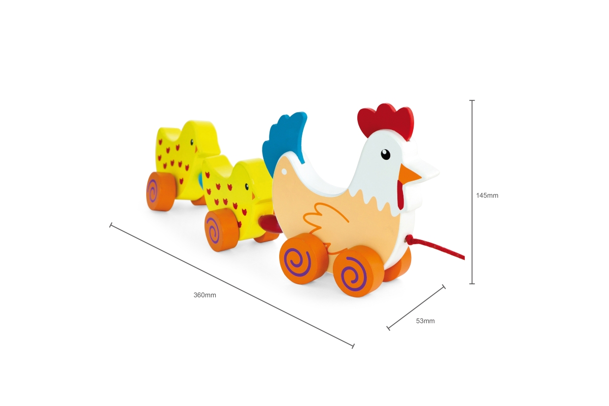 Dřevěná tahačka slepička s kuřátky. Rozměry hračky cca 36 x 14,5 x 5,5 cm. Rozměry balení cca 42 x 6,5 x 19,5 cm. Věk 18m+..
