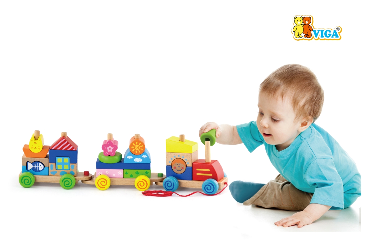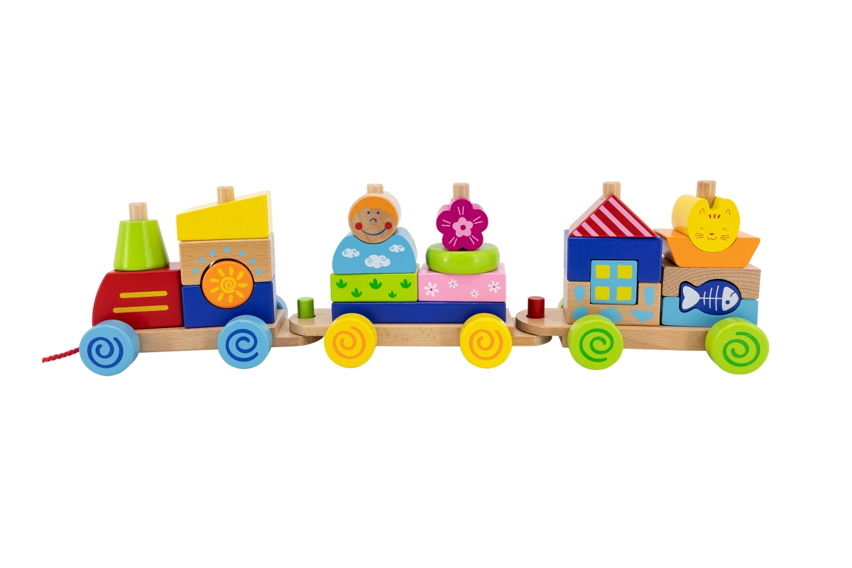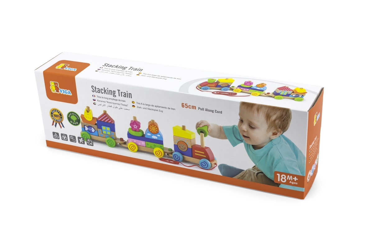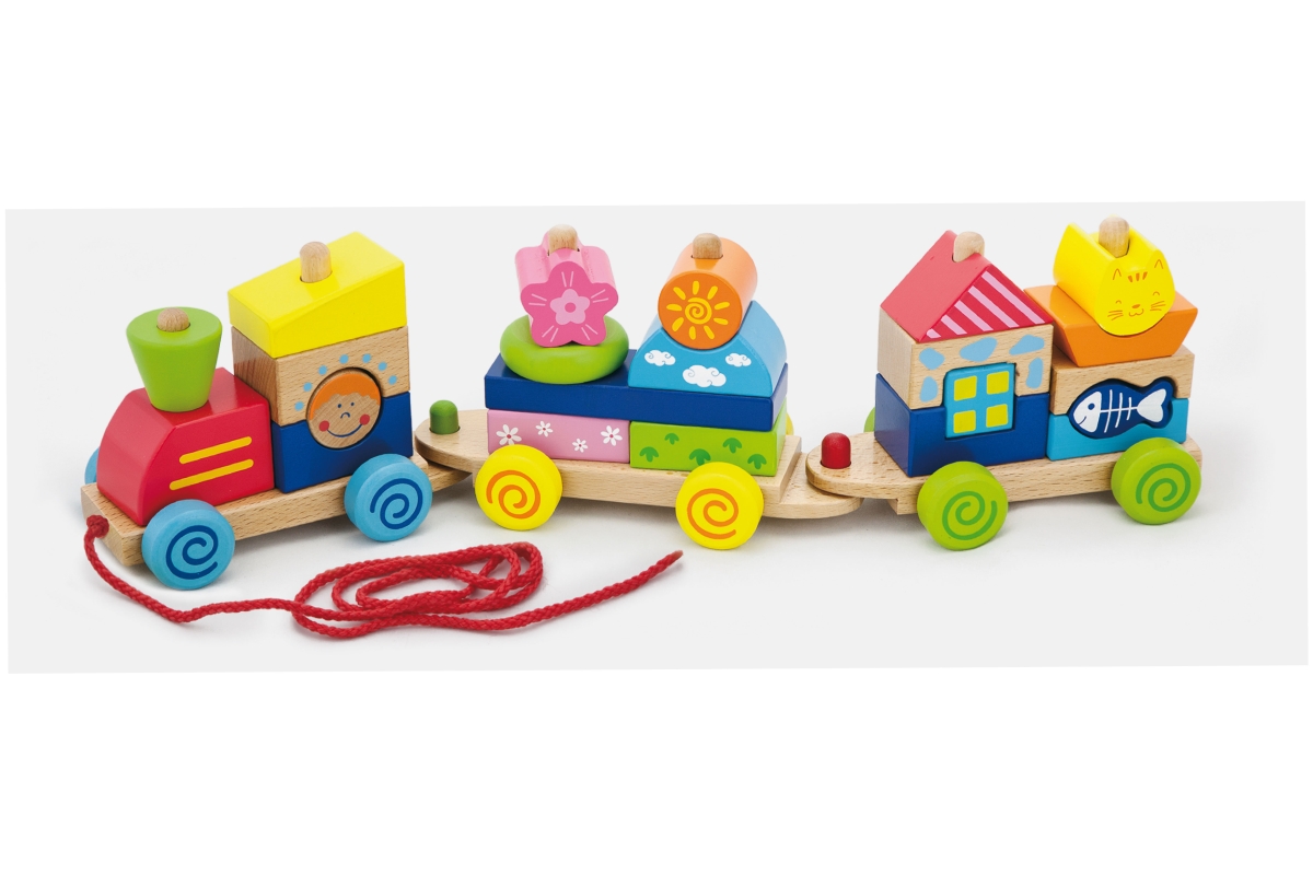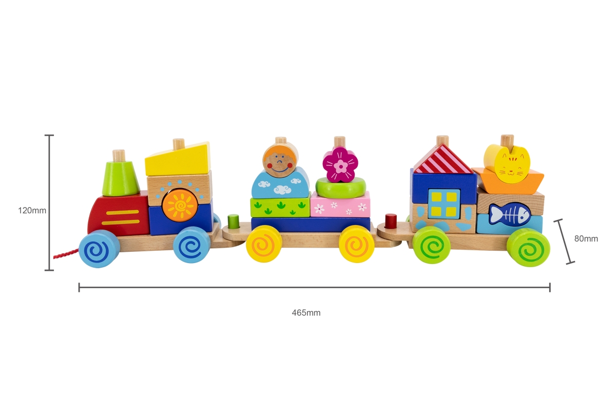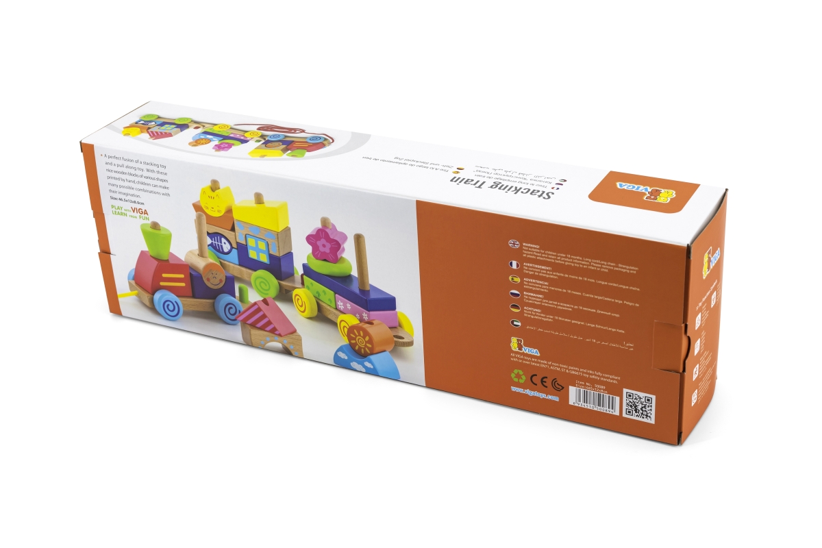 Dřevěná mašinka - skládačka a tahačka o rozměru cca 46,5 x 12 x 8 cm. Rozměry balení cca 47 x 15 x 9 cm. Věk 18m+..