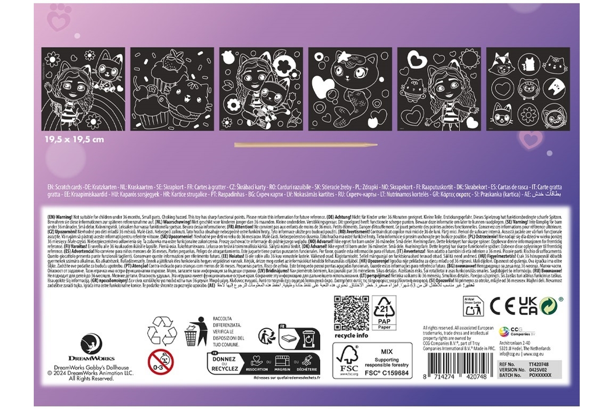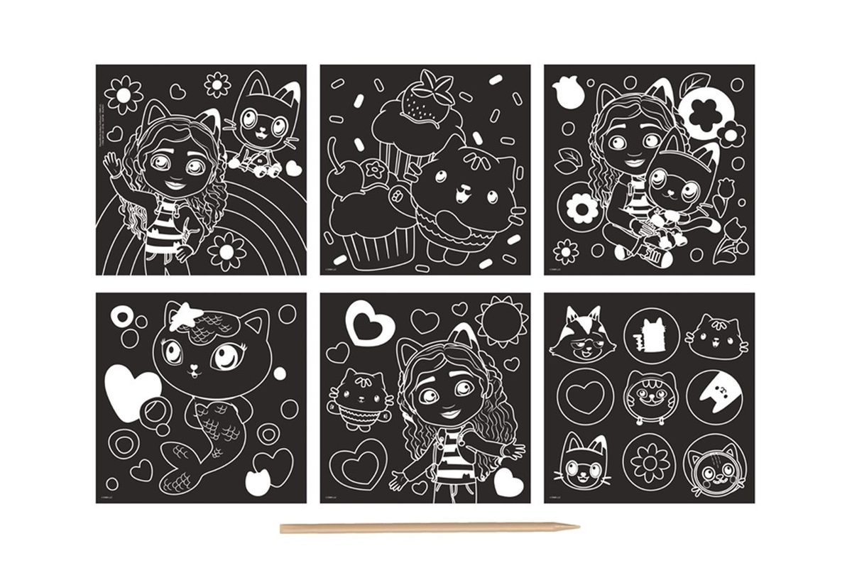 Vyškrabovací obrázky s motivem postaviček z pohádky Gábinin kouzelný domek. V balení 6 obrázků o rozměrech 19,5x19,5 cm a dřevěné vyškrabovací pero. V..