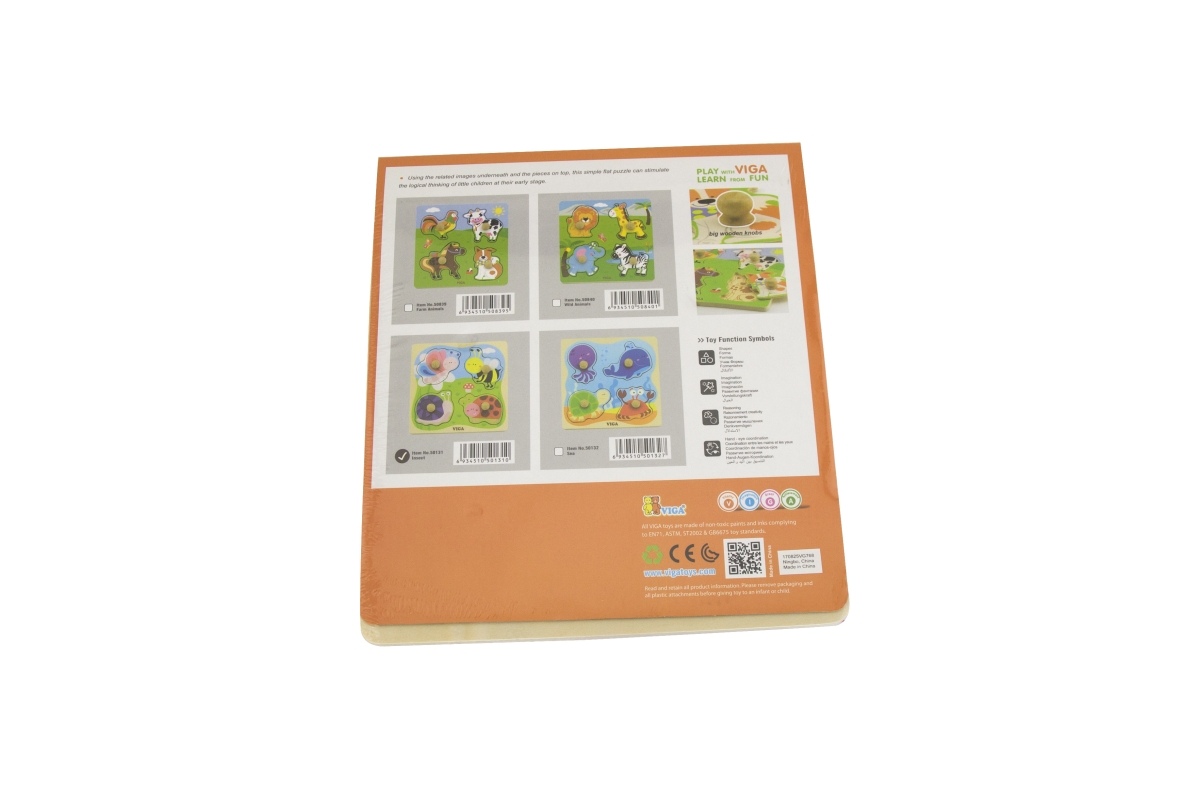 Dřevěná vkládačka se zvířátky. Rozměry dřevěné desky cca 22 x 22 cm x 1 cm,kde jsou umístěny 4 druhy zvířátek s úchyty. Věk 18m+..
