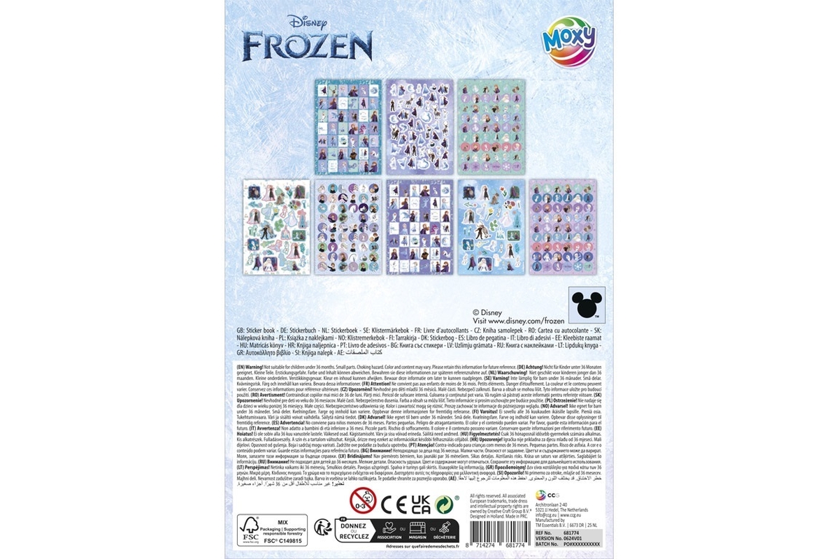 Třpytivé samolepky s motivem postaviček z pohádky Ledové království. V sešitu 8 archů. Rozměry 15x21 cm. Věk 3+..