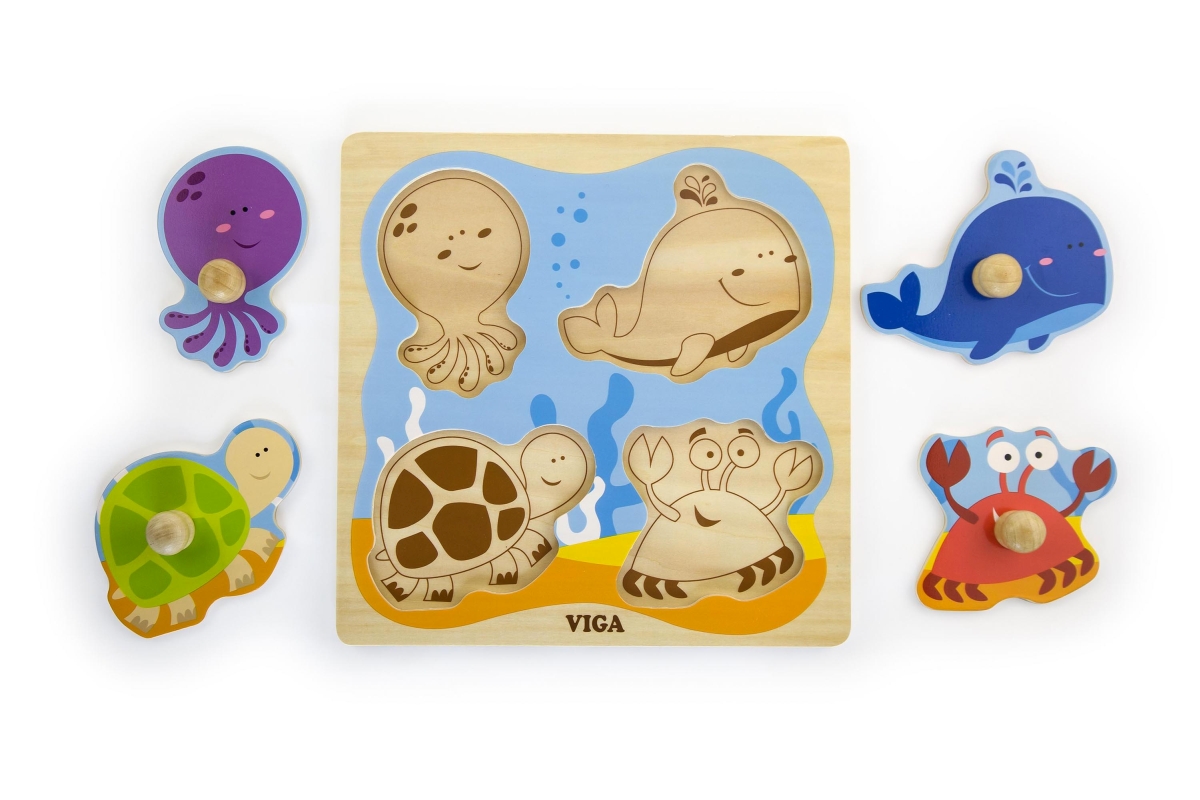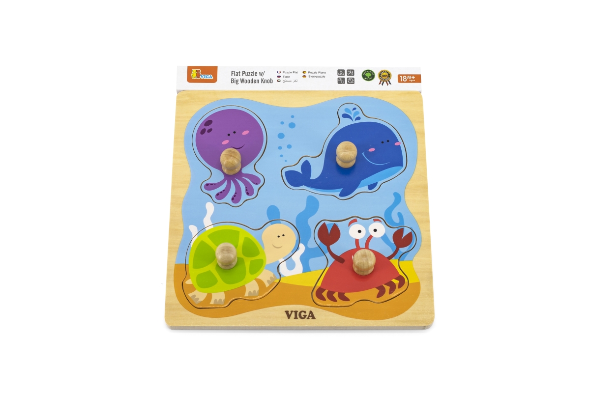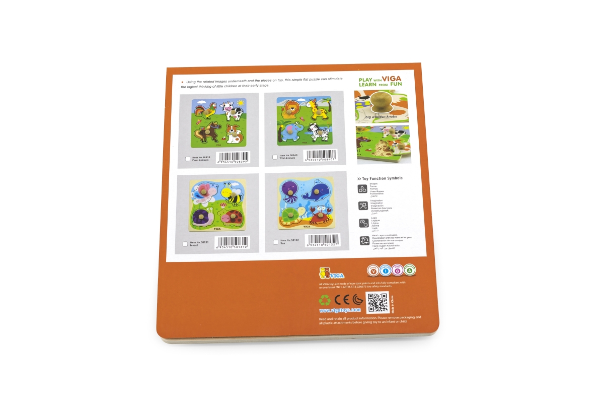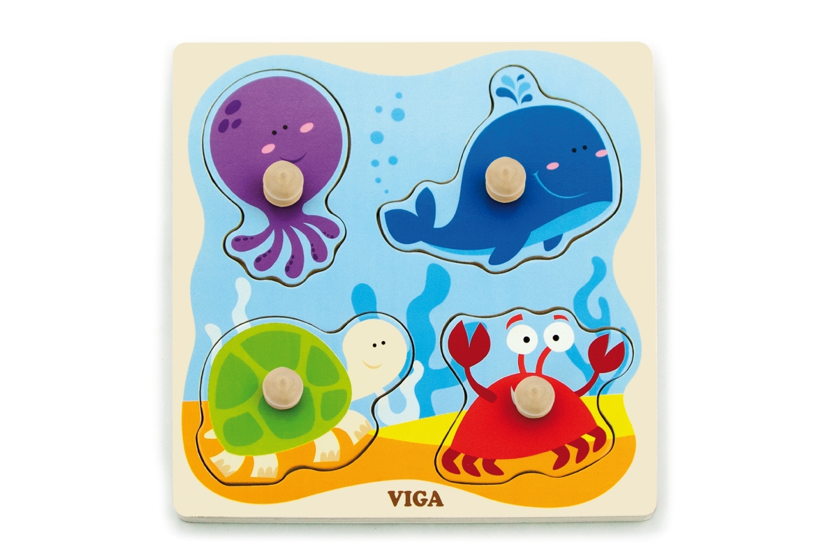 Dřevěná vkládačka se zvířátky. Rozměry dřevěné desky cca 22,5 x 22,5 cm x 1 cm,kde jsou umístěny 4 druhy zvířátek s úchyty. Věk 18m+..