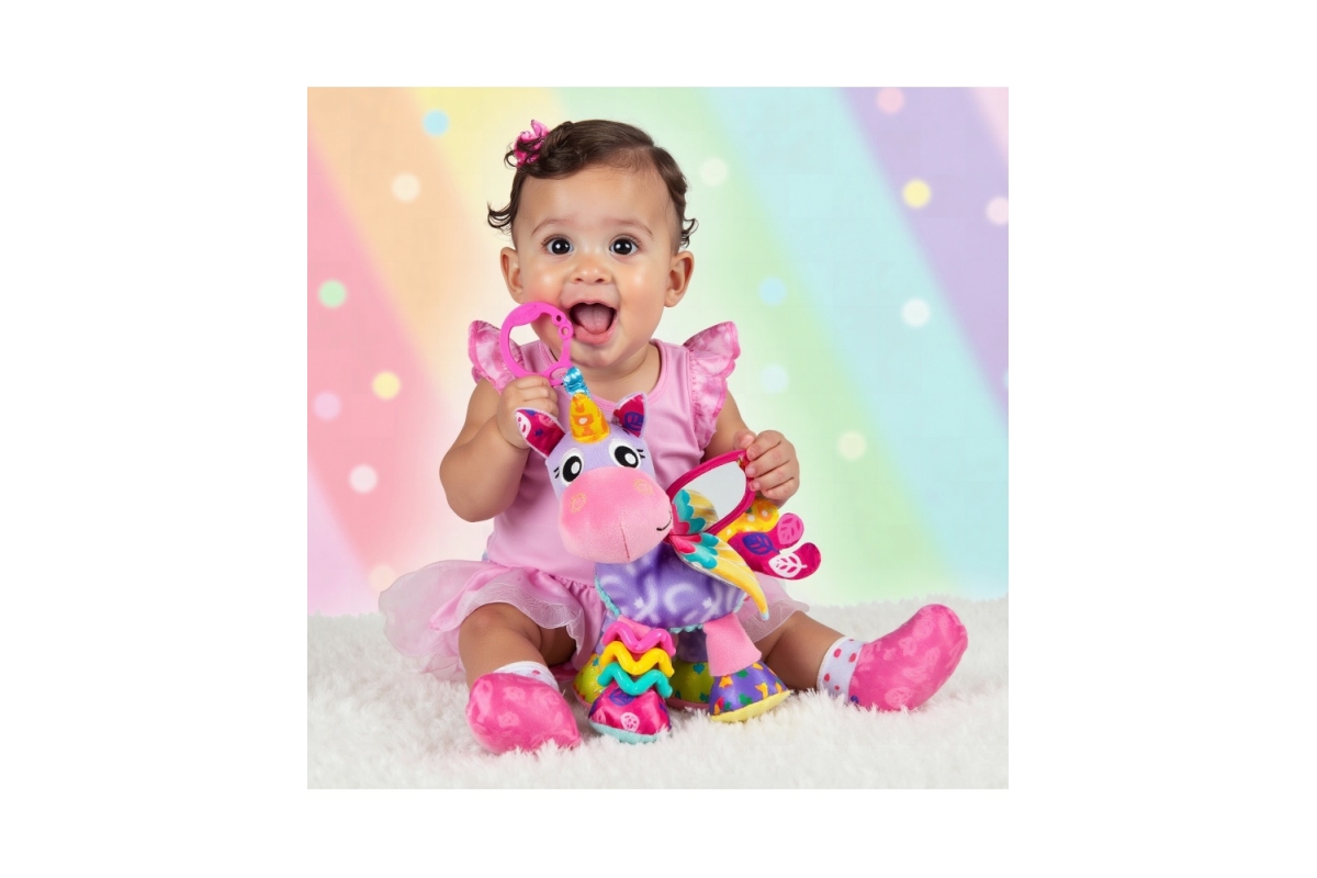 Playgro – Jednorožec Stella je kouzelná hračka pro miminka, která podporuje rozvoj smyslů a nabízí spoustu podnětů k objevování. Má měkkou hlavičku a zrcátko na křídle, které podporuje sebeobjevování. Lesklý roh, stříbrné křídlo a vrstvený ocas lákají k prozkoumávání. Chrastící nožka, šustící ouška a nožičky, cinkající kroužky a hebké látky stimulují zrak, hmat a sluch. Měkké žebrované bříško a kontrastní vzory rozvíjejí hmatové a vizuální vnímání. Díky „C“ klipu lze Stellu snadno připnout na kočárek, autosedačku nebo postýlku, takže je vždy nablízku. Hračka je bezpečná, kvalitní a vhodná od narození. Stella je magická kamarádka, která zabaví, uklidní a pomáhá dítěti objevovat svět.