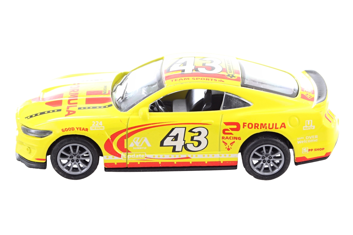 Kovové závodní auto na zpětný chod. Rozměry auta cca 10x4x3 cm. Rozměry balení cca 15x8x6 cm. Věk 3+..