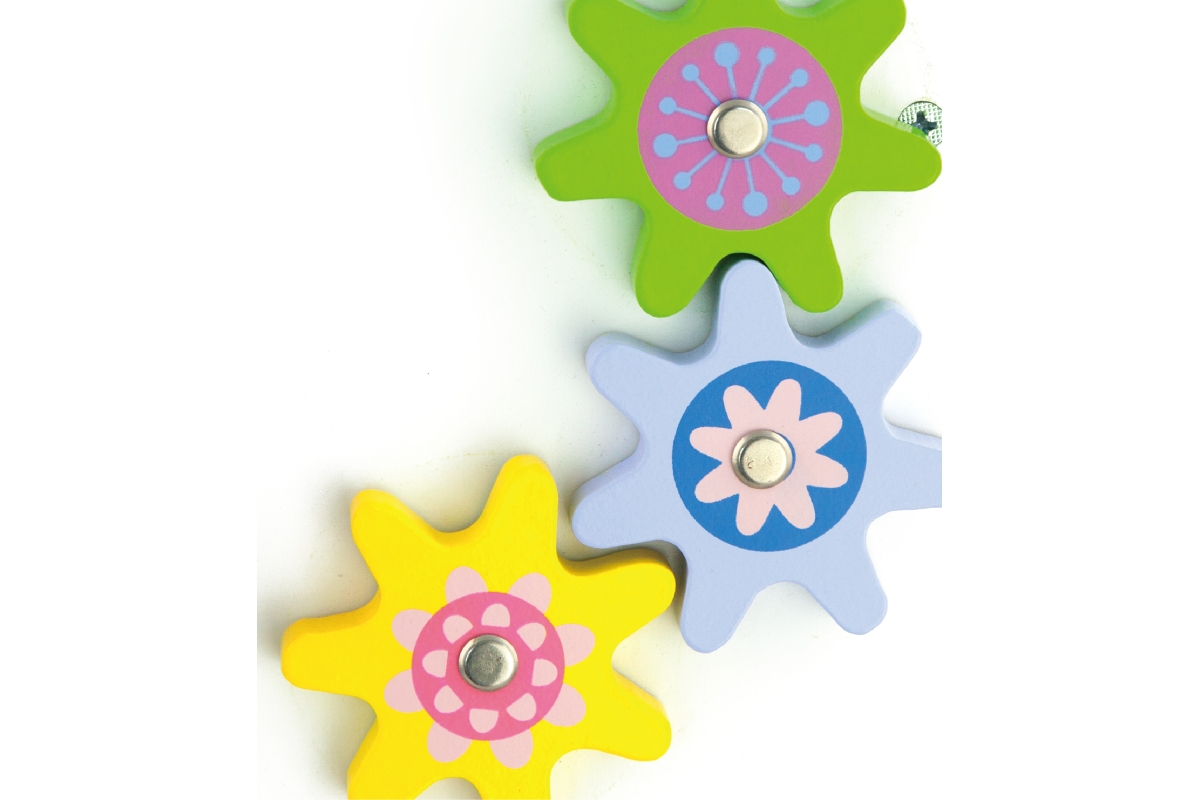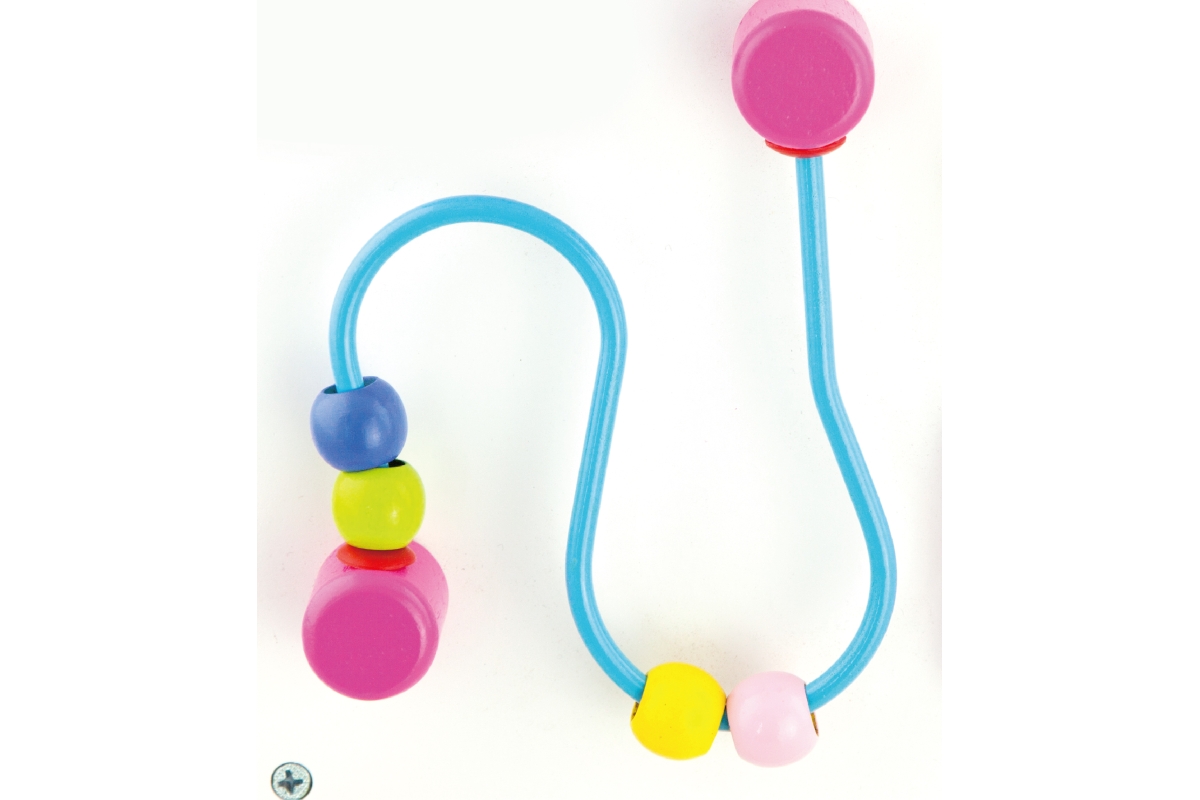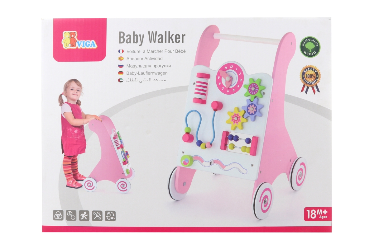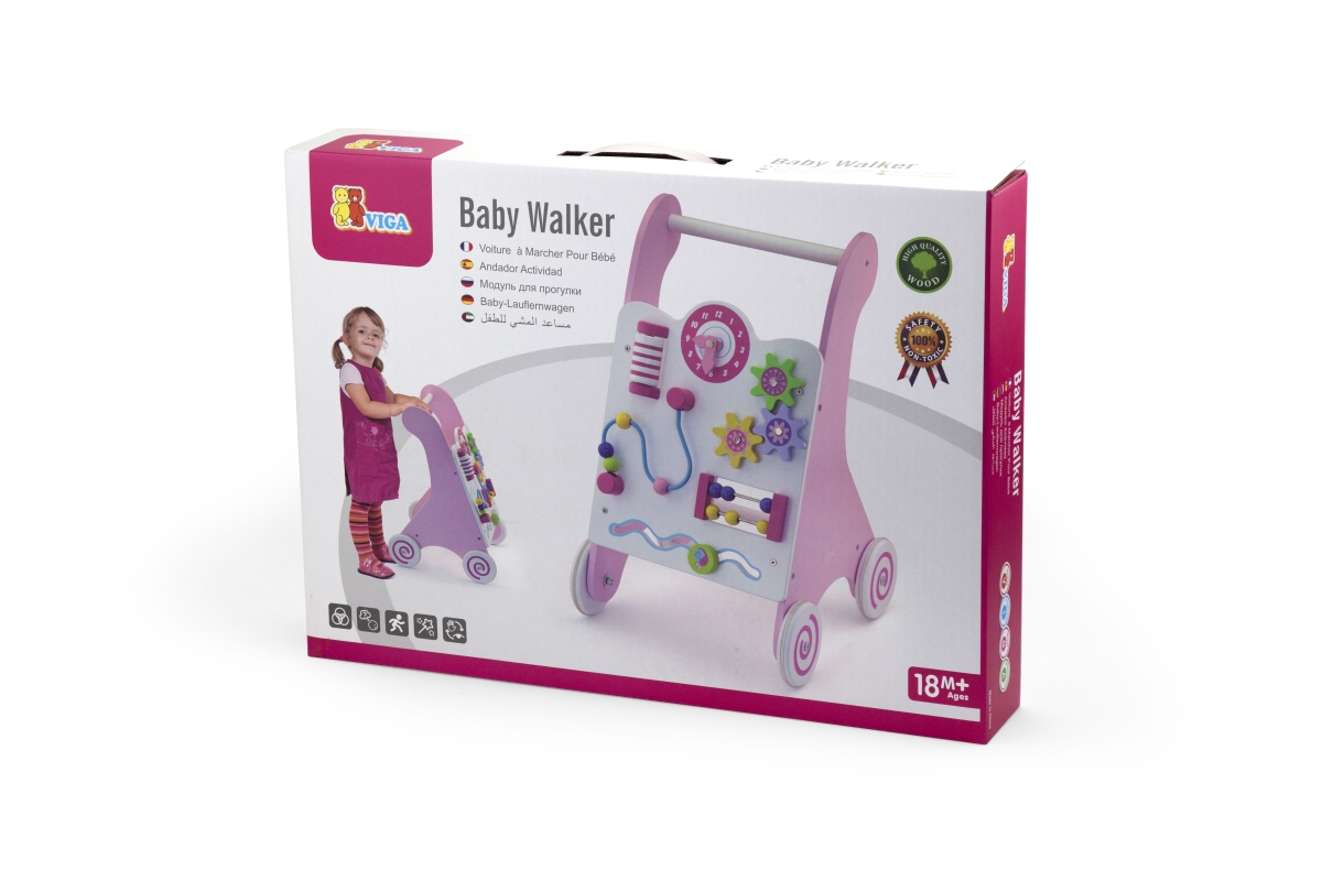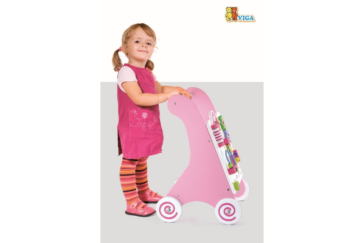 Dřevěné chodítko s herními prvky pro rozvíjení dětské chůze a motoriky. Rozměry cca 30 x 48,5 x 34,5 cm. Obsahuje různé provlékačky, bludiště a otáčec..