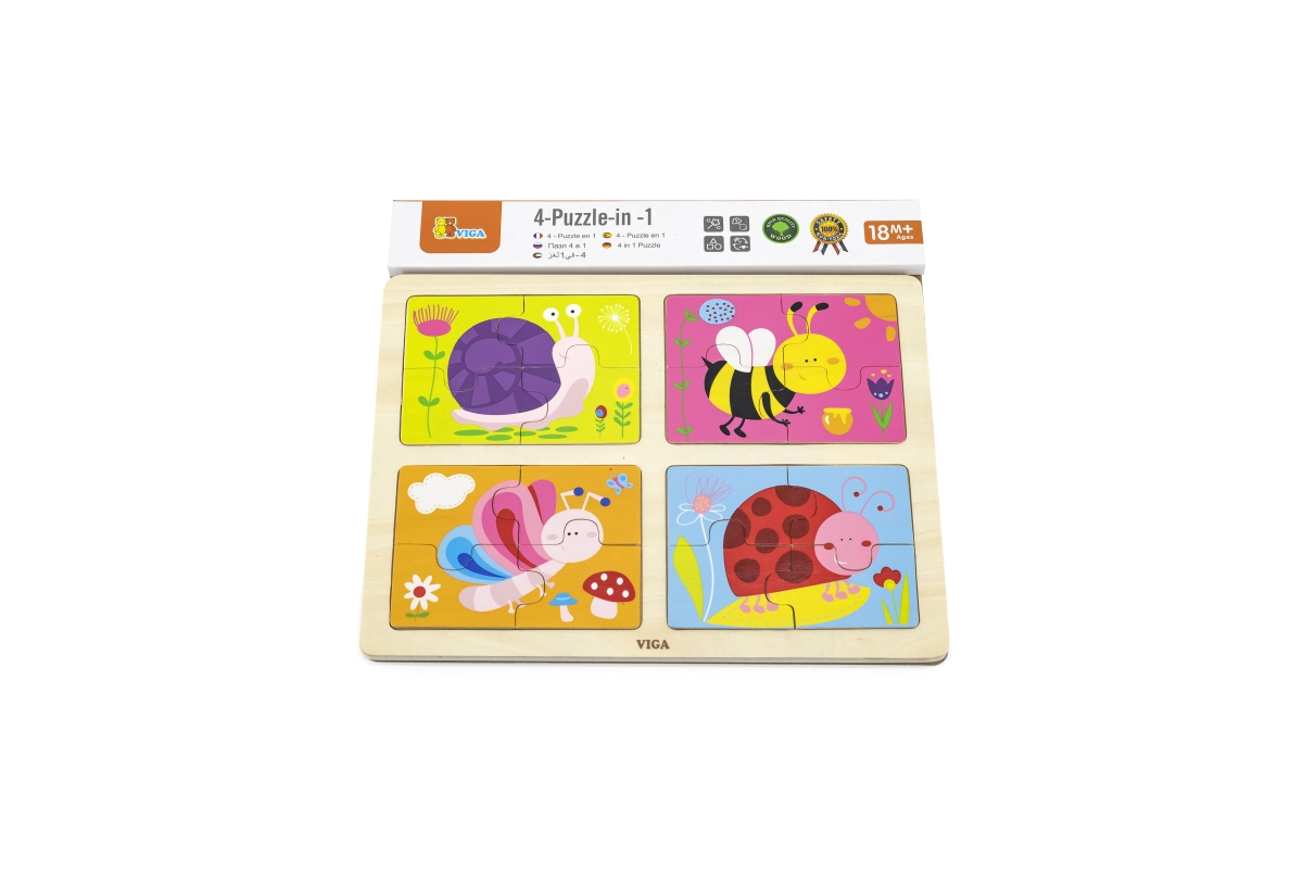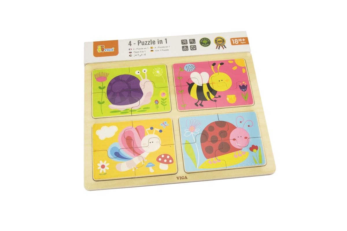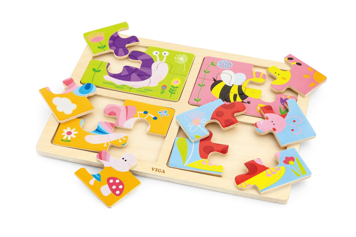 Dřevěné puzzle 4v1 s motivy hmyzu (šnek, včela, motýl a beruška). Balení obsahuje celkem 16 dílů. Rozměry balení cca 30 x 27 x 1 cm. Věk 18m+..